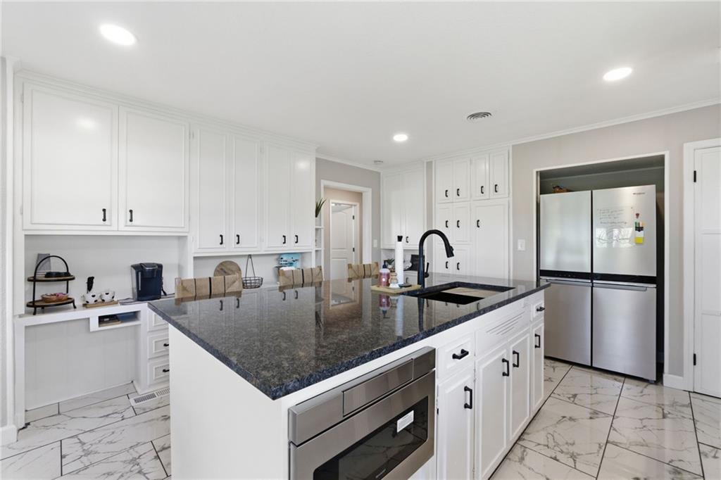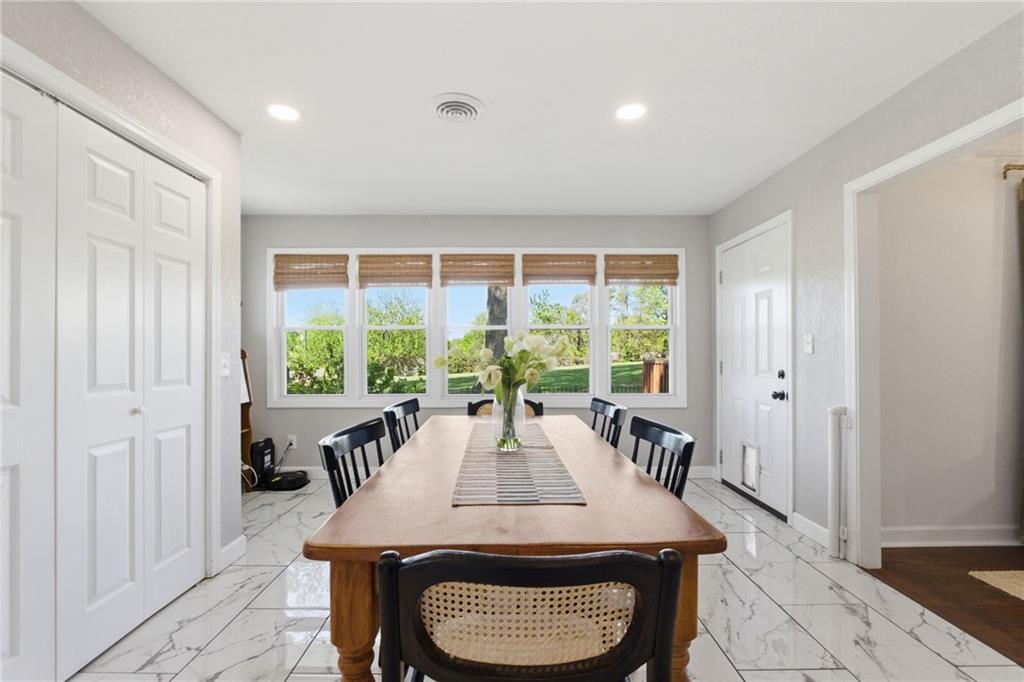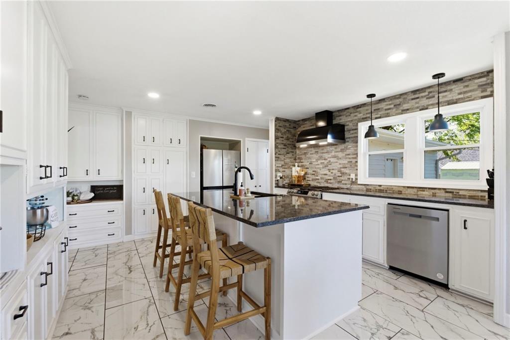 A rare find that doesn’t come around often, nearly 1.5 acres with an expansive ranch that gives you space, privacy, and a layout that just works! Set far back from the street with a circle drive and inviting front courtyard, it immediately feels quiet and tucked away with no close neighbors in sight. Each bedroom has its own dedicated full bathroom, a hard to find feature that makes this home stand out right away. The kitchen has been completely redone and is truly the heart of the home, featuring custom cabinetry, an oversized island, updated countertops, tile and backsplash, plus all new appliances including a gas range, drawer microwave, and hood, all opening into a light filled main living space. Natural light pours in and there is no shortage of room to spread out with multiple living areas throughout. Step outside and you have three separate outdoor living spaces ready for spring and summer, including a deck and patio, along with newly added evergreen trees that create even more privacy! Nearly every major system has been updated including roof, HVAC, furnace, windows, and deck all in 2022, along with thoughtful upgrades like new lighting, interior and exterior paint, electrical and plumbing updates, rebuilt sheds, landscaped circle drive, and a fenced front courtyard. All of this just minutes from shopping, restaurants, highways, parks, and the elementary school, giving you space to breathe while still being close to everything!