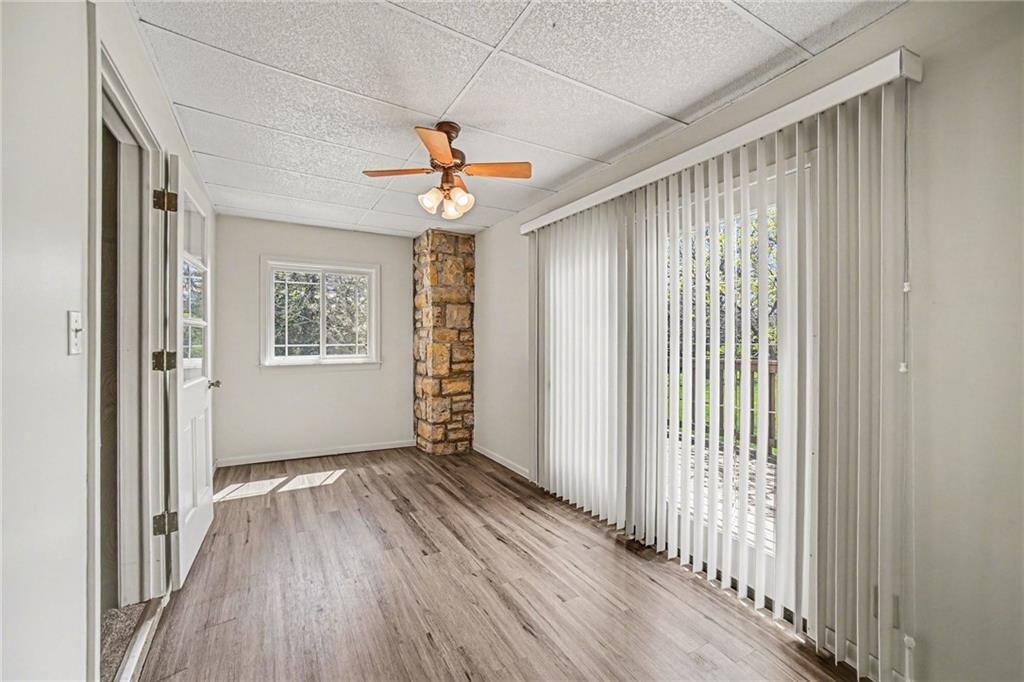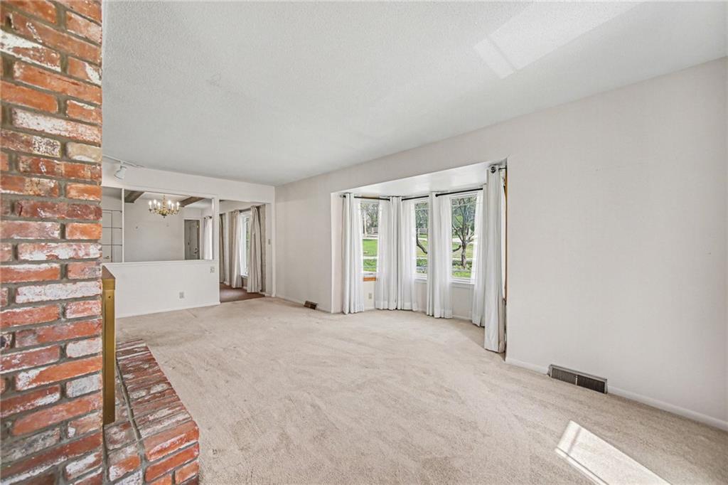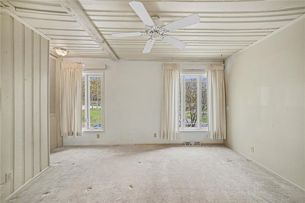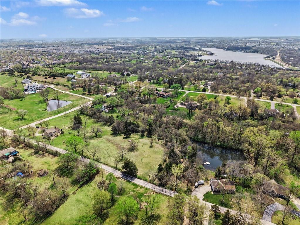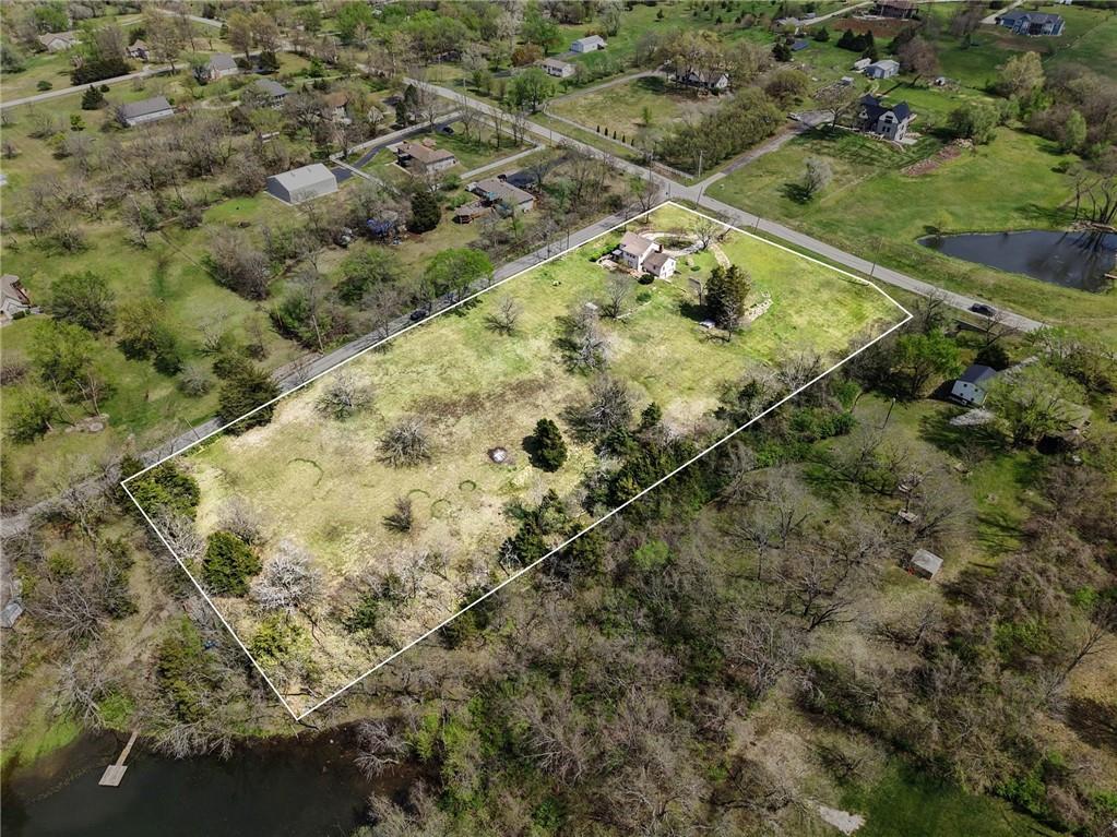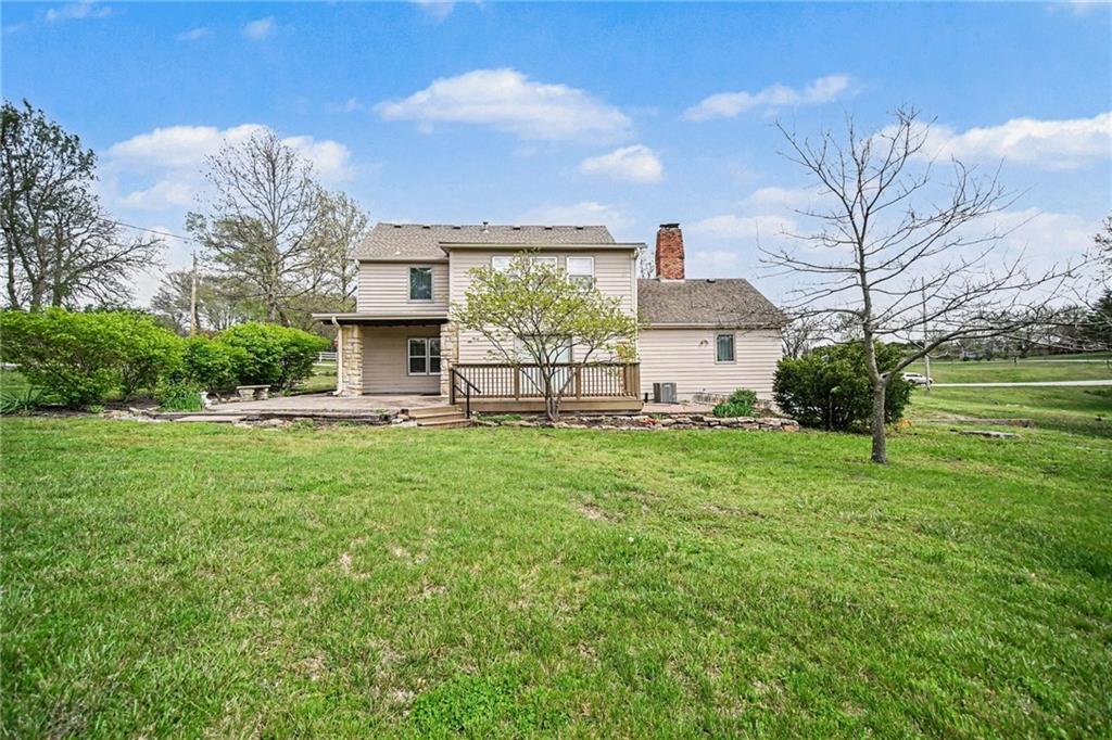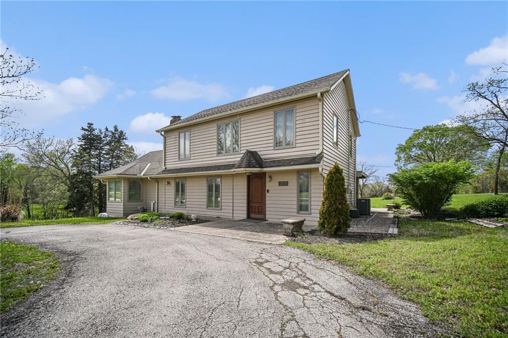 Spacious 2 Story home set on nearly 4.5 picturesque acres in Olathe! The main level features a convenient bedroom and full bath. This unique floor plan also has a large living room and family room with a see-through fireplace. The kitchen and dining room both have stunning wood beams. Nice sunroom or sitting room off the kitchen leading to the patio and deck. The second floor has three bedrooms, a sitting room, and a full bath. Newer HVAC. Tons of potential in this great home or an amazing lot to build your dream home. Perfect location close to schools, shopping, Olathe Lake, and Cedar Niles Park.