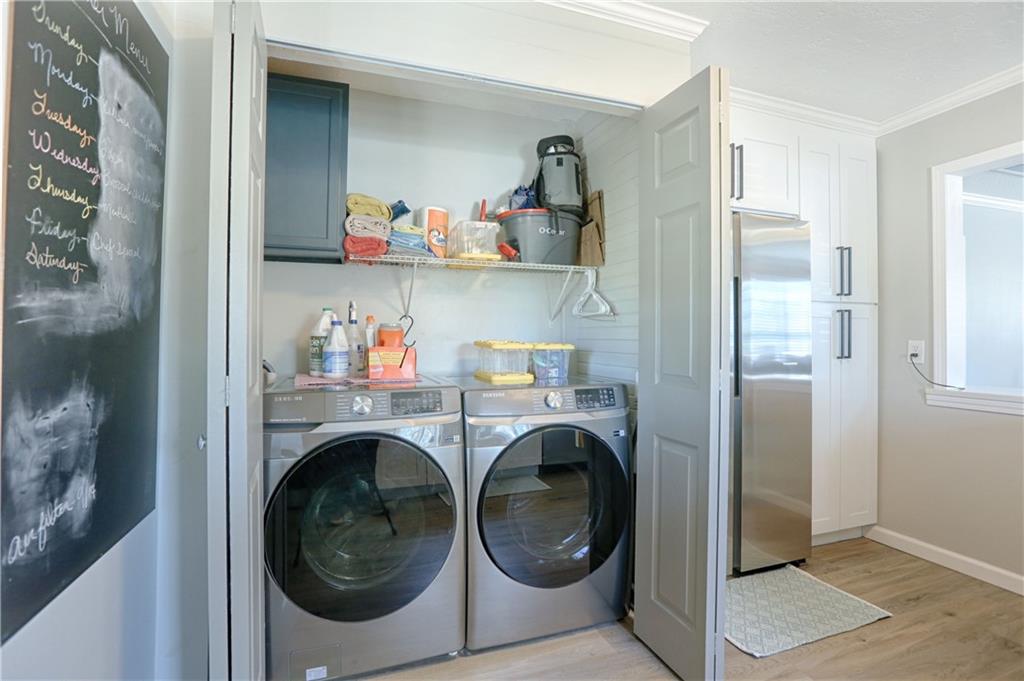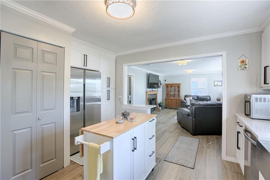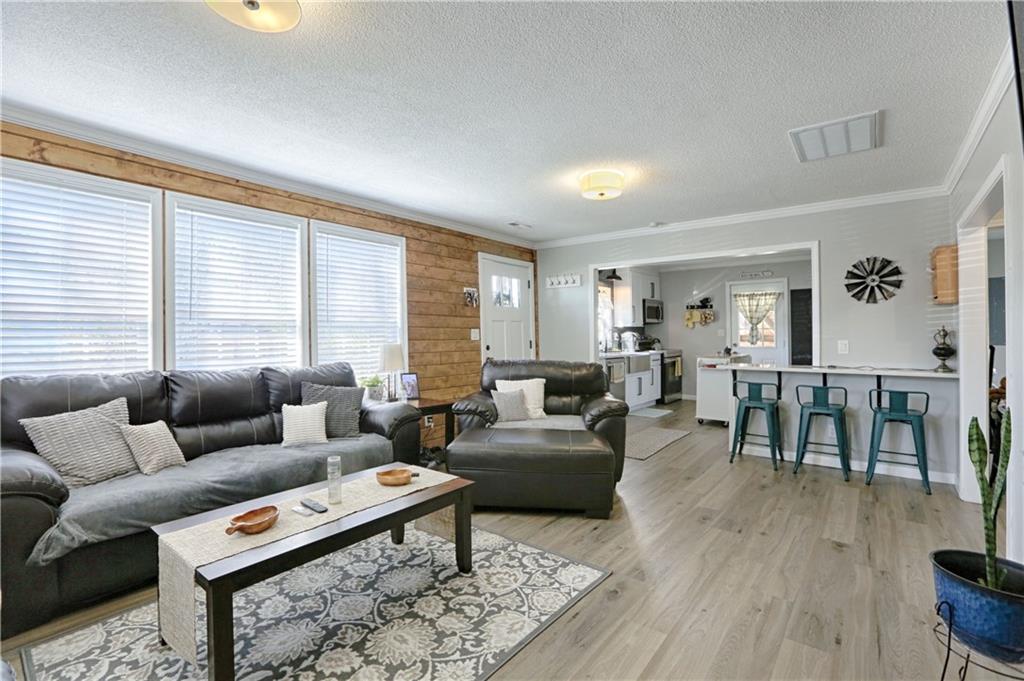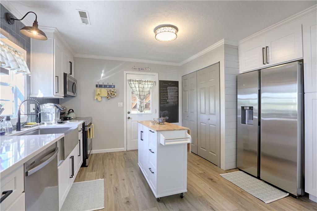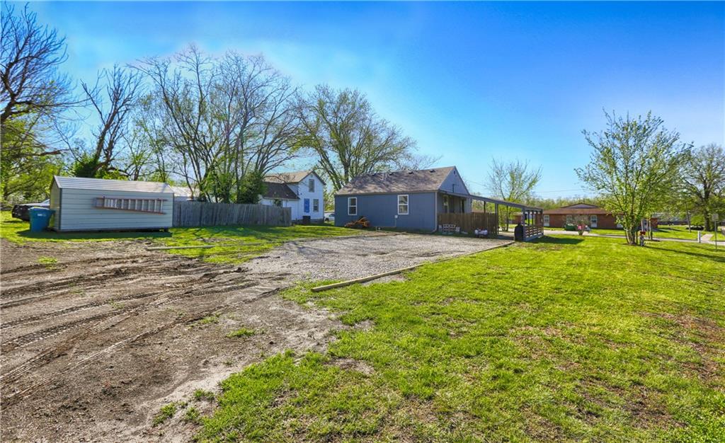 Recently renovated, this charming 2-bedroom, 1-bath home sits on a spacious corner lot(over a quarter of an acre) and features an oversized carport with additional parking behind the home. Updates include all new(er) siding, roof, gutters, doors, windows, HVAC, plumbing, and fully refreshed interior finishes. The kitchen is thoughtfully designed with extra-tall, soft-close cabinetry, quartz countertops, tile backsplash, open shelving, a built-in pantry, large stainless steel sink and bar seating. Stainless steel appliances complete the space. The open-concept living area is filled with natural light and features a cozy built-in fireplace. Durable, waterproof luxury vinyl flooring runs throughout the main living spaces for easy maintenance. The bathroom offers generous space and additional storage, while both bedrooms include carpet, ceiling fans and window treatments. All window treatments are included. Outside, the oversized carport doubles as an inviting entertaining space with an attached deck and ample sized shed for additional storage. The large corner lot is conveniently located near the Flint Hills Trail and a nearby sports complex. Don’t miss the opportunity to make this move-in-ready home yours—schedule a showing today!
