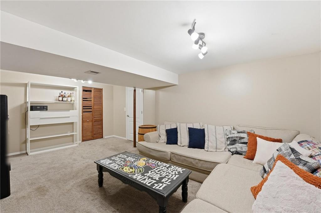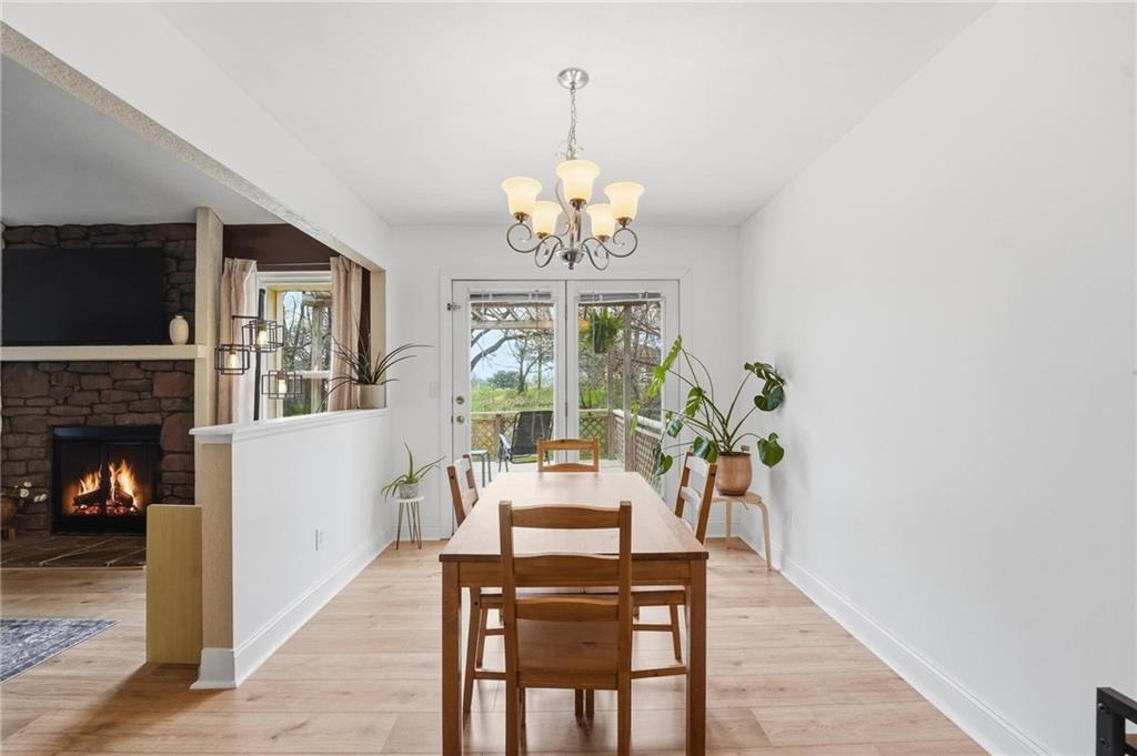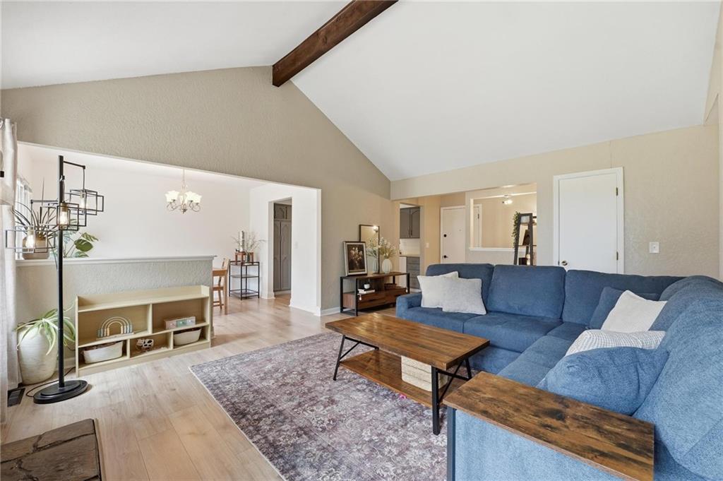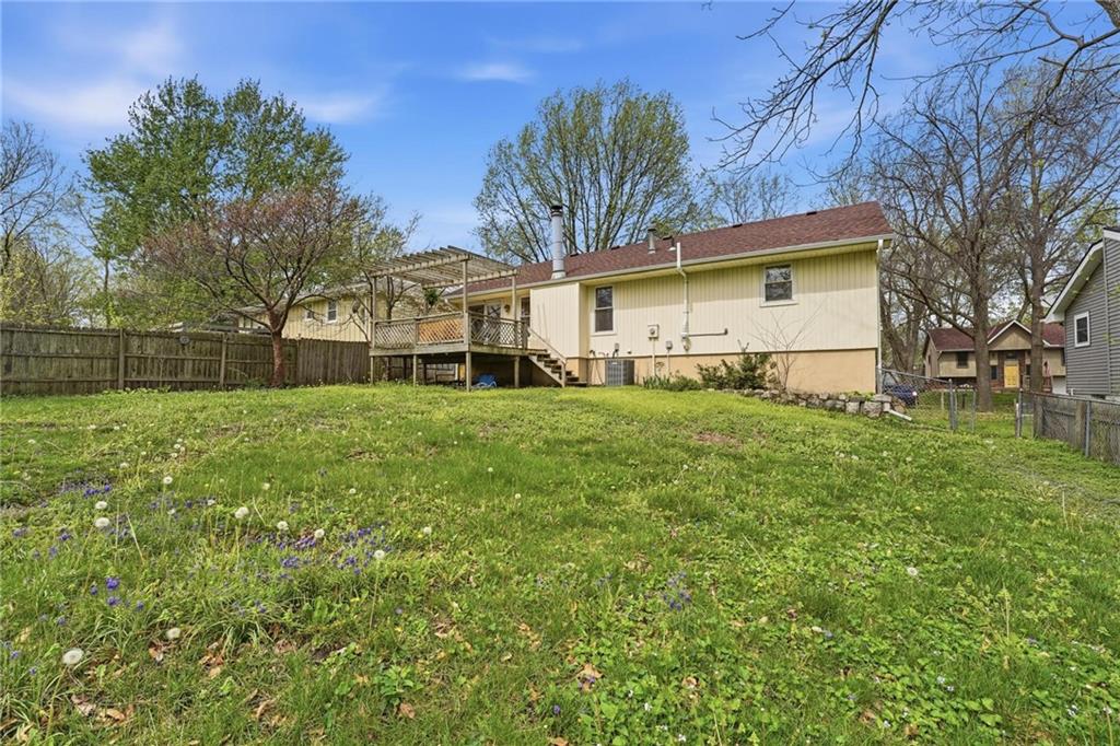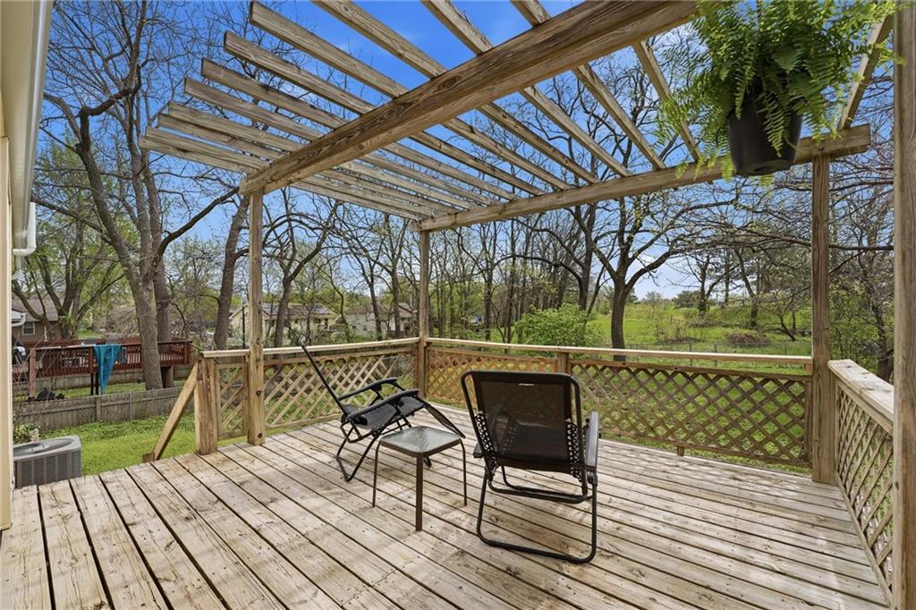 This stunning raised ranch home has been beautifully updated with modern luxury vinyl plank flooring, new carpeting, a new roof, a tiled primary bathroom shower, and fresh paint throughout. Upon entering, you'll notice the high ceilings and wooden beam accents that create a spacious atmosphere, warmly complemented by a charming stone fireplace. The layout seamlessly flows into a dining room featuring a back door that leads to the deck. The kitchen is equipped with ample cabinetry and smart counter space for all your culinary needs. Down the hallway, you will find a coat closet, linen closet, a full bathroom with a large vanity and a shower over the tub, and three cozy bedrooms at the end of the hall, each adorned with plush carpeting. The primary bedroom offers generous space and a stunning ensuite, complete with a new tiled shower, vanity, and mirror. The finished basement includes a recreation room and a laundry room with fantastic storage, including storage shelves that stay. The two car garage provides access to the basement, featuring space for a coat rack and additional storage behind the shutter doors in the recreation room. The back deck, accessible from the dining room via the back door, overlooks a fenced backyard that backs up to trees, creating a serene retreat. This home is situated in a quiet cul-de-sac within the North Kansas City School District, with Staley High School as the designated attendance school.