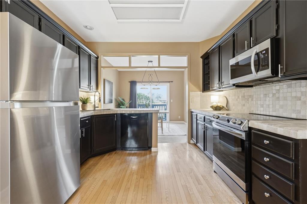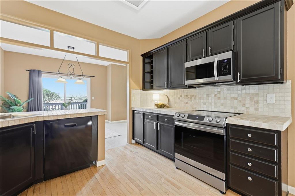 Nestled in the quiet, established community of Leawood Falls, this maintenance provided townhome offers a fantastic layout with large room sizes, high ceilings, and abundant natural light. The main level features a large entryway connecting garage, laundry, 1/2 bath and kitchen, in a very efficient floor plan. The living room, kitchen with breakfast nook and formal dining area have great views of the pond. The spacious living room offers double-height ceilings and feature a fireplace. The second story provides a sprawling primary suite with high ceilings and gorgeous pond views. This well maintained home is a pristine blank canvas ready for your personal touches. The second suite also has high ceilings, walk-in closet and full bathroom with tub/shower combo. The 2-car garage is wide and long to fit most vehicles and some additional storage. The unfinished basement can bring over 500SF of living space with a 3rd bedroom, and is already stubbed for a 3rd full bath. Newer roof, windows, furnace, garage door & opener, driveway and retaining wall, all within the last 5 years. This great space and sweet location price well under $400K in Leawood is unreal! Enjoy the ultimate lock-and-leave lifestyle with a comprehensive HOA that handles the exterior maintenance for you. Located just minutes from the best shopping and dining at Town Center. To the best of seller's knowledge, $302/month HOA fees includes: Lawn Maintenance and common area plants/trees maintenance and replacement Roof (repair), Concrete driveway maintenance, Exterior building painting, Insurance (covering building structure, does not include belongings or inside of studs), Water for sprinkler system, Snow Removal >2 inches, Gutter/downspouts repairs and maintenance. Amenities include: Club House, Exercise Room, Pool, Sport Court (Tennis/basketball courts), Pond -Catch and Release fishing, Walking Trails, Fountain, Trash service. *HOA docs and inclusions to be reviewed by buyers.