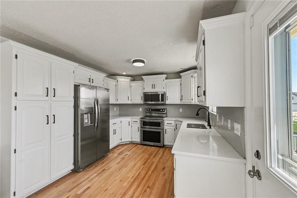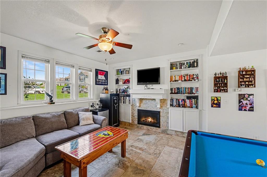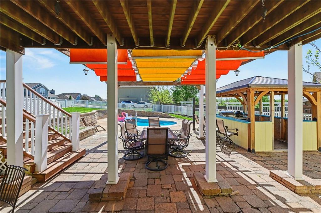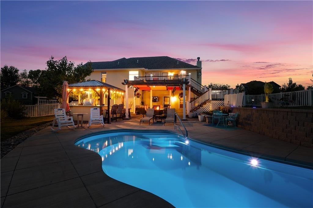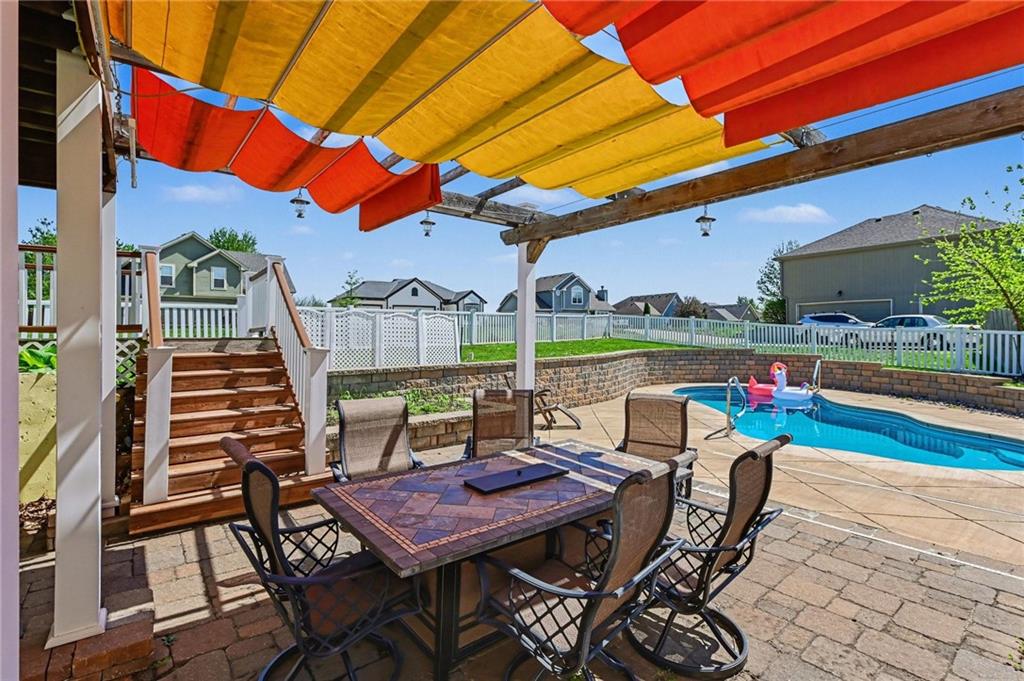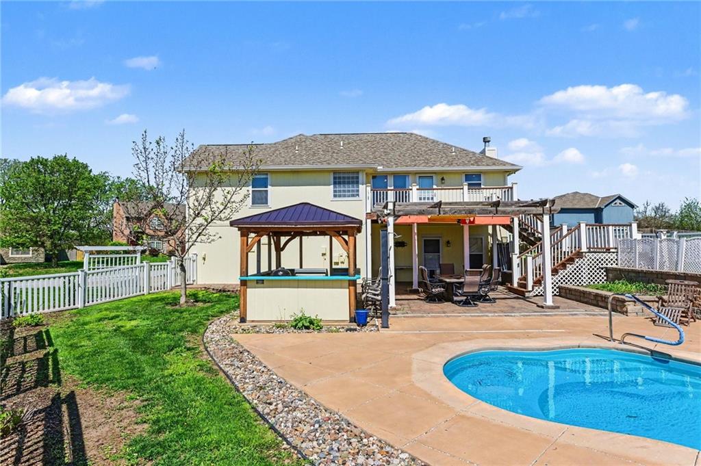 Welcome to your private outdoor entertainment retreat just minutes from Smithville Lake: every day feels like a vacation. Designed for year-round enjoyment, the backyard is the showstopper. Dive into the 30-foot heated saltwater pool, unwind on the spacious paver stone patio, or host unforgettable gatherings at the 14x10 gazebo, fully transformed into a Tiki bar. Relax under the pergola with retractable misting shades beside a fire pit table that comfortably seats six. The fully fenced yard, featuring maintenance-free white vinyl fencing: also includes an outdoor shower for added convenience. Inside, the living room features hardwood floors, a vaulted ceiling, and a cozy fireplace, creating a warm and inviting atmosphere. The kitchen & dining area flow seamlessly to a large deck with stairs leading directly to the pool. The kitchen is equipped with a pantry, refreshed white cabinetry, generous counter space, stainless steel appliances. The primary suite offers a vaulted ceiling, two walk-in closets, and a private ensuite bath complete with double vanities, a whirlpool tub, & a separate shower. Secondary bedrooms each include walk-in closets & ceiling fans. The finished lower level expands your living space with a versatile rec room featuring a second fireplace, built-in bookshelves, a half bath, & walkout access to the backyard. Updates include newer garage doors & openers, a sprinkler system, & refreshed pool landscaping. The HVAC system is just 3 years old, providing added comfort & peace of mind. The 3-car side-entry garage offers ample parking & storage. Enjoy neighborhood amenities including walking trails, a community pool, & a scenic fishing lake. Located near Smithville Lake, with over 175 miles of shoreline, you’ll have access to marinas, campgrounds, picnic shelters, golf courses, & endless outdoor recreation: boating, fishing, sailing, swimming, water skiing, plus hiking, biking, and equestrian trails. This isn’t just a home: it’s a lifestyle.