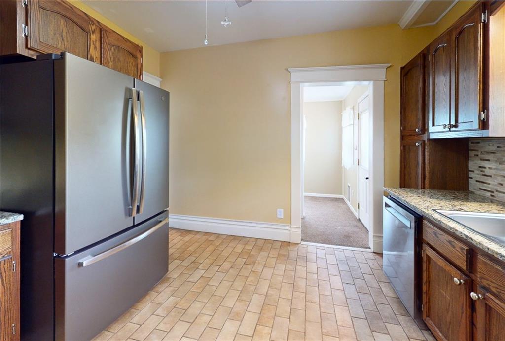 Discover this beautifully updated residence where classic charm meets modern convenience. This three-bedroom, one-bathroom home features a freshly painted interior, providing a bright and clean atmosphere throughout every room. The functional floor plan boasts a large formal dining room and a dedicated laundry room, offering the space and utility desired in a modern layout. Exterior highlights include an inviting front porch, a generous back deck for outdoor relaxation, and a yard fully enclosed by a privacy fence. Additionally, the property includes a detached one-car garage, providing secure parking or extra storage. This move-in-ready home is prepared for its next chapter.