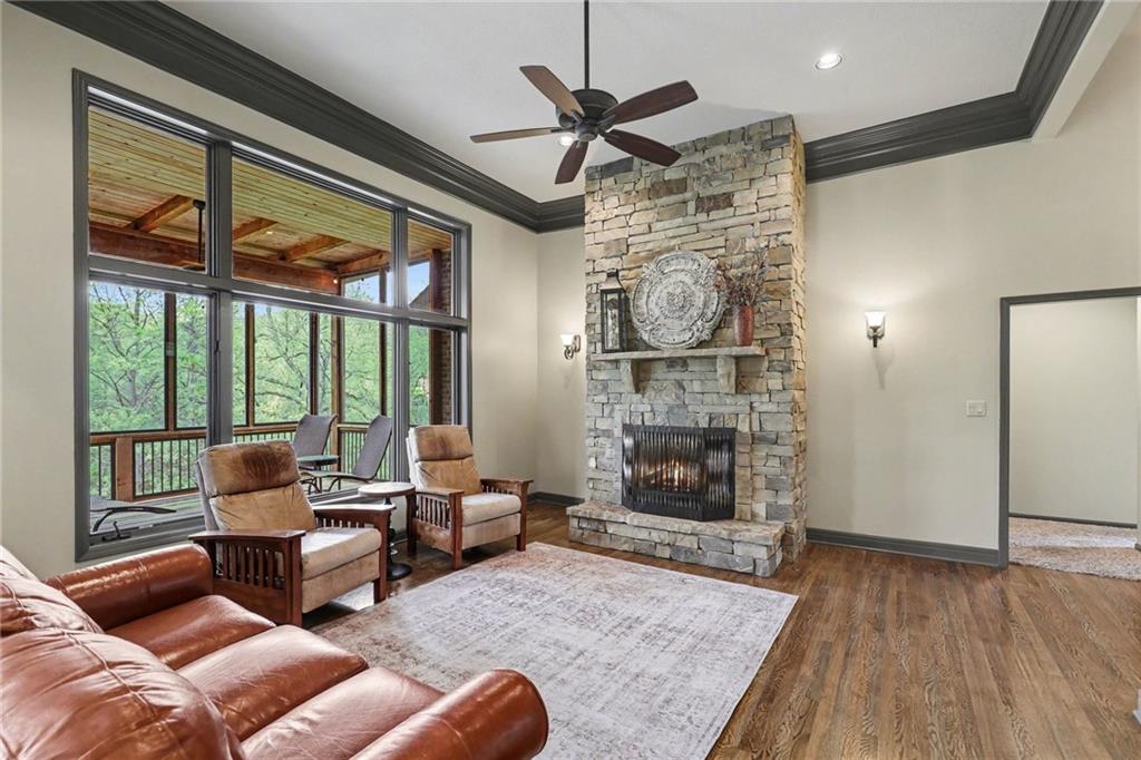 Stunning custom-built home where thoughtful design meets breathtaking views—come for the house, stay for the scenery. The chef’s kitchen is a showstopper with hardwood floors, custom cabinetry, granite tile countertops, a breakfast bar with seating, and stylish pendant lighting. The breakfast area features soaring ceilings, walls of windows, and access to the covered, screened-in porch—perfect for relaxing mornings or evenings. The inviting Great Room offers beautiful views of the treed backyard, upgraded trim, and a striking stone fireplace. The grand entry welcomes you with a vaulted ceiling, updated lighting, and tiled flooring. The primary suite is a retreat with bayed windows, a tray ceiling, and ceiling fan. The spa-like bath includes a double vanity with custom cabinetry, tiled floors, and a walk-in tiled shower. A secondary bedroom on the main level offers flexibility as a guest room or office. The large laundry room adds convenience with cabinetry and a sink. The lower level features a spacious living area with a corner fireplace and access to another covered deck, along with two generously sized bedrooms, a full bath, and a non-conforming bonus room. The next level is perfect for entertaining with a massive rec room, wet bar, and additional full bath. Walk out to the private, landscaped backyard and enjoy the serene, wooded setting year-round. Additional highlights include storage space under the two-car garage and a dedicated workshop area. This home truly has it all—space, function, and incredible views.