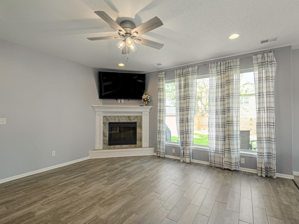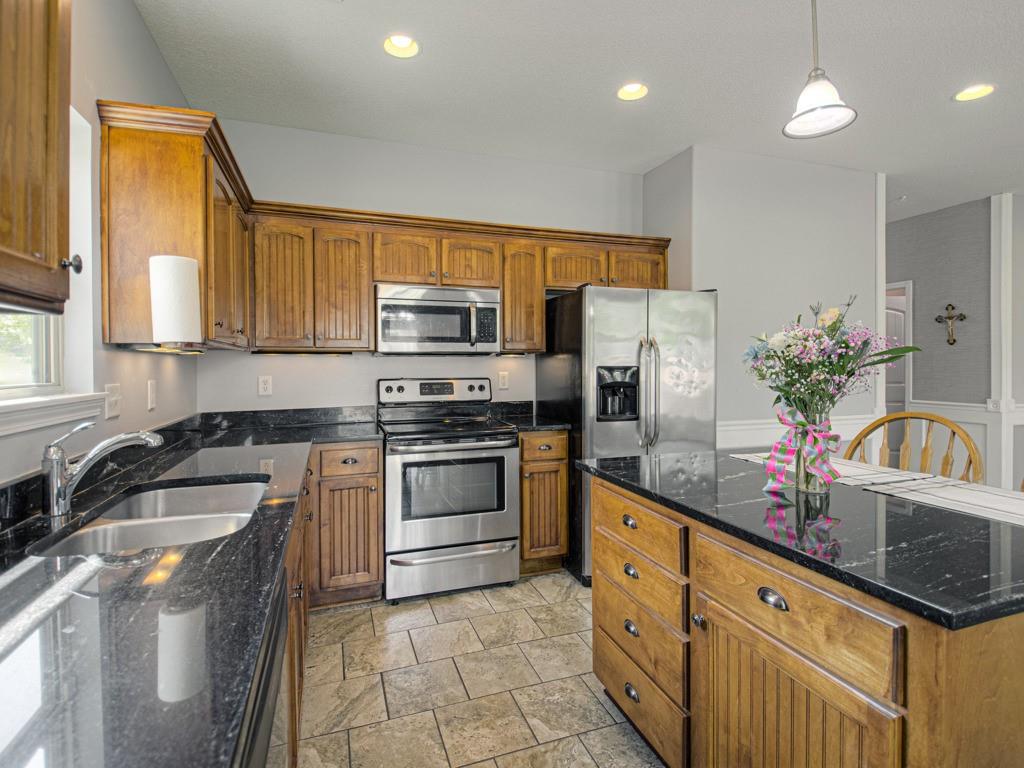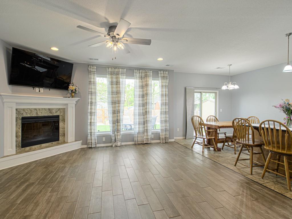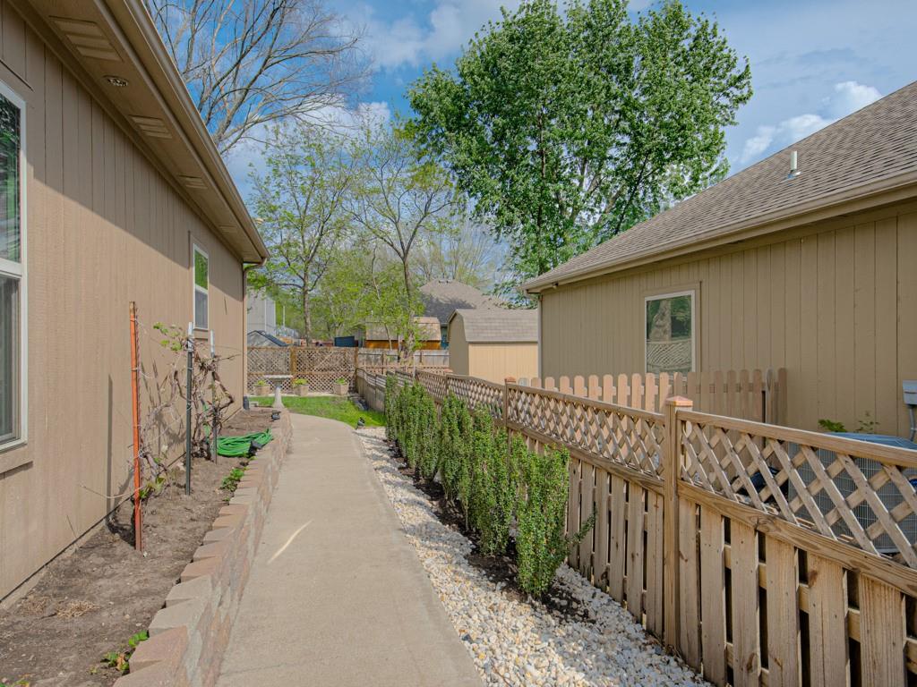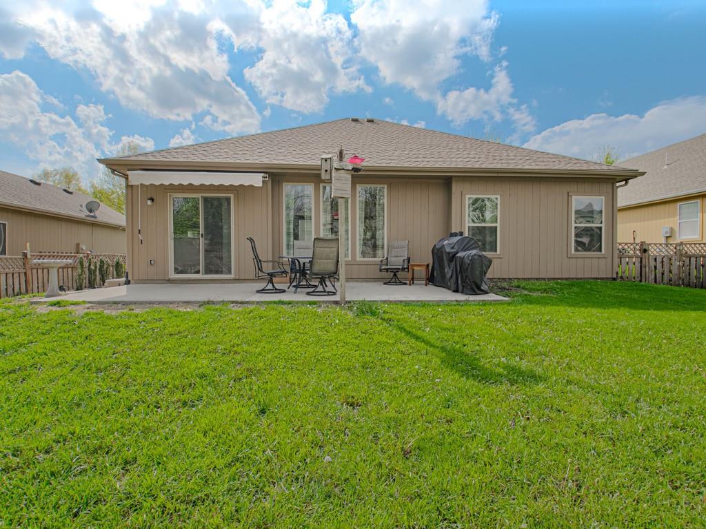 Beautiful true ranch home with an open, inviting layout. The spacious great room features a fireplace, ceiling fan, and abundant natural light. Ceramic tile flooring extends from the entry through the hallways, great room, kitchen, and both bathrooms. The kitchen offers granite countertops, a center island with breakfast bar, stainless steel appliances, and ceramic tile floors. Convenient main-floor laundry. The bedroom layout provides added privacy, with two secondary bedrooms on one side of the home and the primary suite on the other. The primary bedroom features a double-vault ceiling, ceiling fan, and a large walk-in closet. The primary bath includes a double vanity, jetted tub, and separate shower. Enjoy outdoor living with both a front patio and a large backyard patio. The backyard is fully enclosed with a wood privacy fence and includes a storage shed for extra space. Nicely landscaped yard in the front, back, and sides. Two-car attached garage with a three-car driveway.