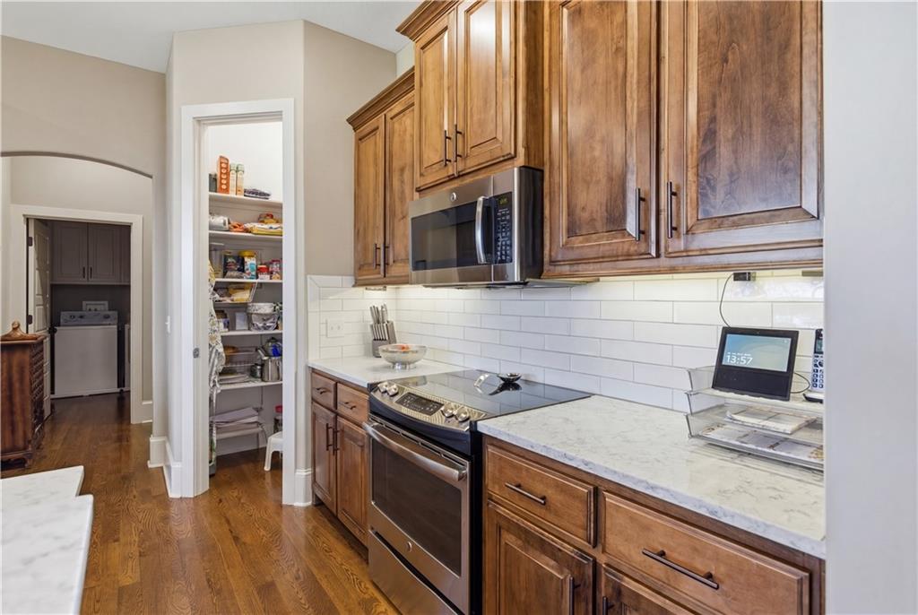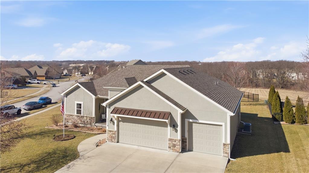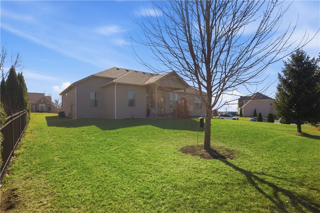 Former model home in highly desirable Greyhawke at the Lake! This spacious 4-bedroom, 3-bath residence offers an open and airy floor plan with tall 6-panel doors, large closets, and quality finishes throughout. The main level features three bedrooms, including a private primary suite with dual vanities, a jetted tub, a tiled glass walk-in shower, and a private water closet. Hardwood floors flow through the great room, dining area, and kitchen, and a gas fireplace anchors the living space perfect for both everyday living and entertaining. The finished daylight basement provides flexible space for recreation, guests, or hobbies. Step outside to enjoy the covered patio overlooking a beautifully landscaped corner lot that adjoins green space and includes an in ground sprinkler system. A security system and internal antenna streaming system are added bonuses. The three car attached garage offers plenty of room for vehicles, storage, or lake gear. Recent updates include a new roof and gutters for added peace of mind. Located just minutes from Smithville Lake and Paradise Pointe Golf Complex, with easy access to top-rated Smithville schools and Northland amenities, this home delivers space, comfort, and an unbeatable location.