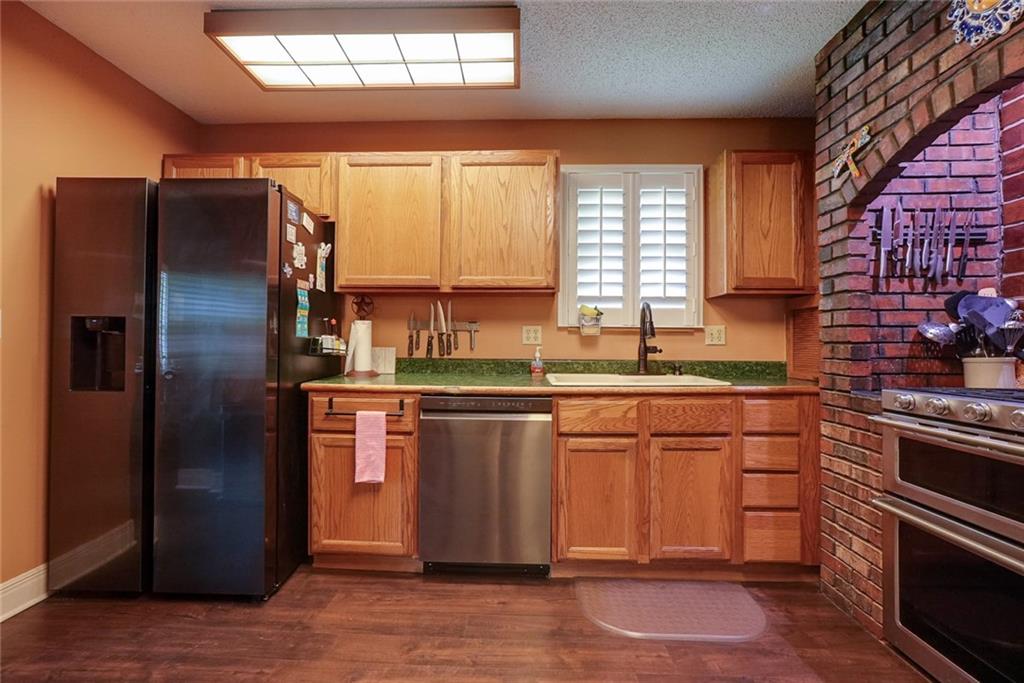 Kitchen featuring wood-finish flooring, natural wood cabinetry, and a brick-arch oven surround