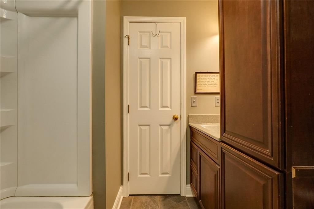 Bathroom featuring a white paneled door with a brass doorknob, dark wood-finish cabinetry, a light-toned countertop, and a white integrated sink