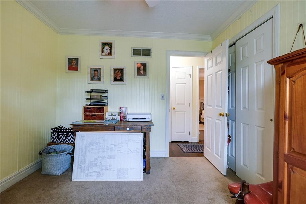 Carpeted room featuring beadboard paneling on walls, crown molding, white trim, and a white six-panel bifold closet door