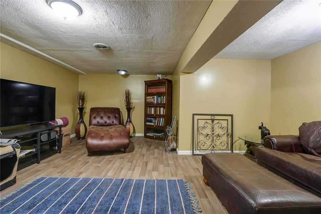Finished lower level featuring wood-finish flooring, recessed lighting, and an exposed ceiling beam