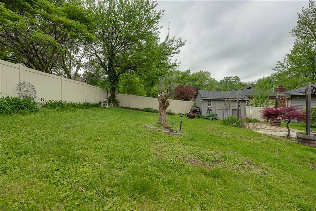 Spacious backyard with a large concrete patio, brick chimney, and a separate storage shed