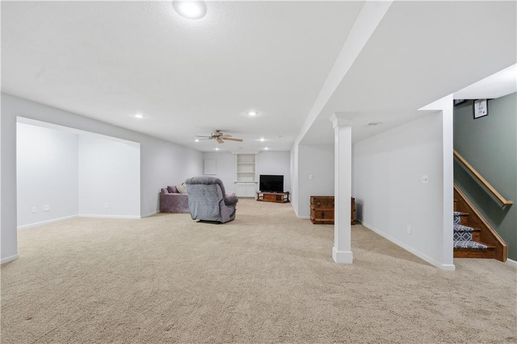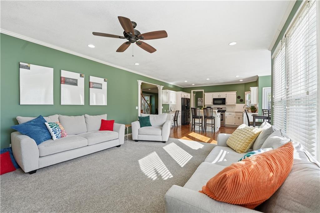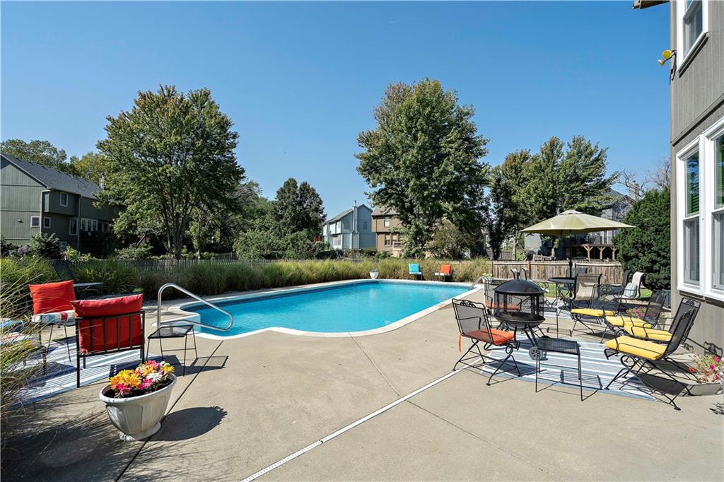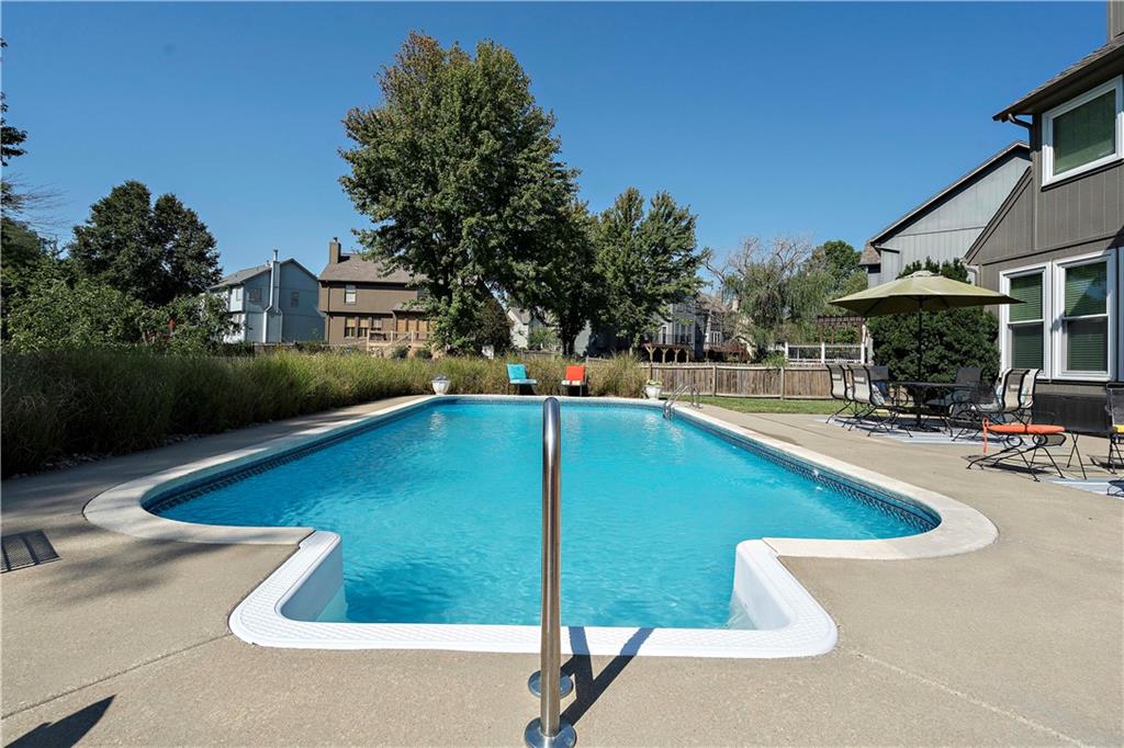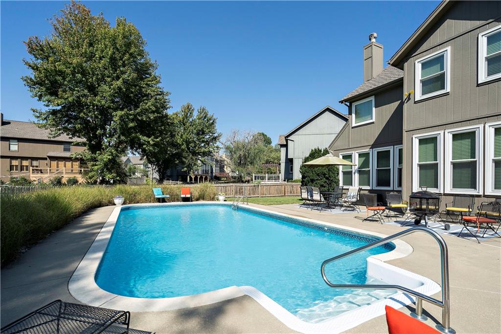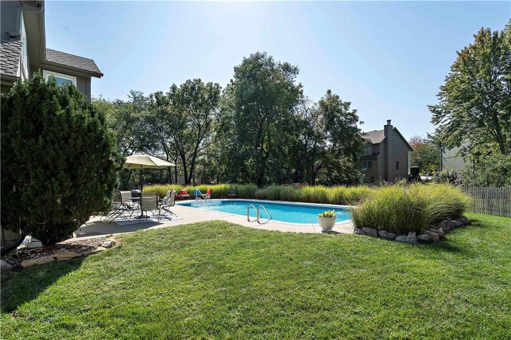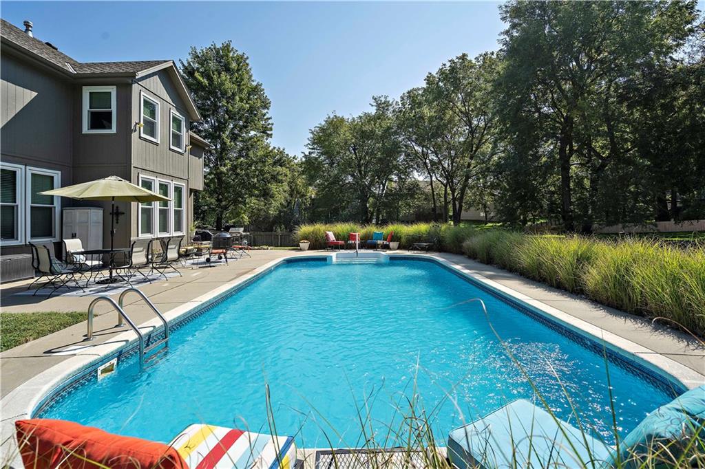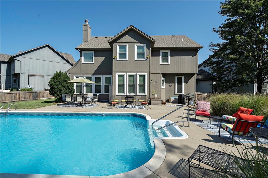 Very rare Blue Valley family home with a 3rd-car garage on a cul-de-sac lot with an in-ground pool! Nothing to do but move in and enjoy this spacious and functional family home. It features a front sitting room that can be used as a home office and a formal dining room. The heart of the home is the kitchen with a center island that opens to the large family room and kitchen dining room. Just off the kitchen is the spacious, fenced backyard and patio with an in-ground saltwater swimming pool, perfect for year-round relaxing, grilling, and entertaining. Upstairs are the large primary bedroom and sitting area with an en suite bathroom and an enormous walk-in closet; a junior suite with a full bathroom and two additional bedrooms; a Jack-and-Jill bathroom; and a laundry room. The large finished basement has plenty of space for a media room, home gym, and recreation area. It includes a fourth full bathroom. Recent updates include new interior paint, new carpet, and new bathroom and laundry room flooring. Outstanding location. Close to trails and a short distance to the Community Center. Close to restaurants and shops, and easy access to Hwy 69 and I-435.