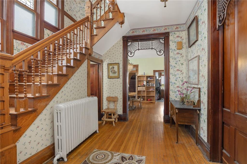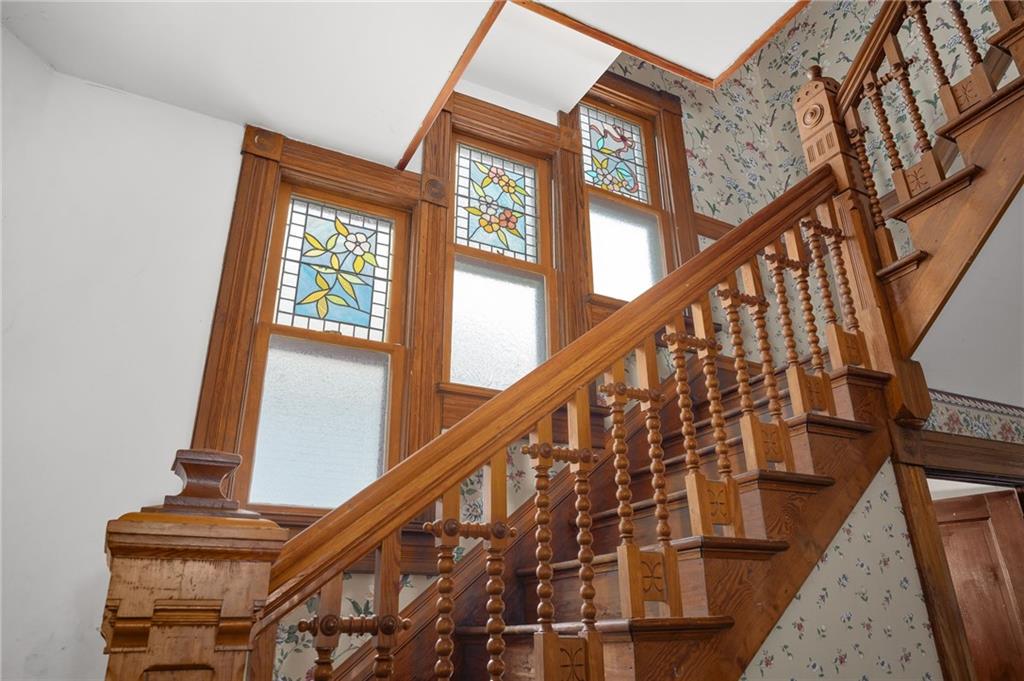 Step into timeless charm with this beautifully preserved Victorian-style historic home. The kitchen showcases a stunning decorative tin ceiling paired with custom cabinetry, blending character with functionality. Throughout the home, you’ll find original architectural details including ornate spandrels, multiple fireplaces, pocket doors, vintage light fixtures, rich woodwork, and an abundance of stained and leaded glass windows that fill the space with warmth and light. The home offers generously sized bedrooms, along with spacious front and back parlors and a formal dining room—perfect for both everyday living and entertaining. Outside, enjoy a welcoming wraparound porch that flows seamlessly into an enclosed porch, along with a second-floor veranda—ideal for relaxing and taking in the surroundings. A detached two-car garage completes this remarkable property.