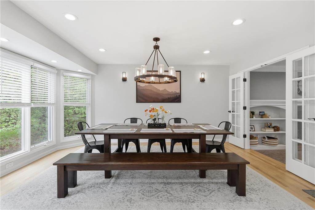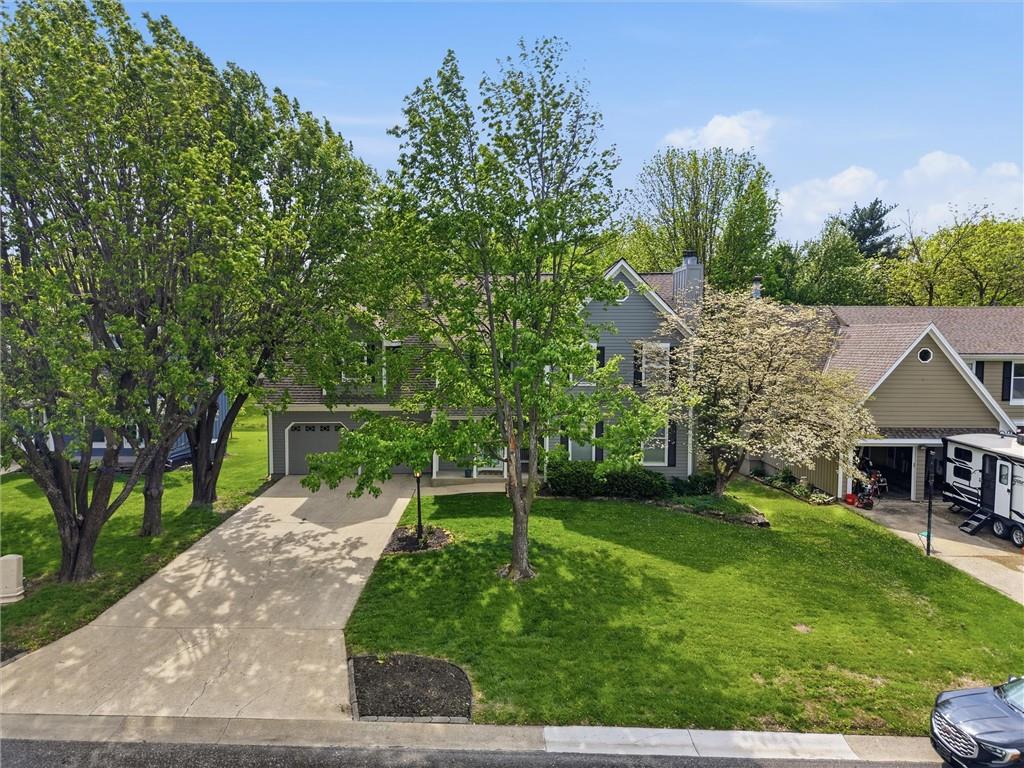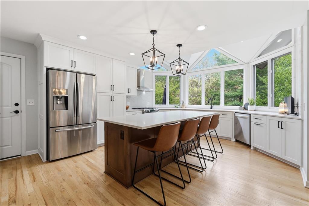 Welcome to Brookwood in Lenexa—where location meets lifestyle! Ideally situated with quick highway access, abundant nearby shopping & just minutes from the Lenexa City Center, this beautifully renovated home truly checks all the boxes. Lovingly updated by the current owners, nearly every surface has been thoughtfully refreshed. The show-stopping kitchen is sure to impress, featuring stainless steel appliances, a gas range with hood, a massive center island with quartz countertops & a stunning mix of stained wood cabinetry on the island paired with crisp white shaker cabinets along the perimeter. A charming bay window, bar area with a beverage center & floating shelves, and updated lighting complete the space. The adjacent dining area offers plenty of room to gather and is highlighted by a chandelier. Refinished hardwood floors flow throughout most of the main level, where you’ll also find a spacious carpeted living room with a fireplace and built-in shelving. The updated powder bath features a new vanity, mirror, lighting, and a shiplap accent wall. Step outside to the large deck that is set up with gas lines for a grill and firepit—perfect for entertaining & enjoy the privacy this lot provides. There is a greenbelt behind the house! Upstairs, you’ll find three generously sized secondary bedrooms, all with ceiling fans, including one with an incredible walk-in closet. The primary suite features a tray ceiling, a fireplace, dual closets, and a beautifully remodeled bathroom with a spa-like custom tiled shower, double vanity, updated lighting, mirrors & a full tile backsplash. The secondary full bathroom has also been updated with a stylish vanity, hexagon tile flooring, and newer fixtures. Convenient second-floor laundry makes everyday living easy. The finished lower level adds even more living space, complete with a wine closet and additional storage. This is a fantastic opportunity to own a move-in ready home in one of Lenexa’s most desirable areas—don’t miss it!
