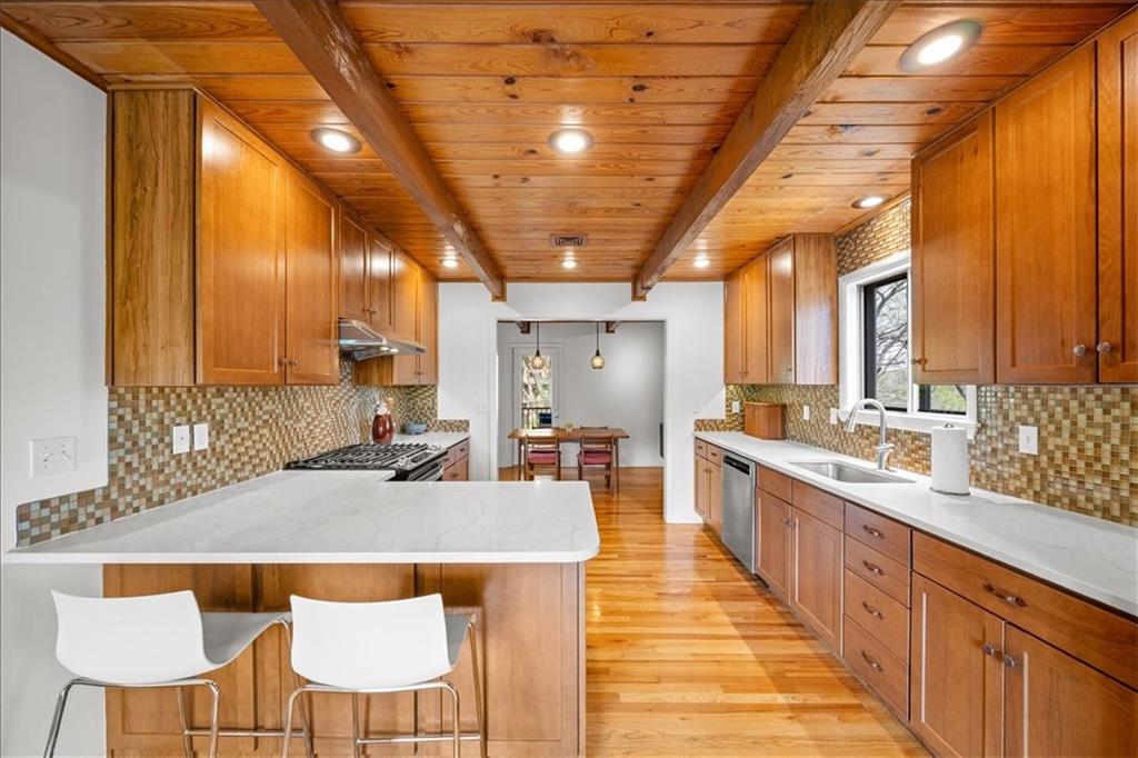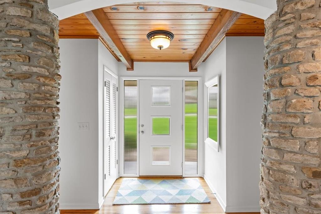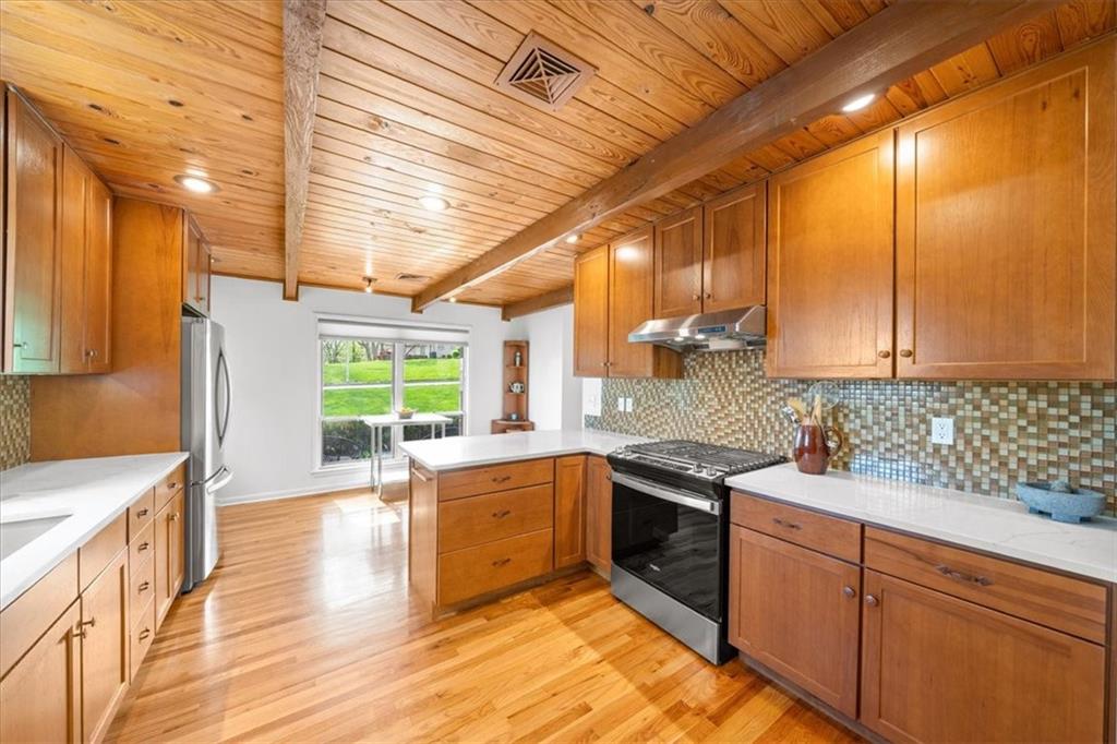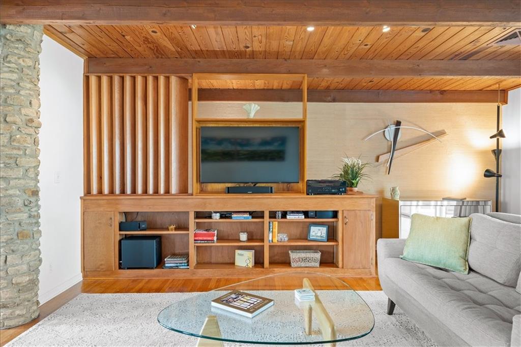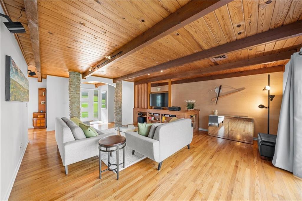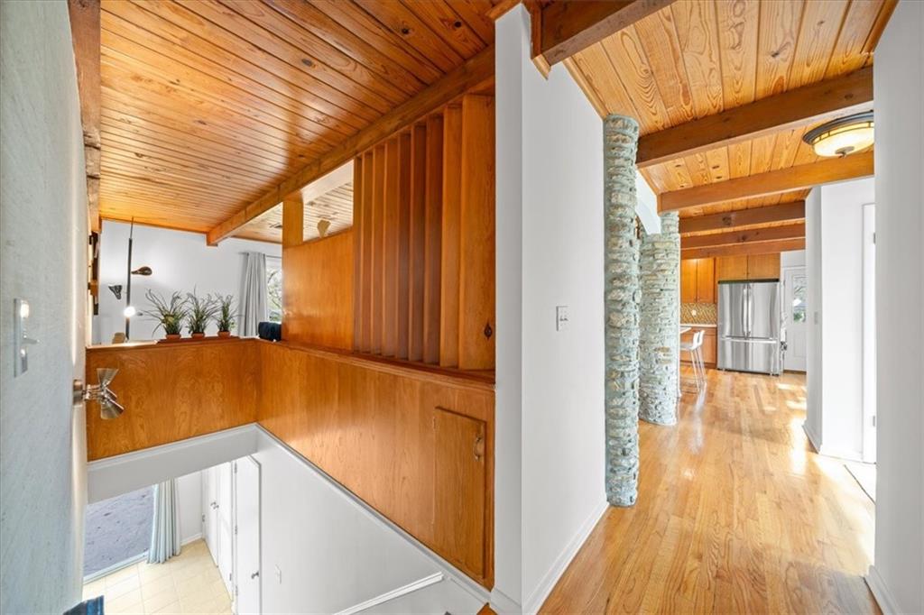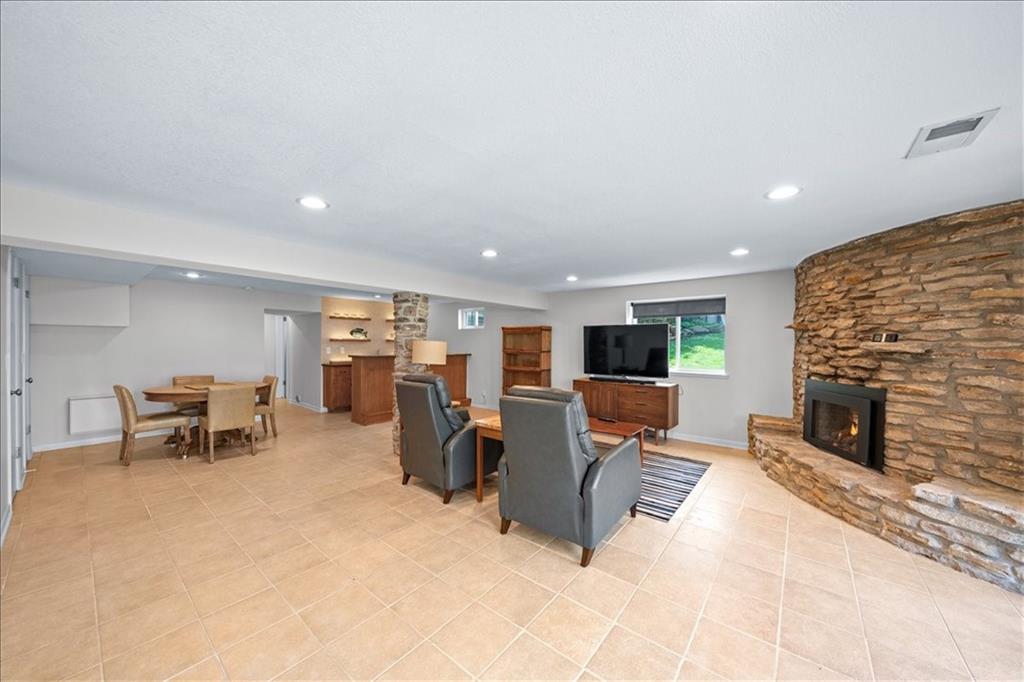 Special neighborhood with rare turnover thanks to its prime location and large lots. This Mid-Century ranch has been lovingly cared for by its current owners for the past 17 years. The home has been thoughtfully updated while retaining original architectural details, such as the wood ceilings, living room built-ins and columns faced with local stone. Large windows overlook the private wooded backyard, which you’ll also appreciate from the deck and screened in porch. The kitchen has been updated with quartz counters and stainless appliances, and adjoins a cozy dining room. The primary suite is a comfortable retreat. Downstairs you’ll find another living area with a high efficiency fireplace, a bar, and a third full bath. Walk right out to a stamped concrete patio with wiring in place for a hot tub, and a fire pit. Location, privacy, style and a very livable efficient floorplan – this one has it all.