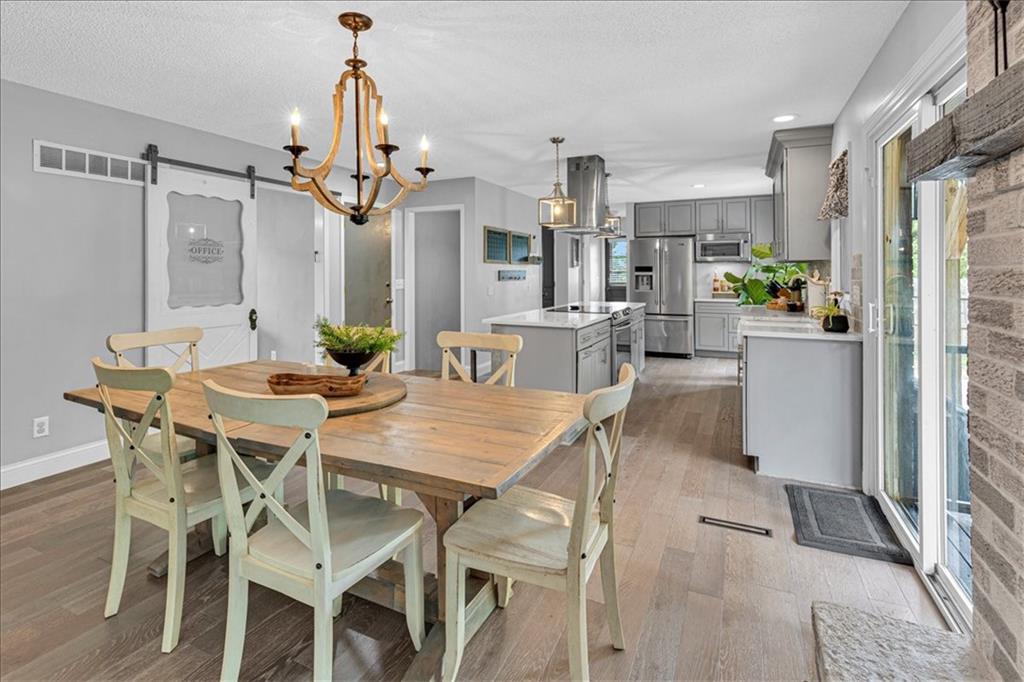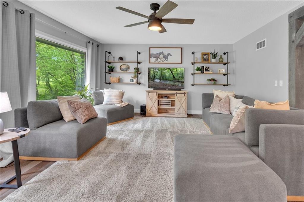 Welcome to your private slice of country living just minutes from the conveniences of Kearney and Liberty. Nestled on 5 beautiful acres, this fully updated reverse ranch offers over 3,200 square feet of thoughtfully designed living space—blending comfort, style, and functionality. The newly renovated main level features an inviting layout, completely renovated with hardwoods, open kitchen with large island & coffee bar, highlighted by a stunning brick wood-burning fireplace that creates a warm, cozy focal point. You’ll also find a versatile formal dining space that can easily serve as a home office to fit your lifestyle needs, along with the added convenience of main-level laundry. With two spacious bedrooms and 2.5 bathrooms on the main level, this home is designed for comfortable everyday living. Downstairs, you’ll find even more room to spread out with a third bedroom, an additional 1.5 bathrooms, and flexible living space—ideal for guests, a second living area, or multi-generational living. PLUS a Suspended Garage with single garage door access - offering you nearly 500sf of workshop space. Outside, enjoy the peace and privacy of acreage living with a fenced backyard, perfect for pets, play, or entertaining. This property offers mature trees, Magnolias, Sugar Maple, Natural Honeysuckle and many evergreens. Create your homestead. There's a large covered back porch, the 'Red Barn' outbuilding with concrete floors, electricity and water, plus enclosure for dogs, or other livestock. Electric fencing stays. Resident donkeys, "Mabel" & "Clementine" would love to stay. The three-car garage provides ample space for vehicles, hobbies, or storage. If you’ve been searching for updated living, land, and a location that offers both tranquility and convenience—this one checks all the boxes. No gravel. Completely paved.