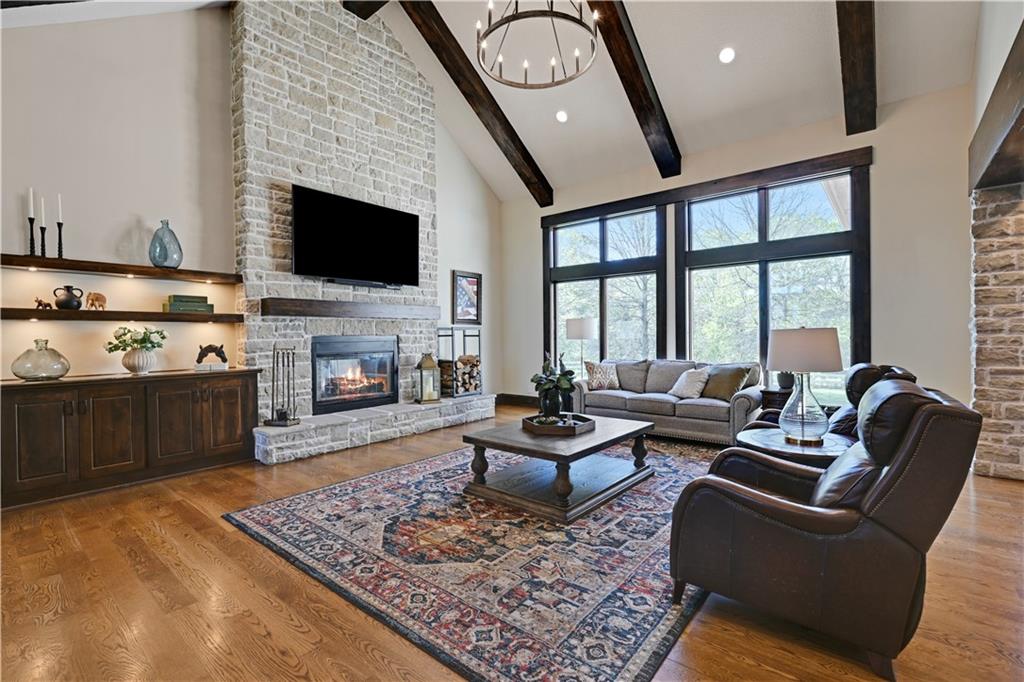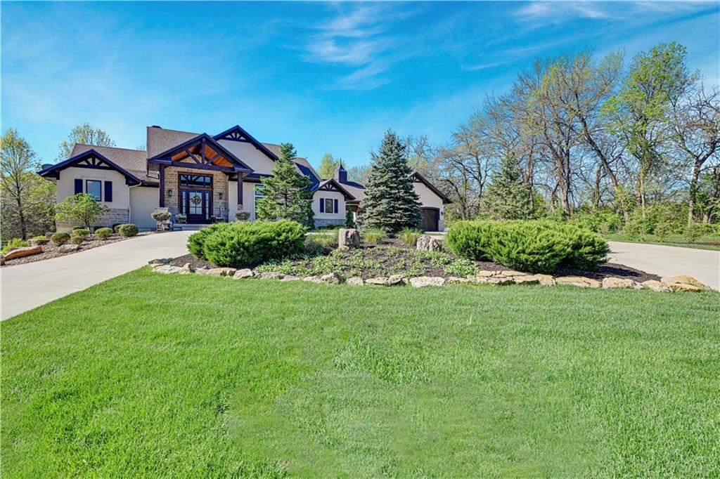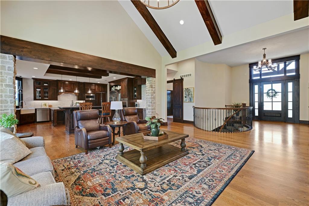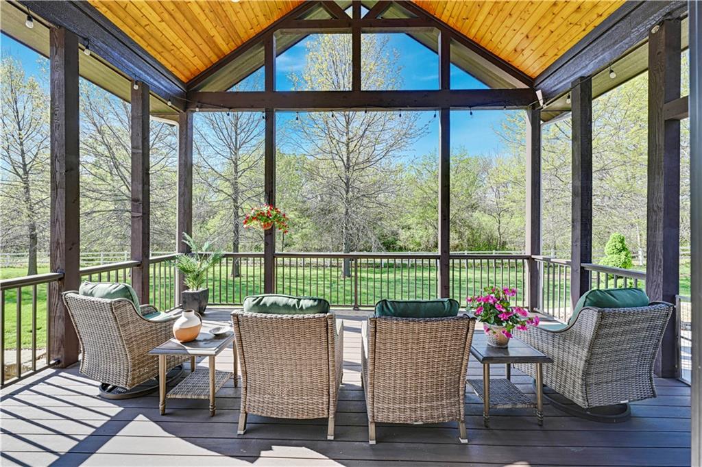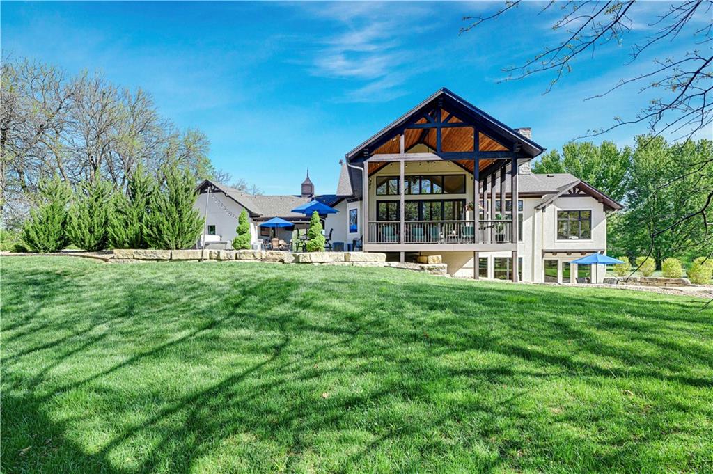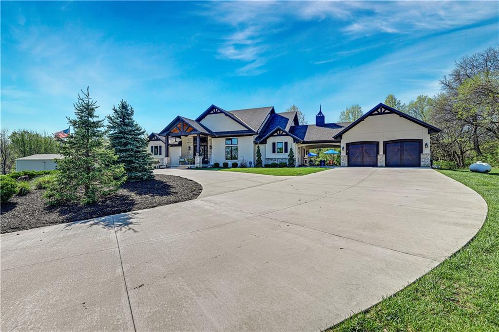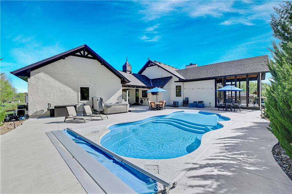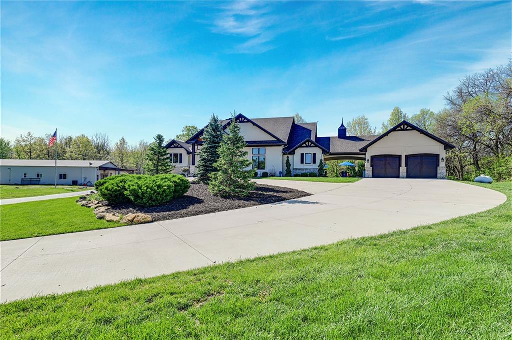 Welcome to this stunning Bruce Rieke custom built reverse 1.5-story estate, perfectly situated on nearly 8 acres of picturesque land. Thoughtfully designed with both luxury and functionality in mind, this home offers an exceptional blend of refined interior spaces and resort-style outdoor living. The main level features a chef’s designer kitchen with high-end finishes and ample space for entertaining, flowing seamlessly into a breathtaking great room highlighted by soaring vaulted ceilings and striking wood beams. The primary suite is a true retreat, complete with a cozy fireplace and a spa-like atmosphere. A dedicated office with an attached full bath provides flexibility for work or guest accommodations. The finished lower level is ideal for entertaining or multi-generational living, boasting a spacious family/media room, multiple seating areas, a wet bar/kitchenette, two additional bedrooms, and two full bathrooms. Step outside to your private oasis, where you’ll find an incredible outdoor living area featuring a fully equipped outdoor kitchen, an in-ground pool, a covered deck, and an expansive patio—perfect for relaxing or hosting gatherings. An additional outbuilding adds versatility and storage options to this already impressive property. This rare offering combines privacy, luxury, and space—creating the perfect place to call home.