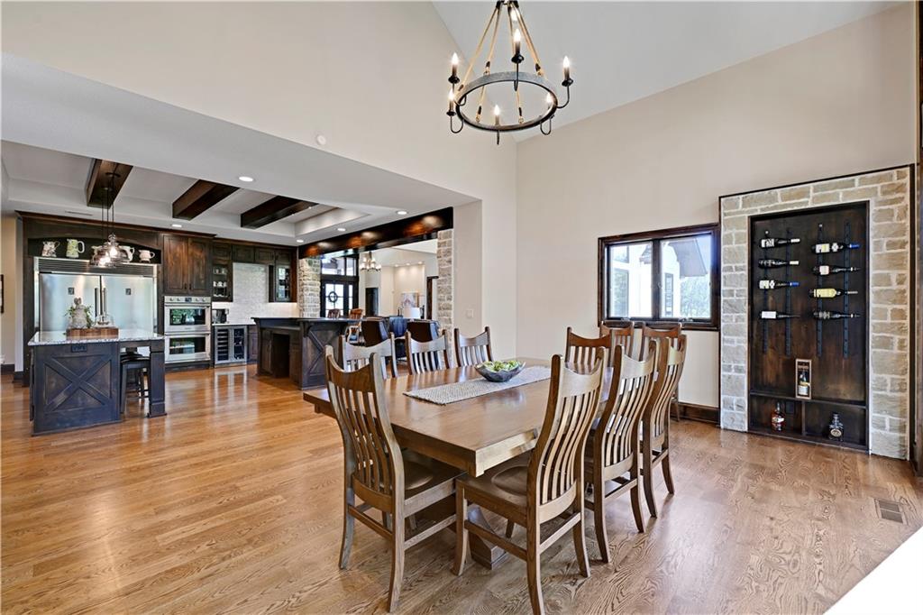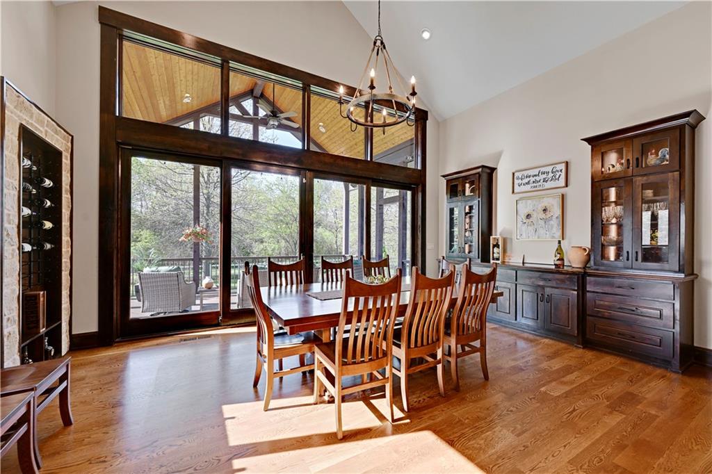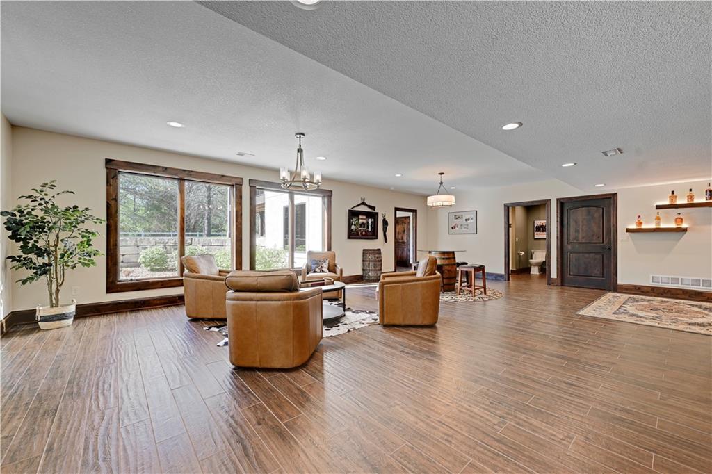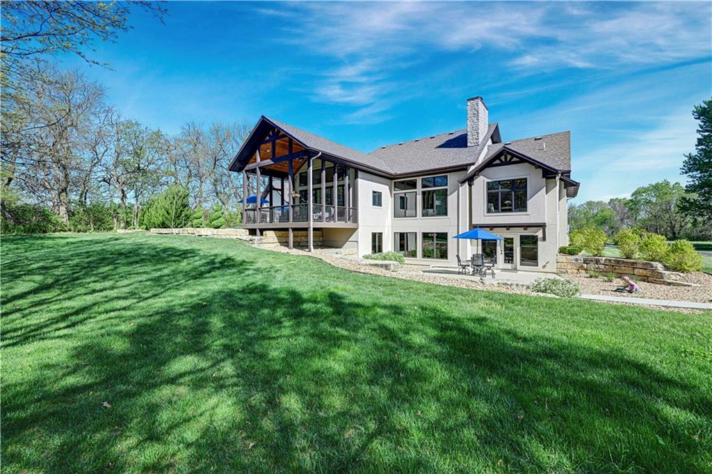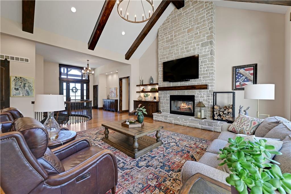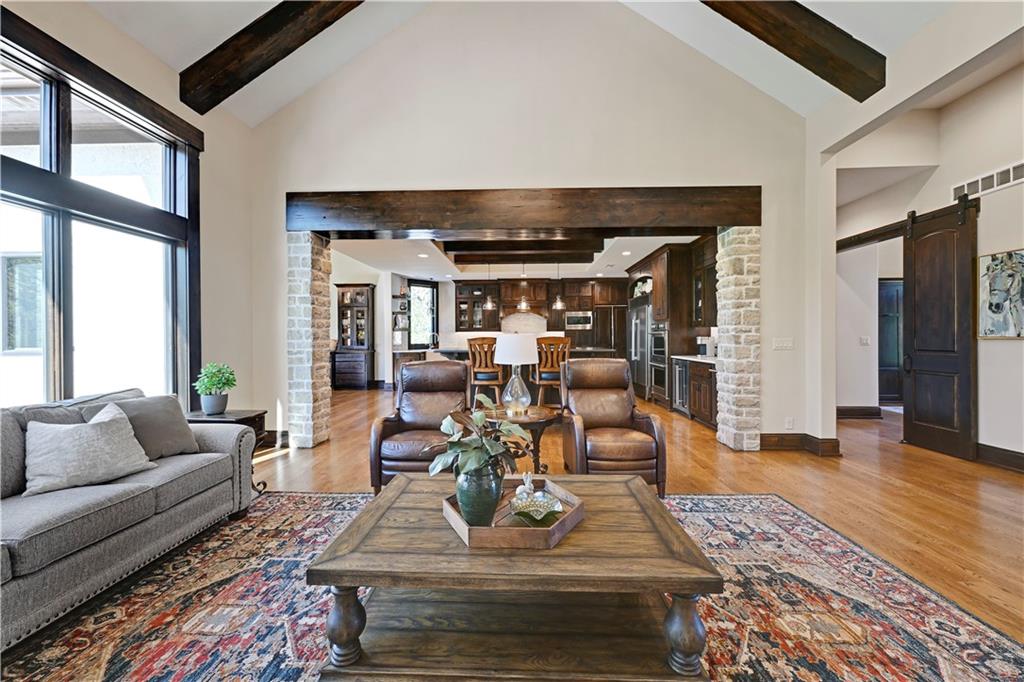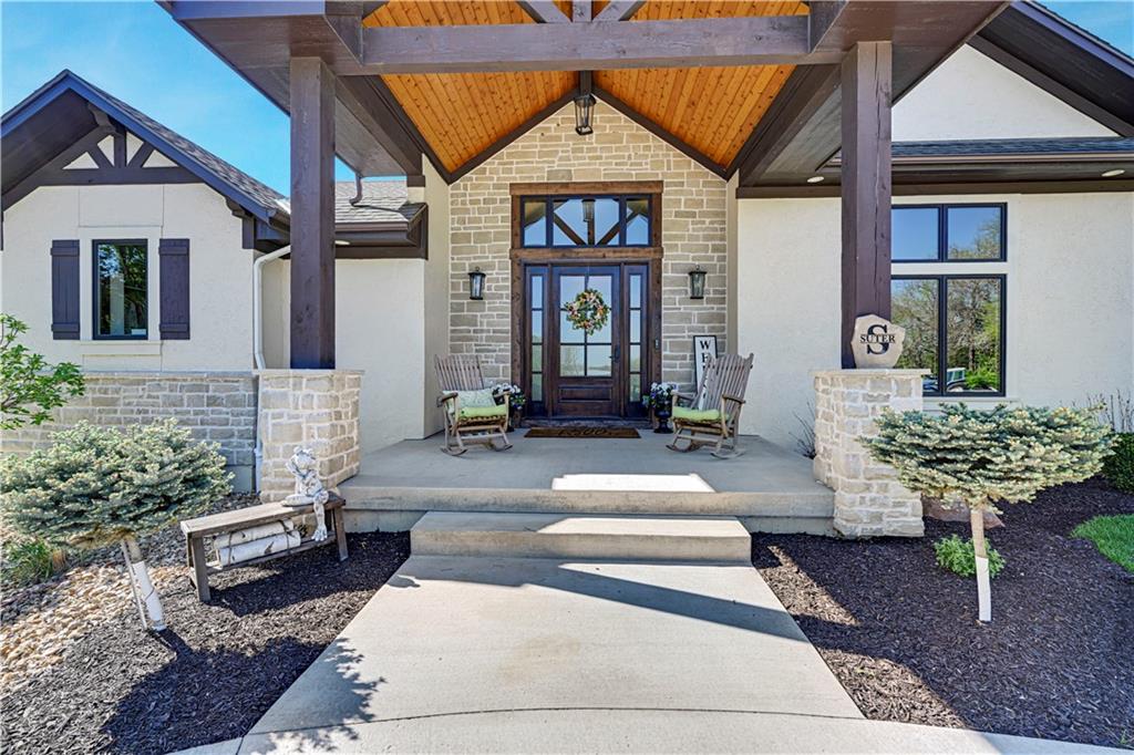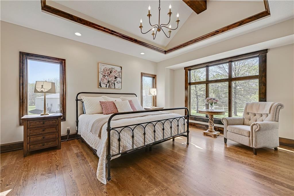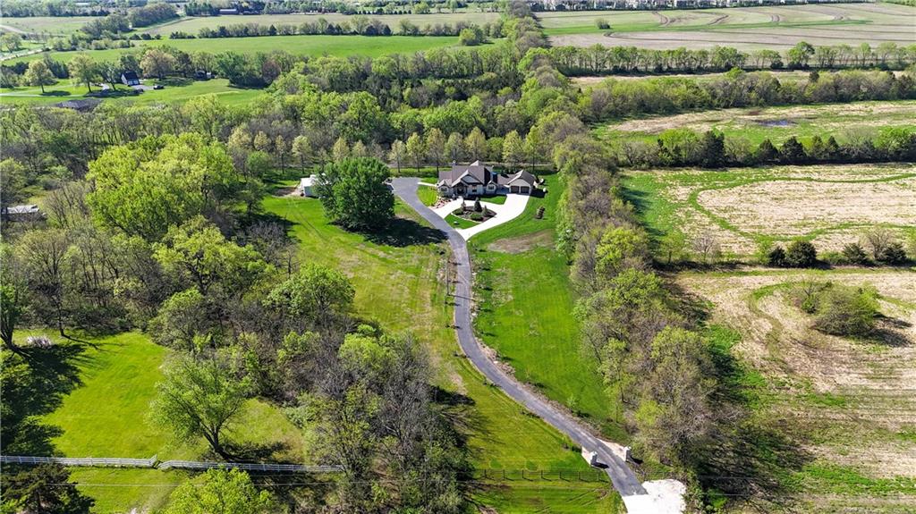 Welcome to this stunning Bruce Rieke custom built reverse 1.5-story estate, perfectly situated on nearly 8 acres of picturesque land. Thoughtfully designed with both luxury and functionality in mind, this home offers an exceptional blend of refined interior spaces and resort-style outdoor living. The main level features a chef’s designer kitchen with high-end finishes and ample space for entertaining, flowing seamlessly into a breathtaking great room highlighted by soaring vaulted ceilings and striking wood beams. The primary suite is a true retreat, complete with a cozy fireplace and a spa-like atmosphere. A dedicated office with an attached full bath provides flexibility for work or guest accommodations. The finished lower level is ideal for entertaining or multi-generational living, boasting a spacious family/media room, multiple seating areas, a wet bar/kitchenette, two additional bedrooms, and two full bathrooms. Step outside to your private oasis, where you’ll find an incredible outdoor living area featuring a fully equipped outdoor kitchen, an in-ground pool, a covered deck, and an expansive patio—perfect for relaxing or hosting gatherings. An additional outbuilding adds versatility and storage options to this already impressive property. This rare offering combines privacy, luxury, and space—creating the perfect place to call home.