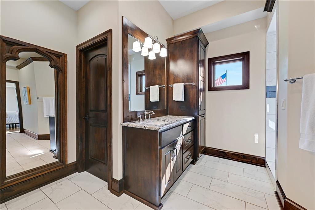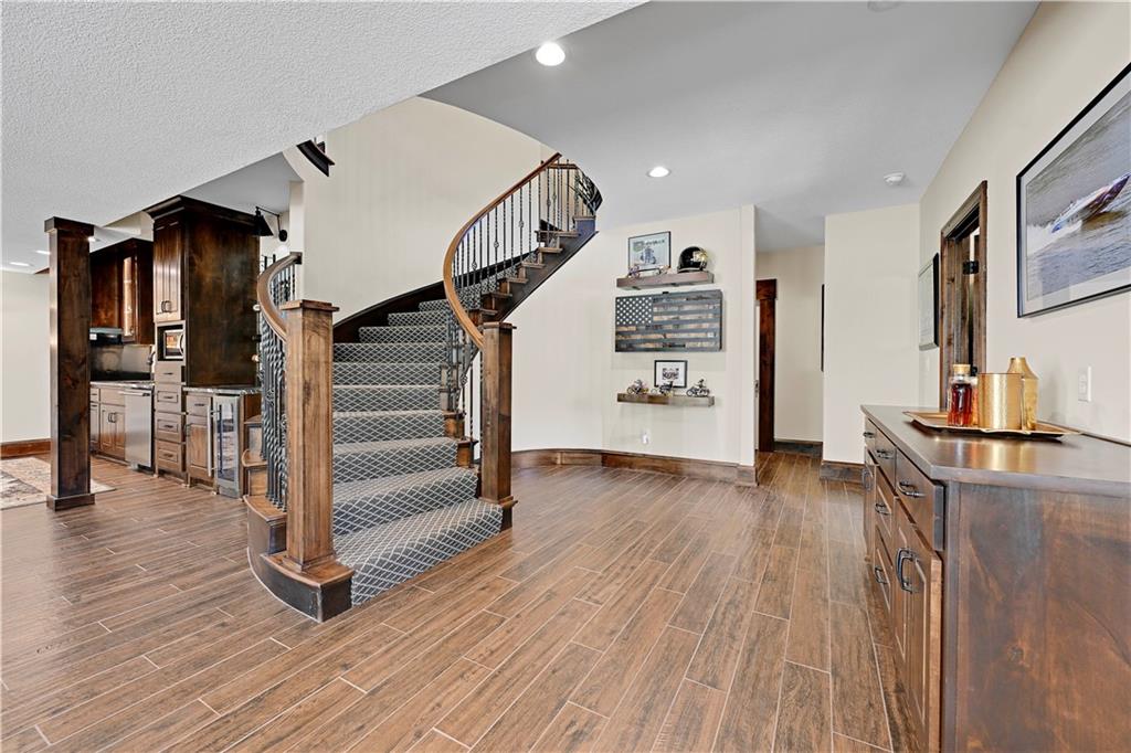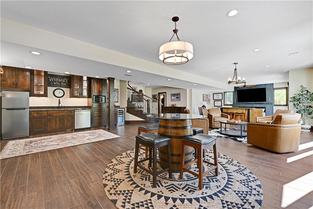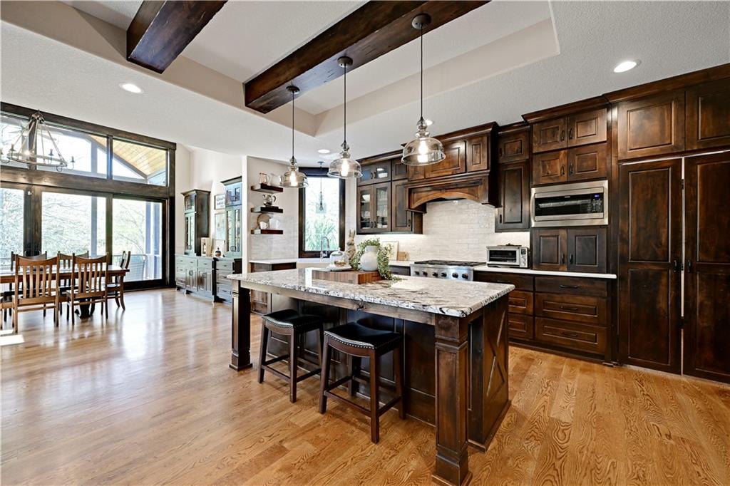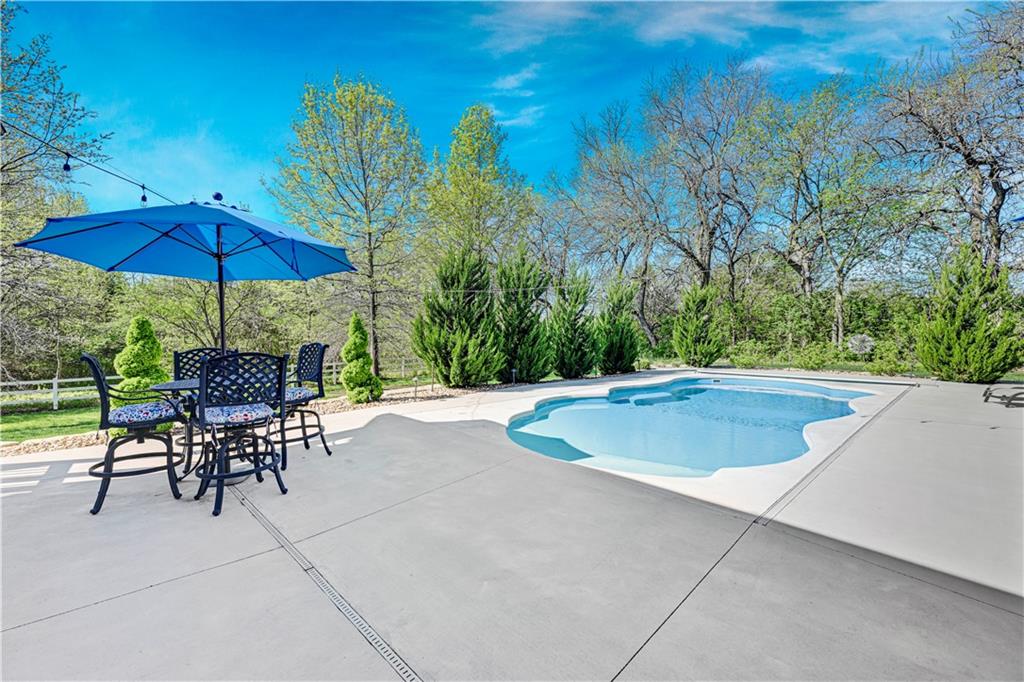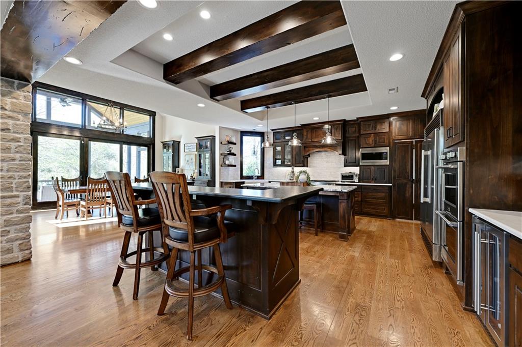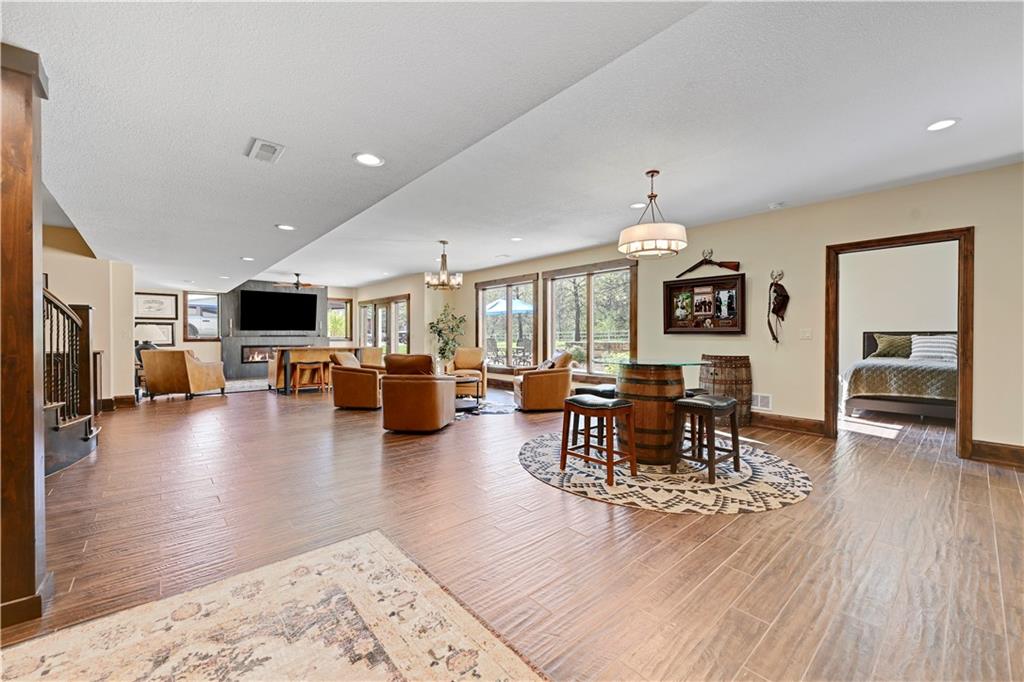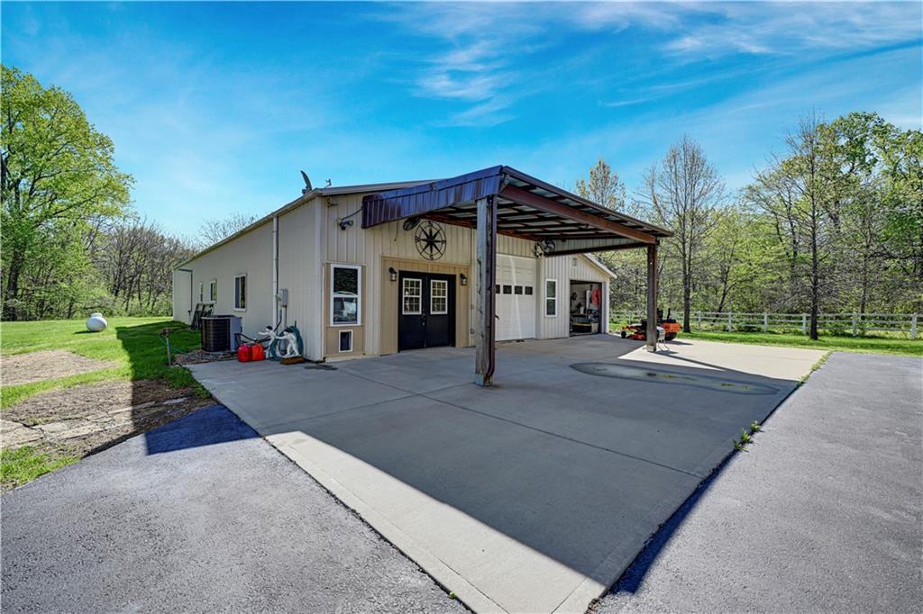 Welcome to this stunning Bruce Rieke custom built reverse 1.5-story estate, perfectly situated on nearly 8 acres of picturesque land. Thoughtfully designed with both luxury and functionality in mind, this home offers an exceptional blend of refined interior spaces and resort-style outdoor living. The main level features a chef’s designer kitchen with high-end finishes and ample space for entertaining, flowing seamlessly into a breathtaking great room highlighted by soaring vaulted ceilings and striking wood beams. The primary suite is a true retreat, complete with a cozy fireplace and a spa-like atmosphere. A dedicated office with an attached full bath provides flexibility for work or guest accommodations. The finished lower level is ideal for entertaining or multi-generational living, boasting a spacious family/media room, multiple seating areas, a wet bar/kitchenette, two additional bedrooms, and two full bathrooms. Step outside to your private oasis, where you’ll find an incredible outdoor living area featuring a fully equipped outdoor kitchen, an in-ground pool, a covered deck, and an expansive patio—perfect for relaxing or hosting gatherings. An additional outbuilding adds versatility and storage options to this already impressive property. This rare offering combines privacy, luxury, and space—creating the perfect place to call home.
