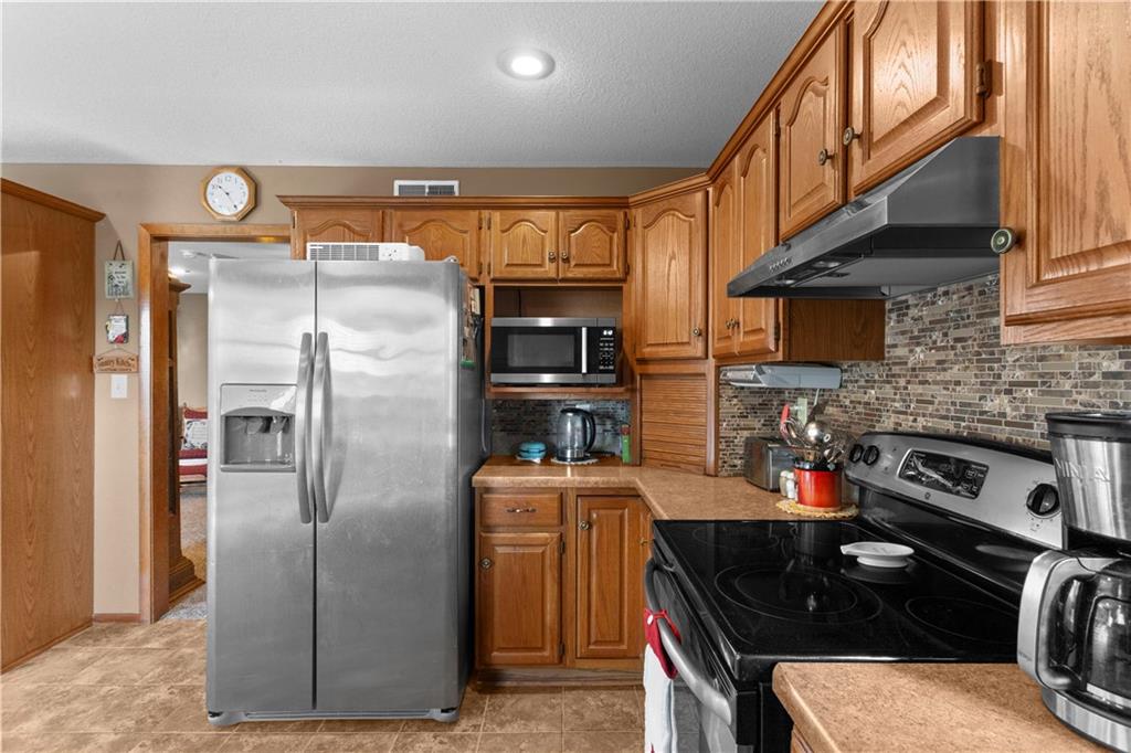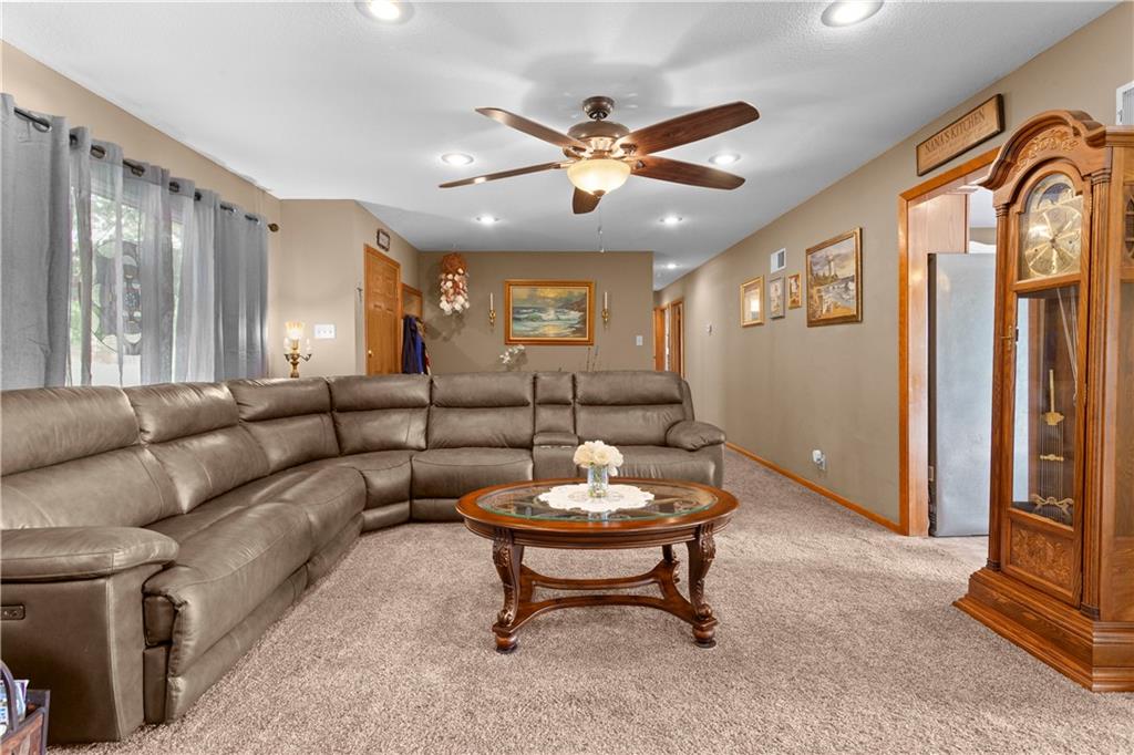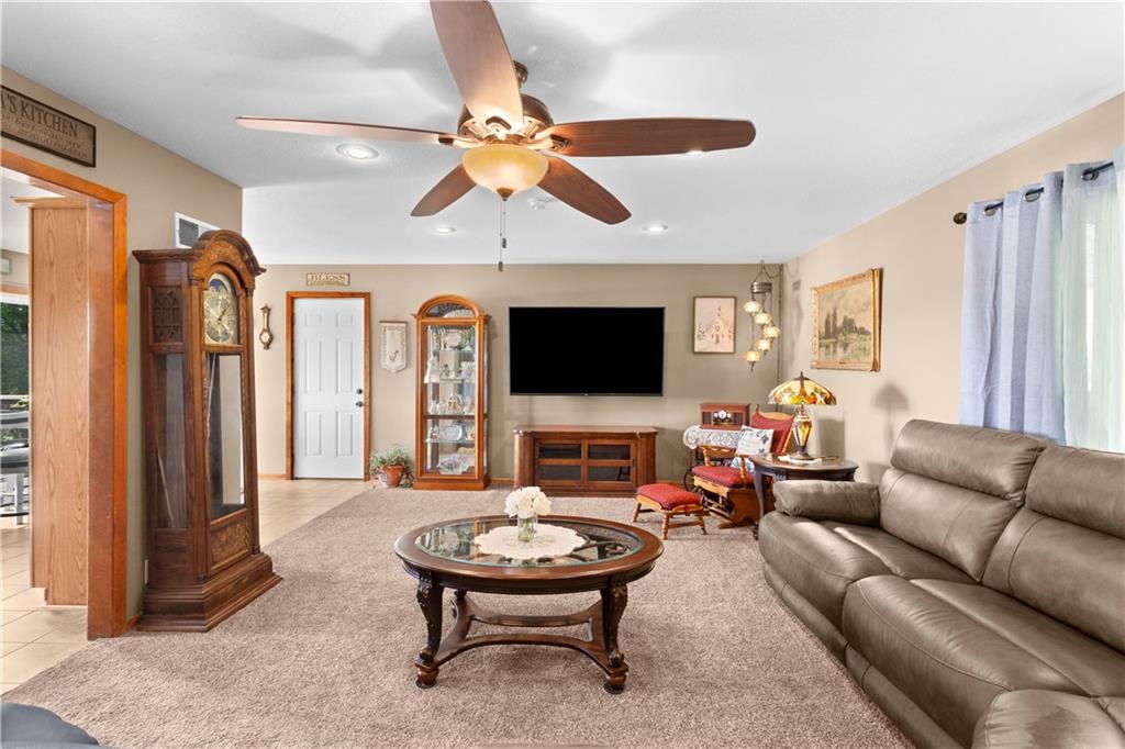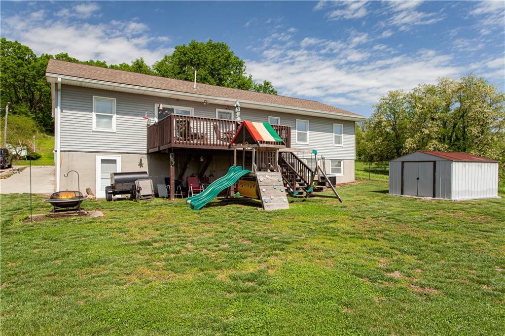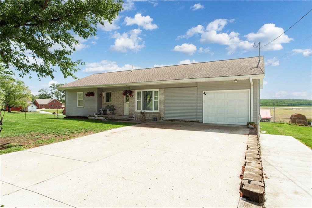 Enjoy the perfect balance of peaceful country living with the convenience of a short commute to the city in this move-in ready true ranch, offering generous space and thoughtful updates throughout. The spacious kitchen is ideal for everyday dining and entertaining, flowing seamlessly into a large, inviting living room. The main level features three bedrooms and a beautifully renovated bathroom, along with stainless steel appliances that remain with the home. The finished basement expands your living space with a sizable family room, a fourth non-conforming bedroom, and a second fully remodeled bathroom. You’ll also find a newly installed kitchenette—complete with a second refrigerator that stays—making it perfect for guests, multi-generational living, or additional convenience. There’s ample room for a craft area, workout space, and a laundry room with excellent storage options. A water softener is also installed and will remain with the home. From the rear exterior of the home, you’ll find a fully enclosed concrete safe room with all four walls constructed of cement—ideal for use as a storm shelter, workshop, or additional storage space. Spectrum Fiber has been installed and the hub is located in the garage. Step outside to a recently refinished deck, perfect for morning coffee or evening relaxation, overlooking a spacious backyard with two sheds and peaceful farmland views beyond. The home’s exterior features low-maintenance vinyl siding and brick, and all sewer lines were replaced in October 2020 for added peace of mind. The play-set in the back can stay! Located in the West Platte R-II School District, this property offers easy access to KCI Airport, the Legends shopping area, Zona Rosa, Weston, and Platte City, Leavenworth and Lansing. Situated on a quiet dead-end street, this charming home is one you won’t want to miss.