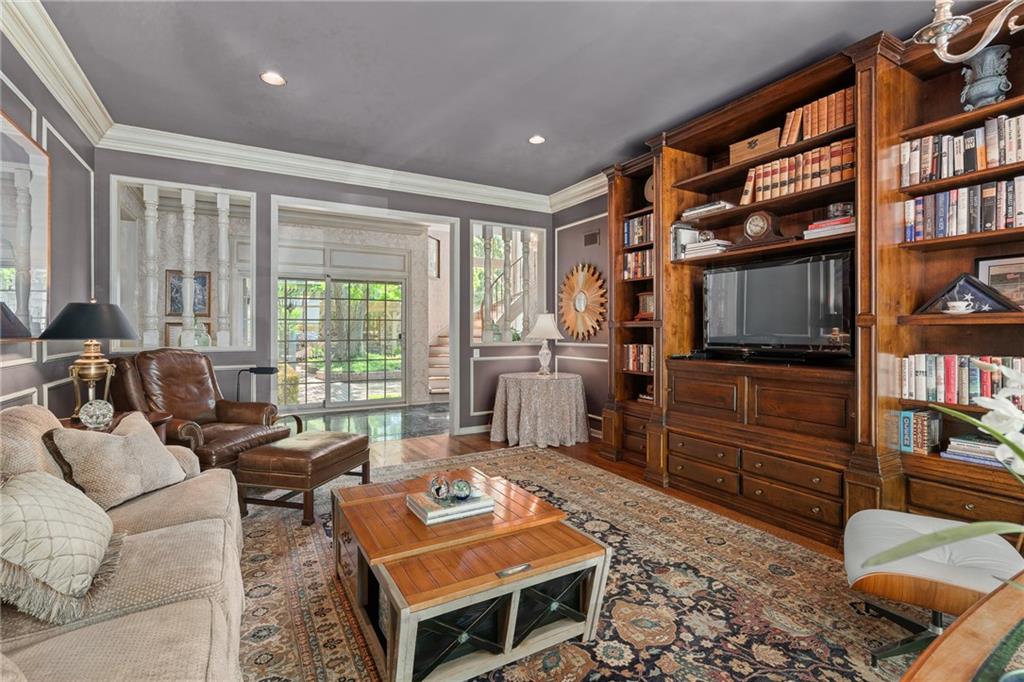 Imagine your own private chateau in the heart of Mission Hills-an extraordinary residence where timeless elegance and impeccable care come together in perfect harmony. From the moment you arrive and are greeted by the sweeping curved staircase in the entry, you know you are in for a treat of grandeur and warmth that really must be experienced in person.Soaring ceilings and beautifully proportioned rooms create and ideal setting for entertaining on any scale, yet the home remains inviting and comfortable for everyday living. At its heart, a truly special feature unfolds: a stunning U-shaped design embracing a brick-paved garden courtyard, complete with pergolas and fountains. This picturesque piazza offers an enchanting backdrop for celebrations, quiet evenings, or unforgettable gatherings under the stars. The spacious family room is a true showplace, featuring a vaulted, beamed ceiling, a striking fireplace as its focal point, and a well appointed wet bar-perfect for effortless entertaining with direct access to the piazza. The main level offers remarkable flexibility, with a serene primary suite featuring a barrel ceiling, fireplace and a beautiful view and access to the piazza. Two additional main-floor bedrooms share a bath, creating the opportunity for dual primary living on the same floor. Upstairs, two more bedrooms share a bath, ensuring there is truly room for everyone. The lovely eat-in kitchen is both functional and inviting, featuring a gas range, wine cooler, refrigerator drawers, and pantry. It opens to another, more intimate courtyard-an ideal setting for grilling, quiet mornings, or a relaxed evening in a private outdoor space. Storage is abundant throughout the home with an impressive number of large closets. This home also features a highly sought-after large three car garage with epoxy flooring. A versatile space just off the kitchen, currently an office with ensuite bath, offers potential for private quarters for live-in assistance. A magical home