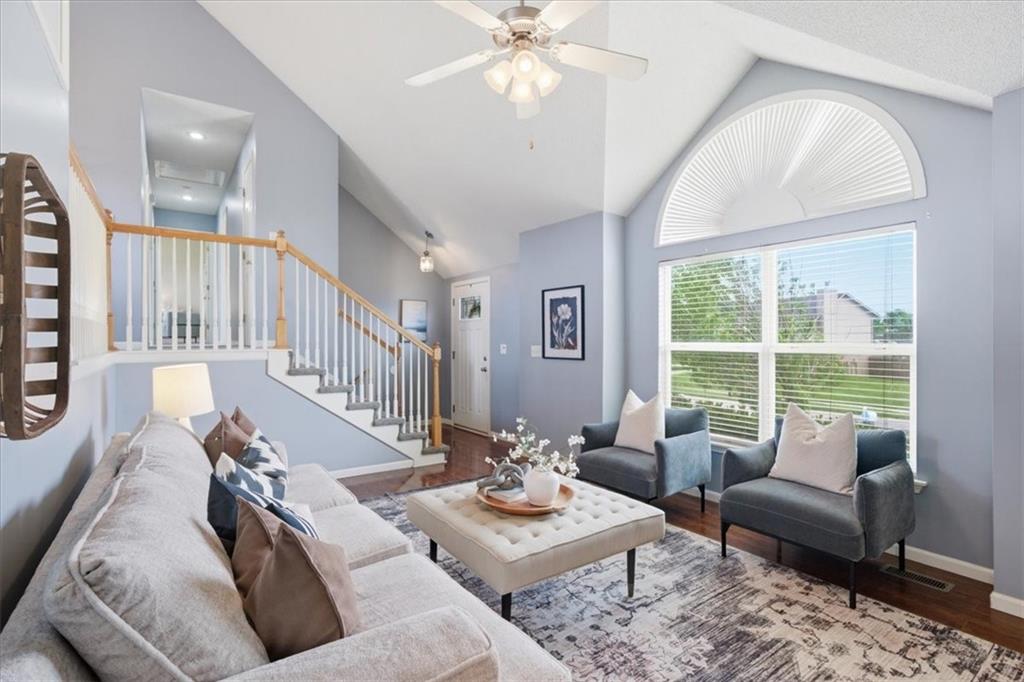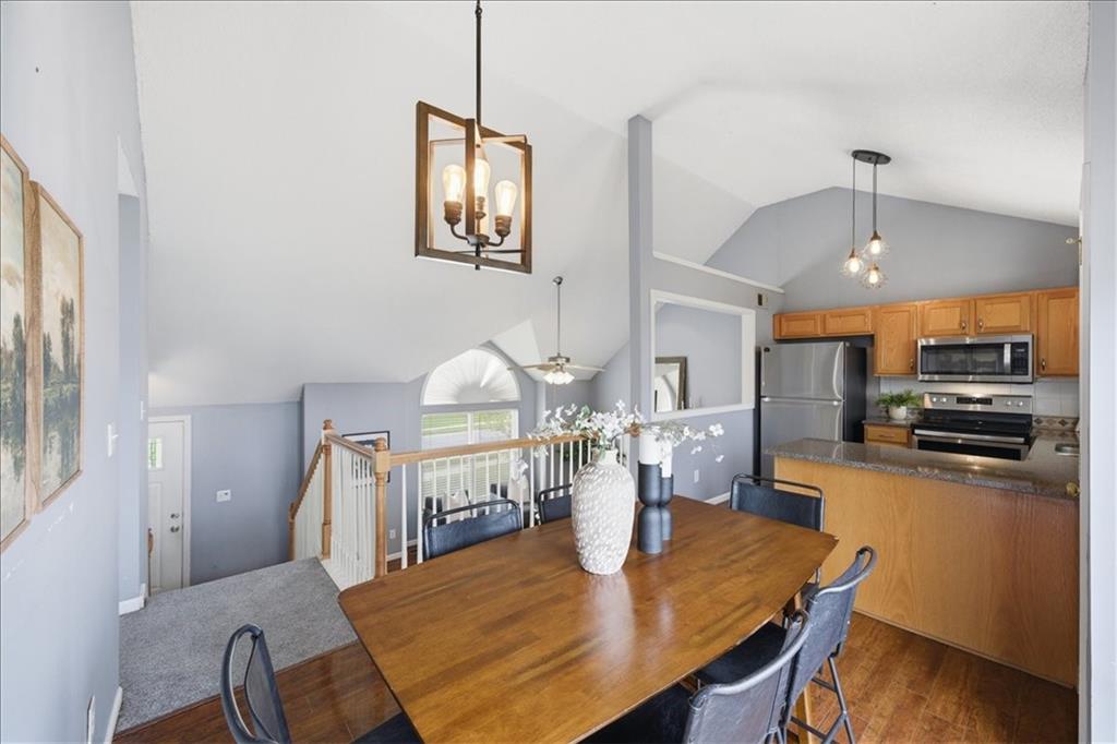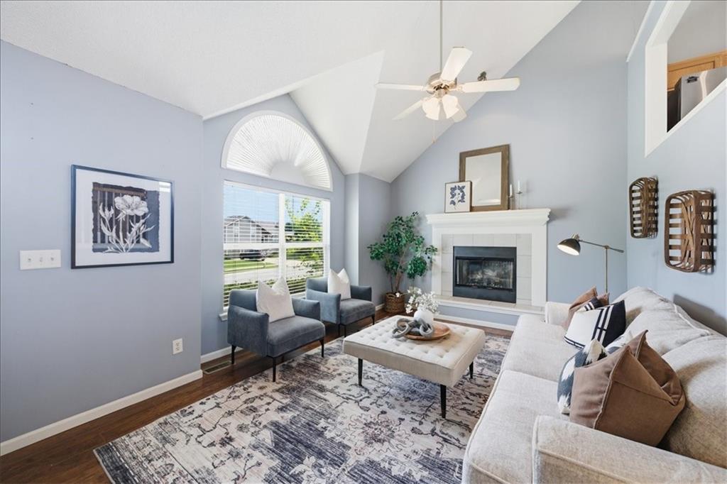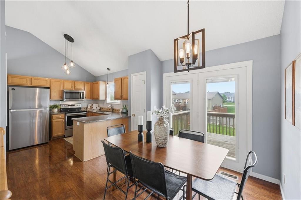 With an airy, open layout and soaring vaulted ceilings, this front-to-back split offers an inviting space that feels both spacious and comfortable from the moment you walk in. The main living area centers around a cozy fireplace and flows seamlessly into the kitchen and dining spaces, creating the perfect setting for everyday living and entertaining. The kitchen features elegant quartz countertops, a convenient pantry, and plenty of room to gather. Just off the dining area, step out onto the deck overlooking the fully fenced backyard, ideal for relaxing evenings, pets, or play. A patio below provides additional outdoor living space and easy access from the walkout basement. The primary suite also features a vaulted ceiling, along with generous double closets and a private en suite bath with a double vanity. The bright walkout basement with floor to ceiling windows adds flexibility for additional living space, recreation, or a home office while providing great indoor-outdoor flow to the patio and backyard. With thoughtful features, great natural light, and a fantastic Gardner location, this home offers comfort, space, and functionality all in one.