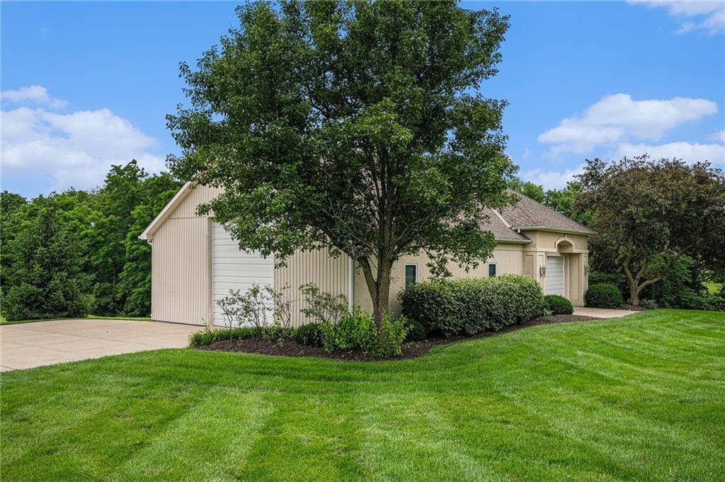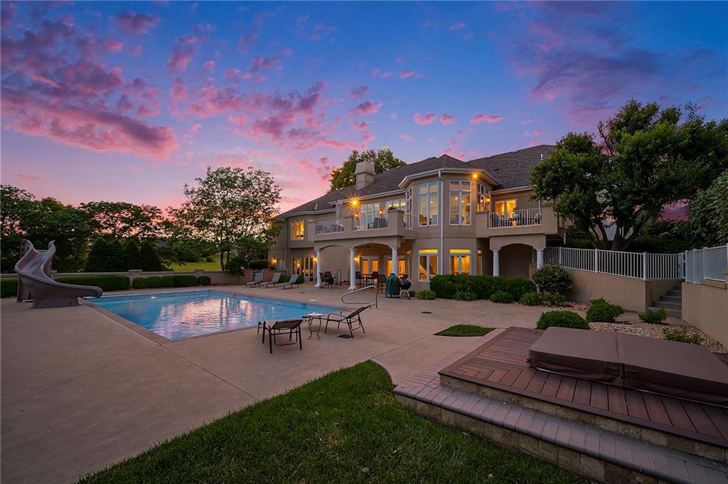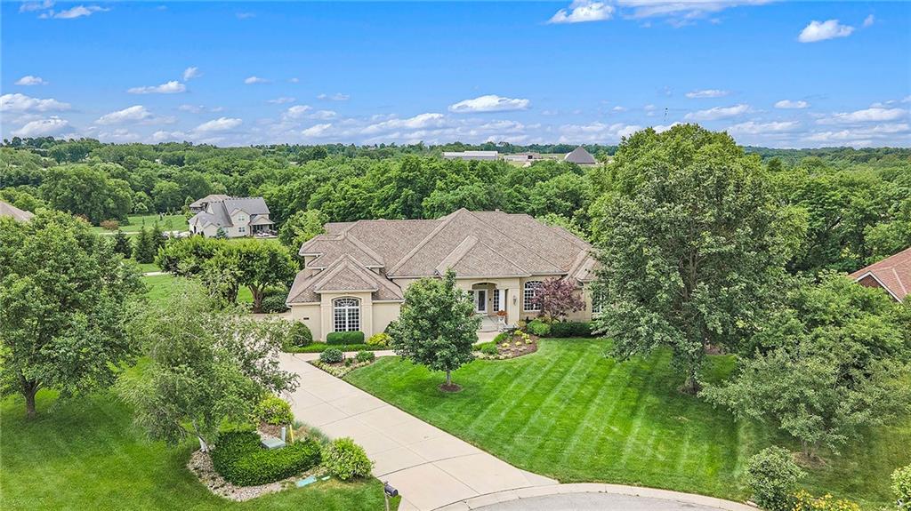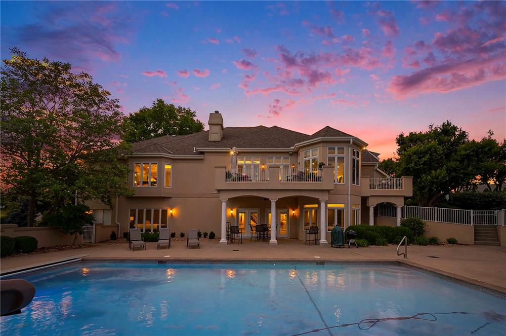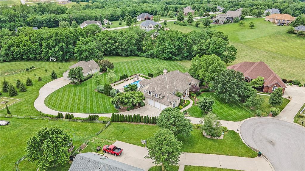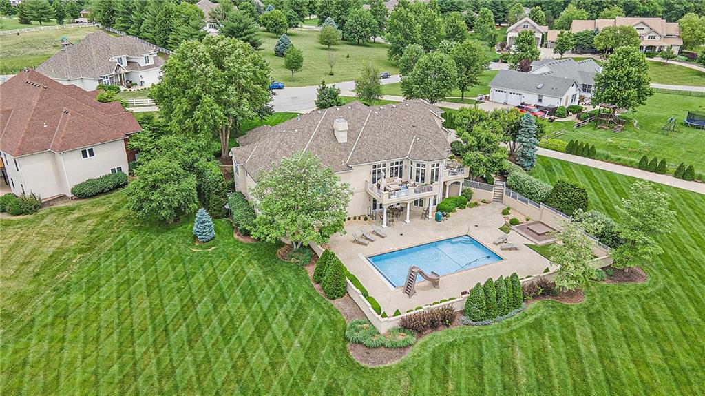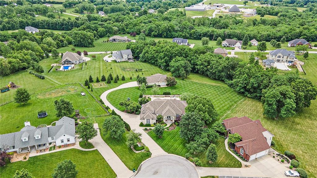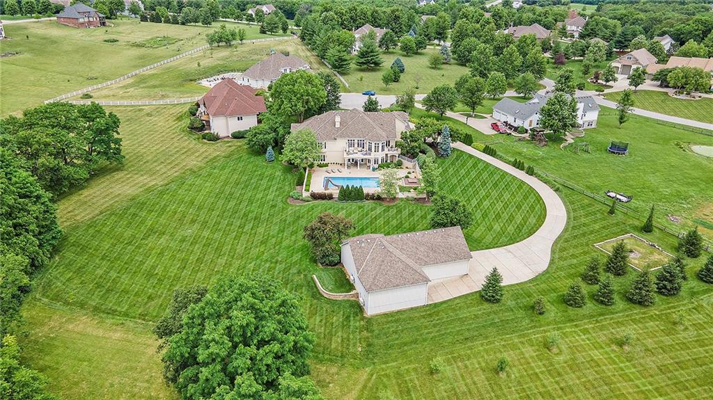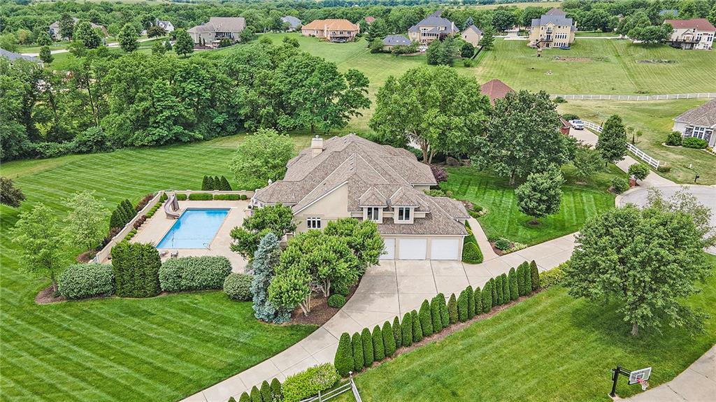 Experience tranquility and sophistication in this stunning 1.8-acre estate, ideally located just outside Kearney city limits and less than 30 minutes from downtown Kansas City, MO. Reimagined in 2021 by Portfolio Kitchen & Home, this home blends modern luxury with timeless elegance. Expansive floor-to-ceiling windows fill the main level with natural light while showcasing views of the sparkling 20’x40’ granite pool. The chef’s kitchen impresses with dual ovens, two Quartzite islands, a butler’s pantry with prep sink, Bosch and Wolf appliances, a wine refrigerator, hidden microwave and coffee station, and a spacious walk-in pantry. The lower level is perfect for entertaining, featuring a 128” projection screen with surround sound, custom wine cellar, sunken bar, exercise room, craft/dining area, and a large game space. A 60’x30’ outbuilding with an adjoining 28’x13’ RV bay includes heating, cooling, concrete floors, and a half bath. Refer to supplements for a complete list of additional features.