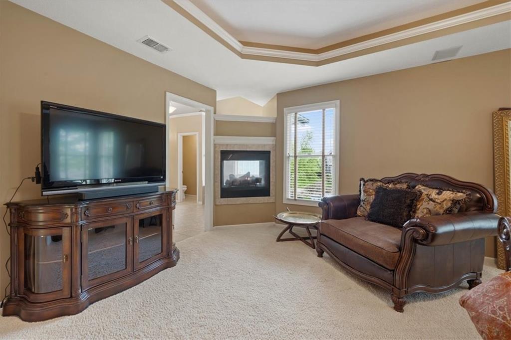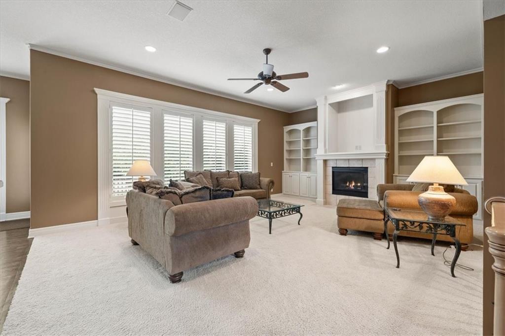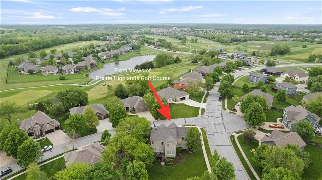 Welcome to this beautifully maintained, original-owner home in the Prairie Highlands Golf Course community, one of Kansas City's premier golf courses. This is not your typical floor plan—this custom designed home offers a distinctive layout and is presented in pristine, move-in ready condition. Offering 4 bedrooms, 4 full and 1 half baths, 4 fireplaces, finished basement and a 3-car garage. From the moment you enter, you’re greeted by a grand staircase, hardwood floors and a versatile formal living and dining space. A dedicated library/home office features built-ins, fireplace & hardwood floors. The open-concept kitchen is designed for function and gathering, walk-in pantry and connection to the breakfast area and great room—creating the true heart of the home. Upstairs, the primary suite is a retreat with a spa-inspired bath, including a walk-in shower with two shower heads, jacuzzi tub, see-through fireplace & walk-in closet. All four bedrooms are positioned along with a convenient laundry room, offering both privacy and practicality. The lower level is built for entertaining and everyday living, with daylight windows, a dedicated media room, family room with fireplace, and a well-appointed bar. Soaring 13-foot ceilings offer a full recreation setup—featuring a basketball goal and space for a future golf simulator—plus a stone-accented wine tasting room for an upscale finish. Outdoor living is equally impressive. A newer composite deck with built in lighting overlooks a beautifully landscaped yard complete with low-maintenance beds, exterior lighting, SONOS sound system & irrigation system. Roof was replaced in 2025. Additional highlights include custom blinds, plantation shutters, fountain & SONOS sound system for interior and exterior. Located within Prairie Highlands, residents enjoy a community pool, an active neighborhood lifestyle, and the convenience of an on-site restaurant & bar open to the public. Golf course access is available with membership.