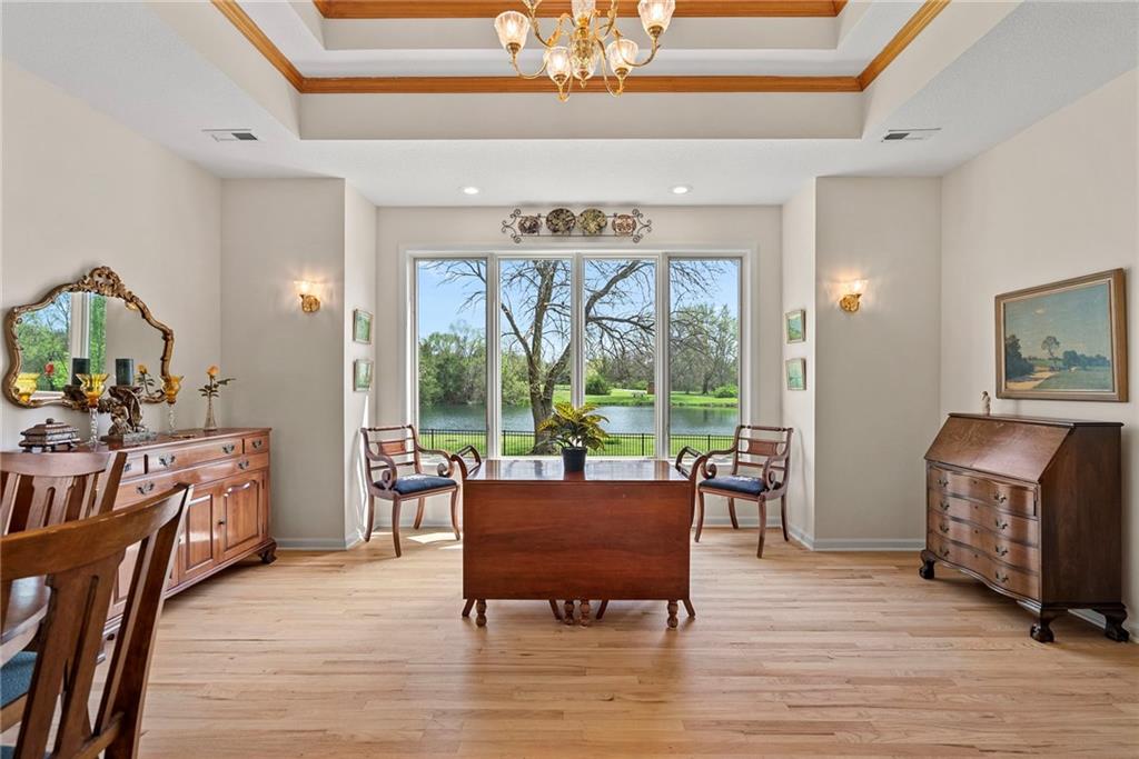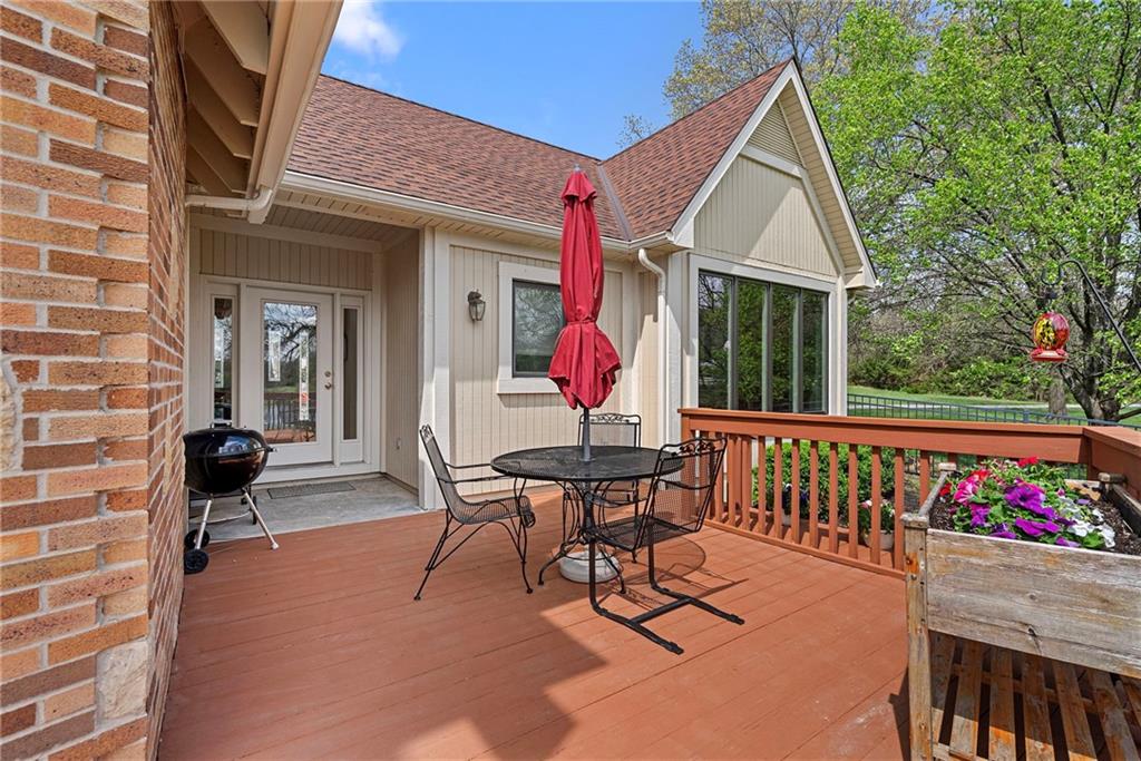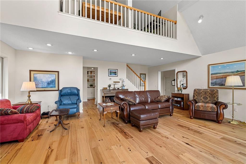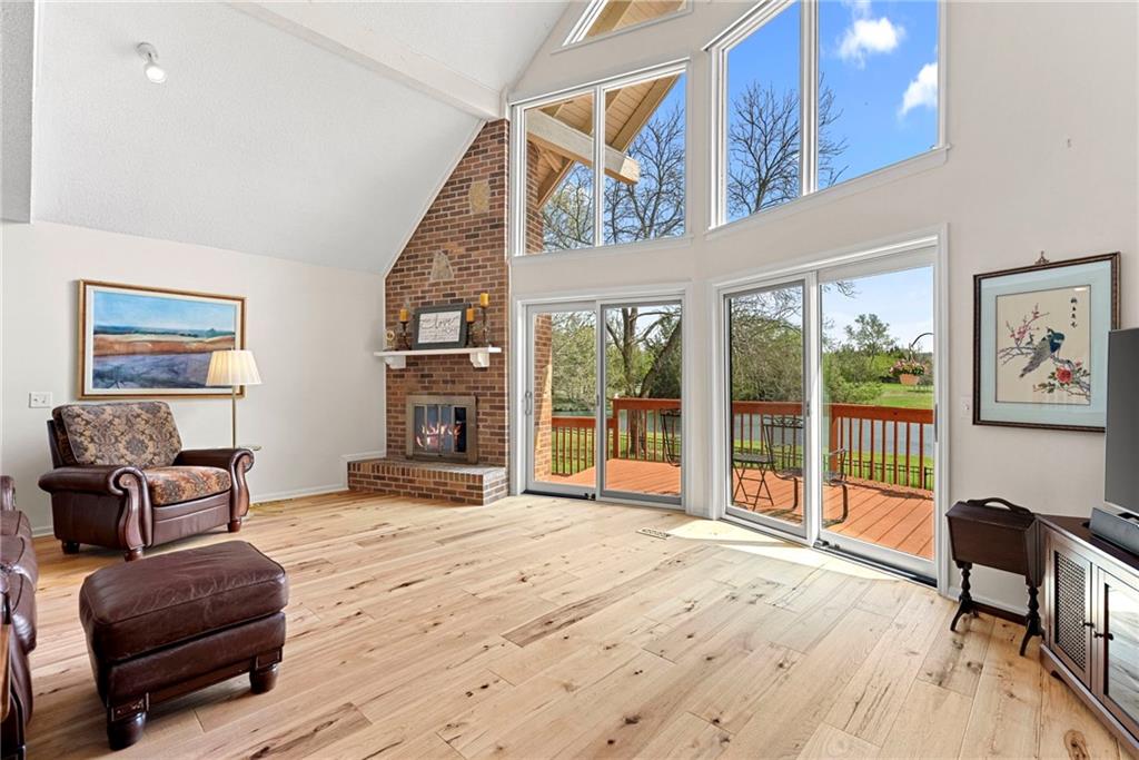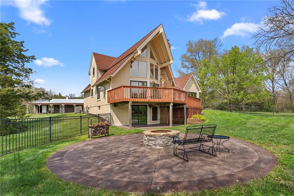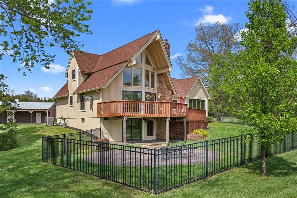 Discover a true private retreat in this one-of-a-kind A-frame estate, tucked away in a private 8-acre park-like setting just minutes from Hillsdale Lake. Designed to honor the land, this residence harmonizes rustic soul with modern functionality, offering a level of seclusion and beauty that is impossible to replicate. The heart of the home is the soaring, light-filled A-frame living area, where floor-to-ceiling windows frame incredible views of the pond and surrounding nature. This space is anchored by a majestic fireplace featuring a recently restored lifetime-warrantied flue system. The modern kitchen addition serves as a perfect bridge between the home’s original character and today’s needs, boasting custom cabinetry, double ovens, and 2021 granite surfaces. The upper level serves as a versatile getaway, featuring a full bathroom, a large bedroom, and a private landing that functions as a unique "balcony" office or nursery space. From this vantage point, you can work or relax while taking in the same expansive views from a higher perspective. For equestrian enthusiasts and hobbyists, the property features a riding arena expertly graded for drainage, an equestrian barn with 3 tongue-in-groove horse stalls, a tack room, and a shop area with reinforced concrete floors. The estate is further enhanced by a chicken coop, an aviary, and established black raspberry bushes. This meticulously maintained home offers peace of mind with a 2021 roof, dual HVAC systems under warranty, and most windows replaced in 2020-21. Located with incredible accessibility to the KC Metro, this is a rare opportunity to own a lifestyle of total privacy and architectural character without compromise.