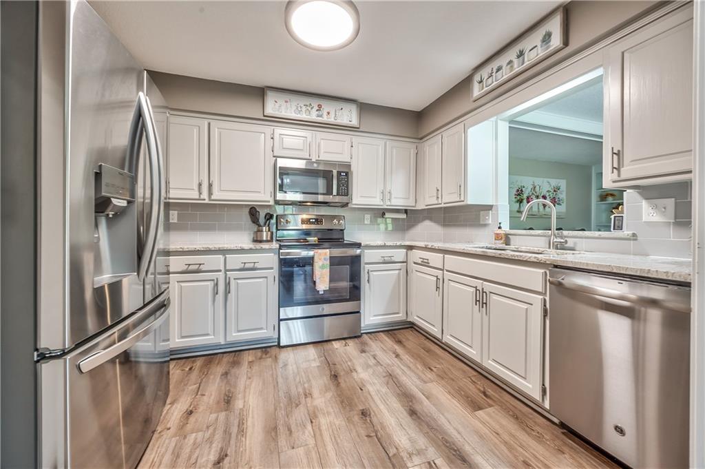 One level living** NO STAIRS** Exceptional unit, newer SS appliances, WD included, Newer paint, popcorn ceiling removed! This seller had everything refreshed and renovated before moving in. Granite counter tops accent the fresh white cabinets and tile backsplash, with a convenient pass through to the family room. The LVP greets you at the entry, down the hall and completes the kitchen and dining area. Nothing to do, **Move in ready*** Great area with Library, city park and pool on Johnson Dr. HOA go to: www.mylakeviewhoa.org for info