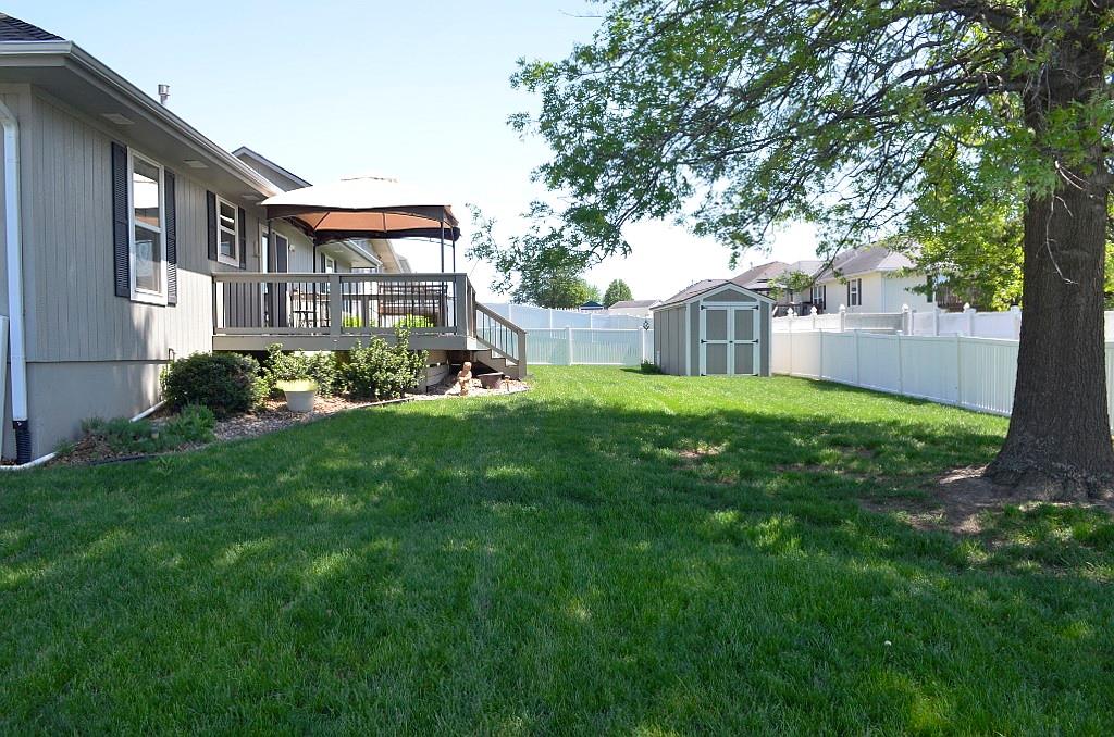 This meticulously maintained home shines with pride of ownership and offers the ease of true single-level living. The thoughtfully designed floor plan provides exceptional privacy, with the spacious primary suite set apart from bedrooms two and three at the opposite end of the home. Convenience abounds with main-level laundry tucked neatly into a generous closet just off the dining area. The kitchen is both bright and functional, featuring crisp white appliances and an efficient layout that makes everyday cooking feel effortless. Step outside to an oversized deck complete with a canopy—perfect for relaxing or entertaining throughout the spring and summer months. The fully fenced backyard, enclosed by a charming white fence, offers both shade and plenty of space to enjoy the outdoors. A coordinating storage shed provides ideal space for tools and seasonal items. Situated on a beautifully landscaped corner lot, the property is framed by mature, stately trees that enhance its curb appeal and sense of tranquility.