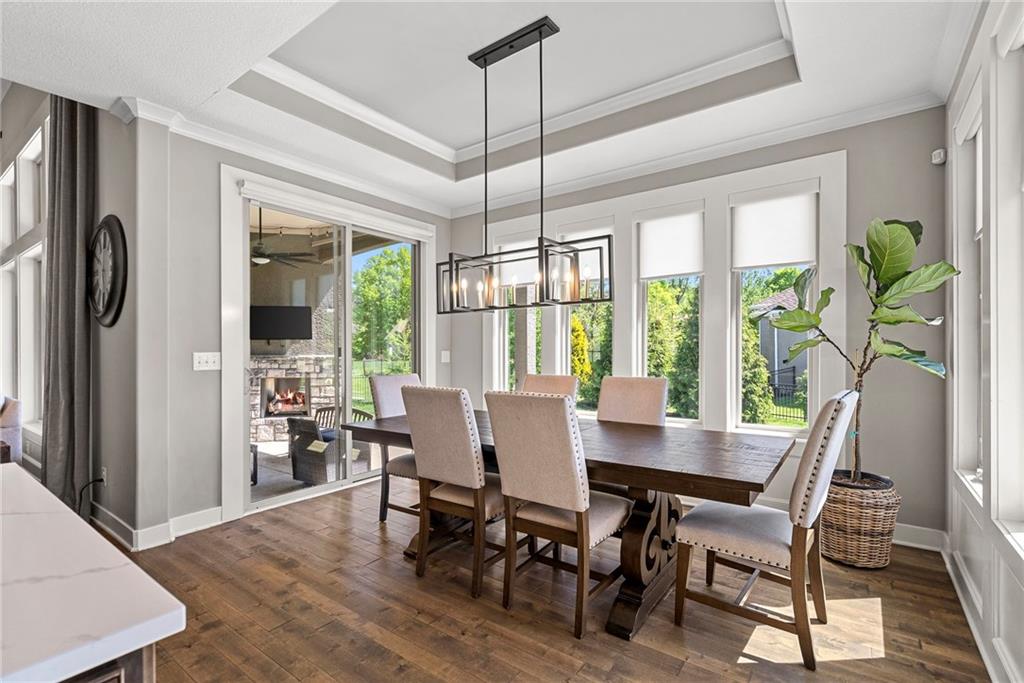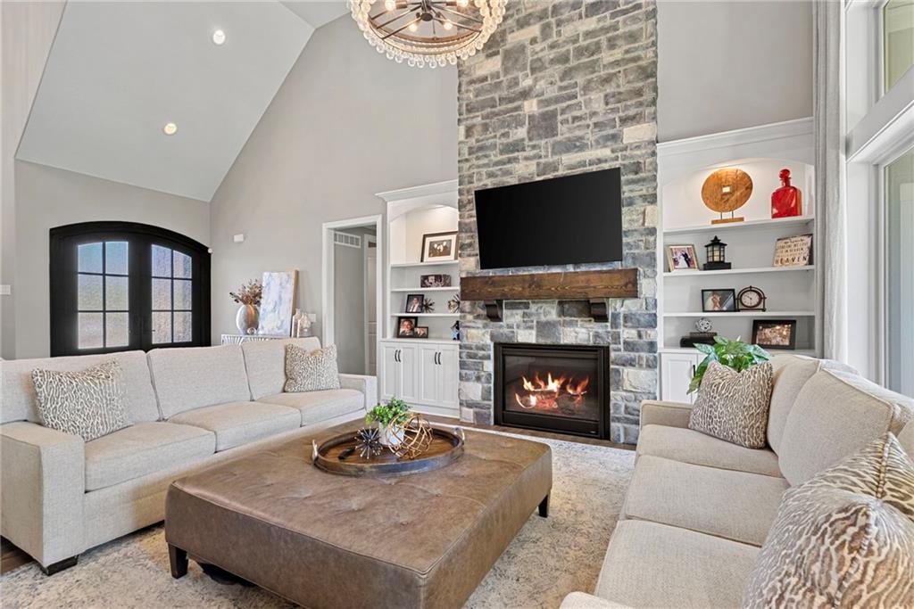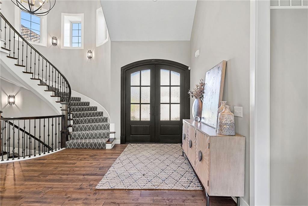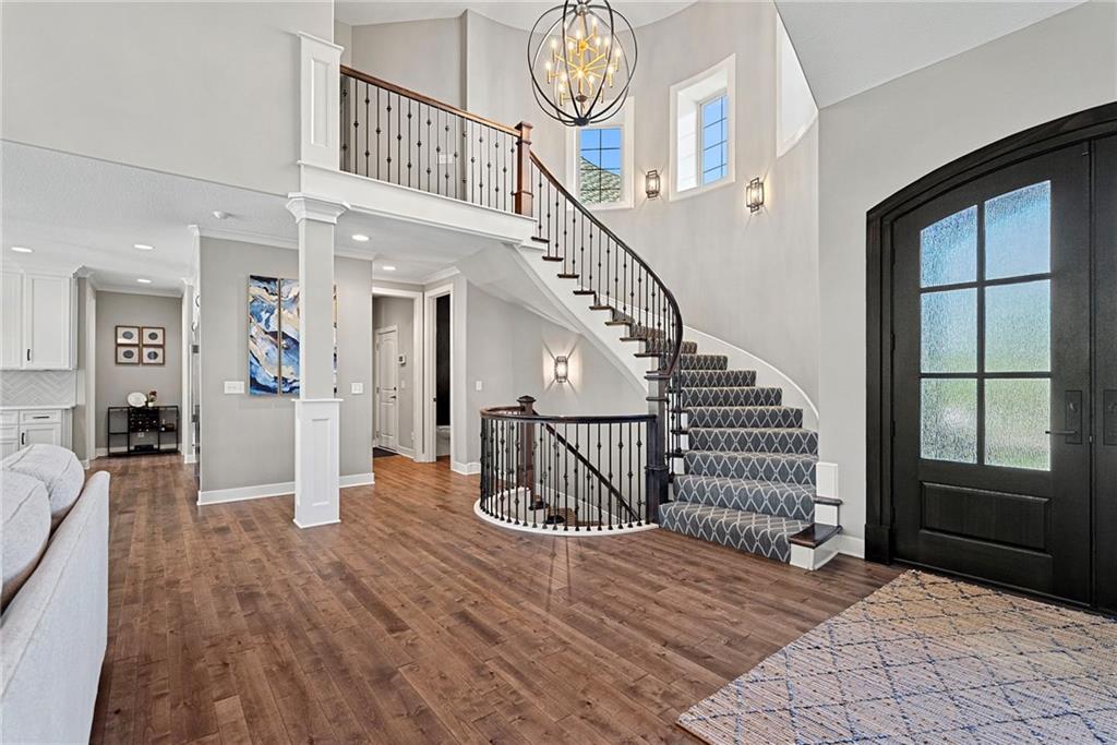 Welcome to 2604 W 162nd Terrace in Overland Park—where timeless design meets a fresh, elevated feel in River Ridge Farms. Situated on a large corner lot, this stunning 1.5-story home makes an immediate impression with its beautiful stone-front exterior and oversized side-entry 3-car garage—effortless curb appeal with a polished, luxury presence. Inside, rich wood floors span the entire main level, leading you through a light-filled, open-concept layout designed for both everyday living and entertaining. The two-story living room is a showpiece—flooded with natural light and anchored by a gas fireplace flanked by custom built-ins. The kitchen truly delivers, with timeless details, featuring a large center island, Sub-Zero refrigerator, gas range, double ovens, and an expansive walk-in pantry. Just behind the kitchen, a private main-floor office is perfectly tucked away—ideal for work-from-home without sacrificing connection to the heart of the home. One of the standout moments is the stunning 2-story curved staircase—a focal point that brings a sense of elegance and flow throughout all levels. The finished lower level is built for hosting, complete with a wet bar, spacious rec room, and a cozy media area perfect for movie nights or game days. Upstairs, a loft space offers additional flexibility, while three generously sized bedrooms each feature their own private en-suite bath and walk-in closet—providing comfort, privacy, and functionality for everyone. Step outside to a fully fenced backyard designed for year-round enjoyment. The covered patio with fireplace creates the perfect setting to unwind or entertain, with plenty of space and seating area for those perfect Kansas evenings. This home seamlessly blends luxury, function, and style—delivering the elevated lifestyle today’s buyers are looking for in one of Overland Park’s most desirable locations.