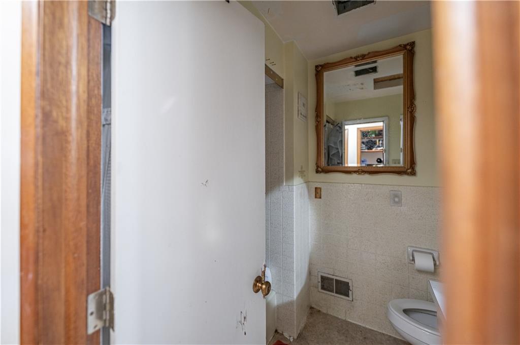 Bathroom featuring a decorative framed mirror, textured wall tiling, and a white toilet
