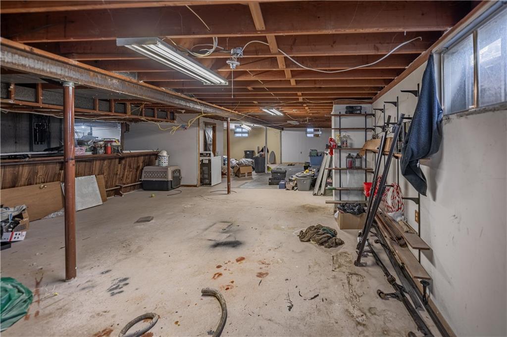Spacious unfinished basement with exposed wood joist ceiling, concrete flooring, and multiple support columns