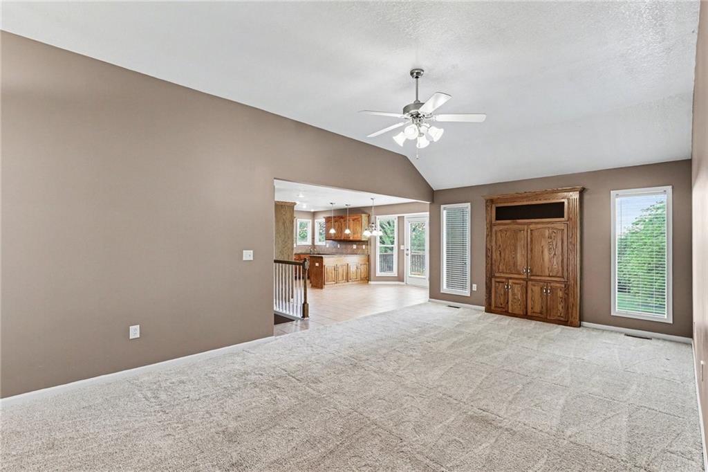Step into this home and you’re welcomed by a spacious living room with vaulted ceilings and large windows that fill the space with natural light. A built-in feature offers hidden storage for a TV, keeping the room both functional and sleek. The living area flows into a large kitchen featuring classic wood cabinetry, stainless steel appliances, and additional windows for an open, airy feel. Just off the kitchen, you’ll find the dining area with direct access to the expansive deck—perfect for entertaining or relaxing outdoors. Nearby, the laundry room offers convenient access to the garage. Down the hall from the living room is the primary bedroom, complete with a walk-in closet and a private full bathroom. A guest bedroom and an additional full bathroom are also located on this level. The finished basement features a generous family room with large windows and walk-out access to the backyard. This level also includes two additional bedrooms, a full bathroom, and a spacious storage room. Outside, the large backyard is lined with mature trees and backs to an open lot, offering peaceful views and added privacy.