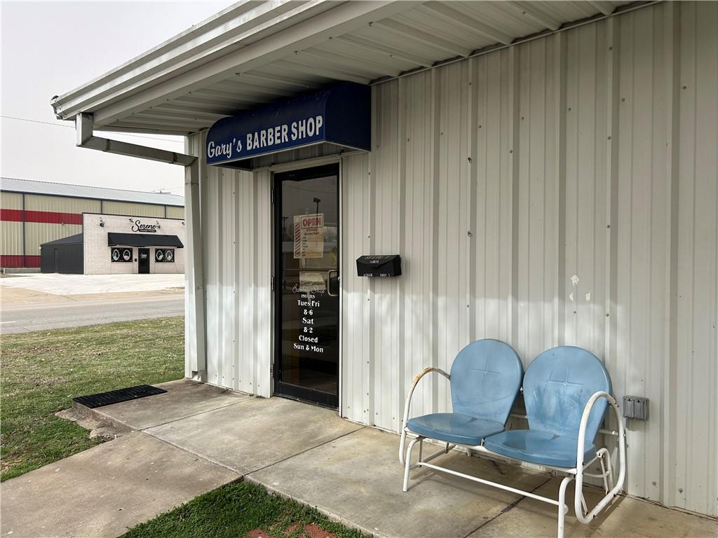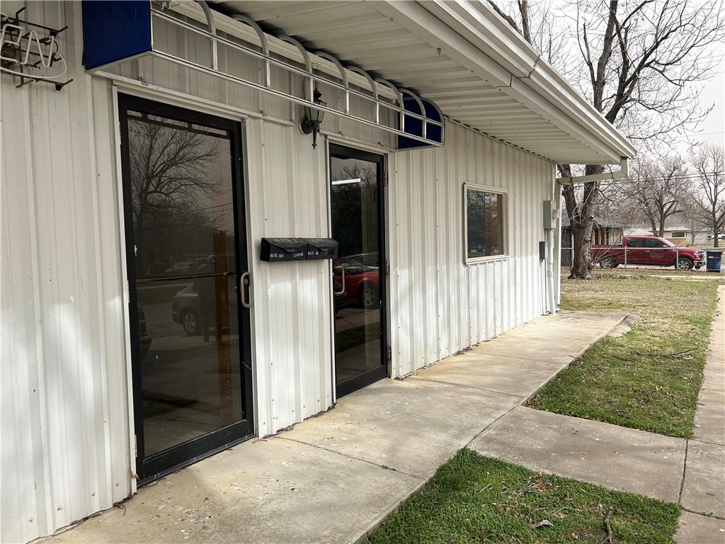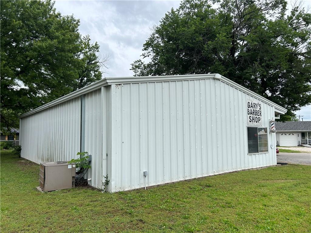 Commercial building with corrugated metal siding, featuring a window and exterior signage