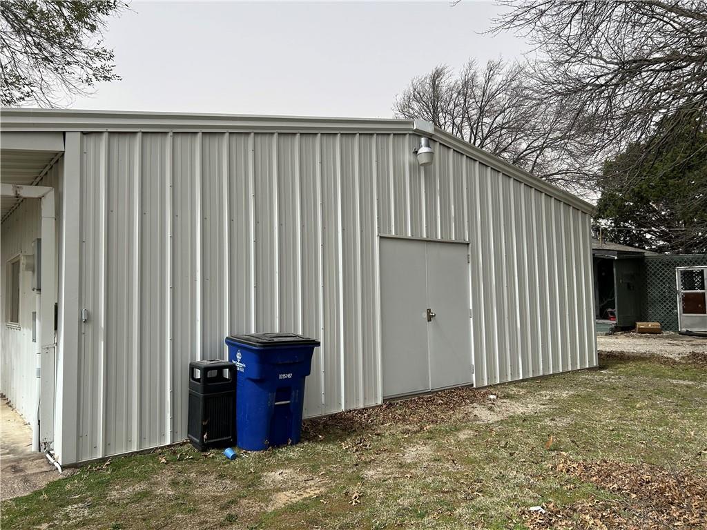 Corrugated metal building featuring a double entry door and exterior lighting fixture