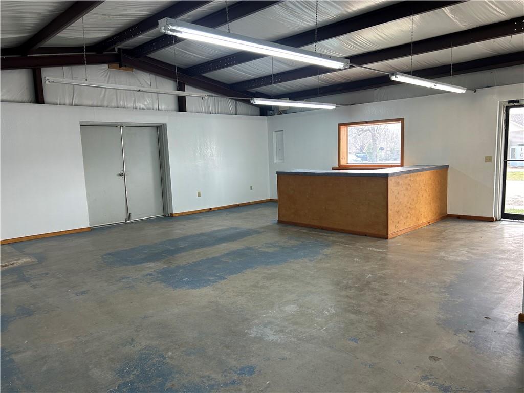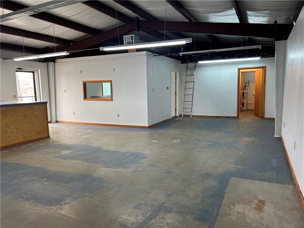 Spacious commercial interior featuring a metal beam ceiling, exposed rafters, and white walls with wood trim