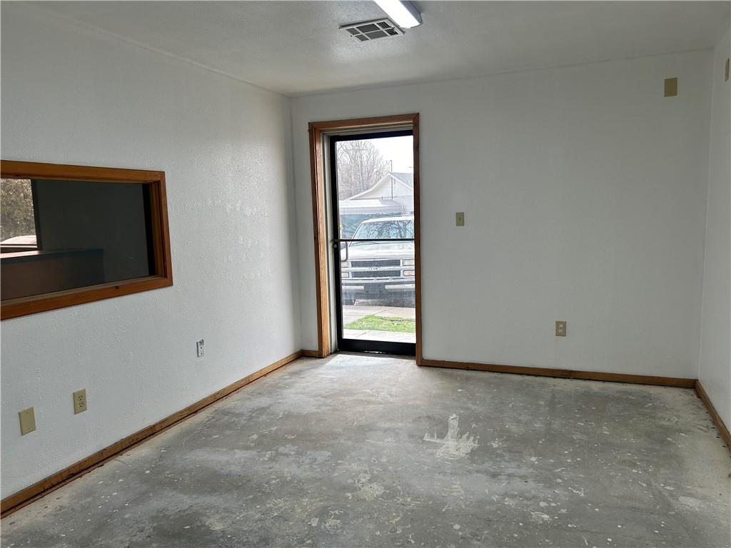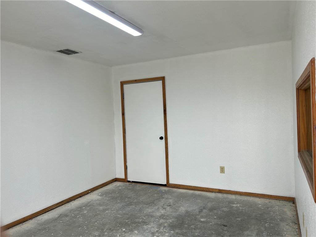 Interior space featuring a white painted door with wood trim, a wood-framed window opening, and a concrete floor