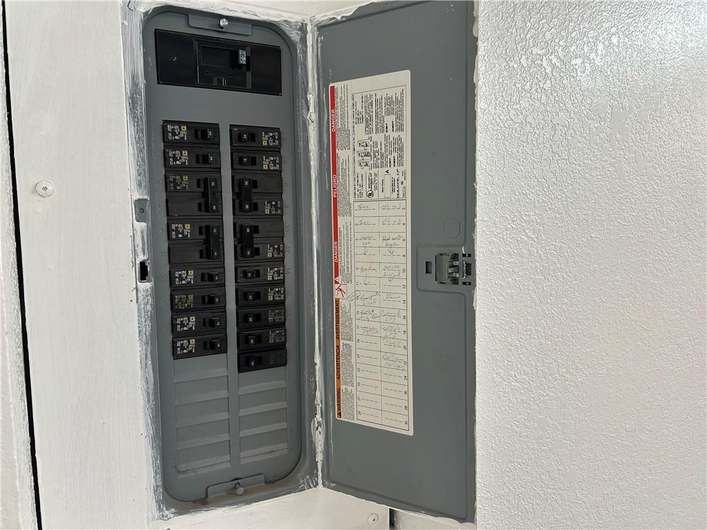 Electrical panel with multiple circuit breakers, mounted within a painted wall recess