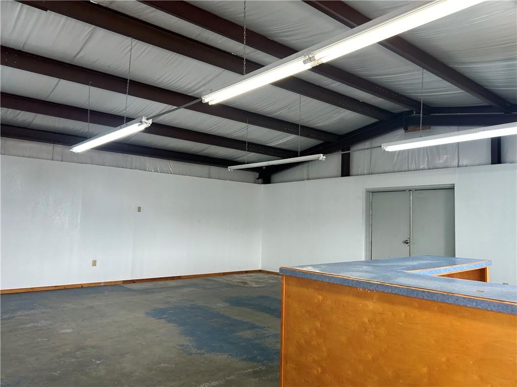 Open commercial space featuring exposed ceiling beams and fluorescent lighting