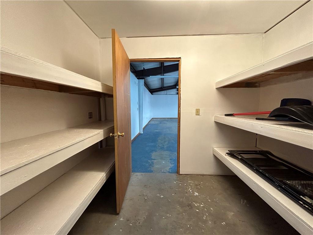 Room featuring built-in shelving, concrete flooring, and a natural wood door opening to an additional space