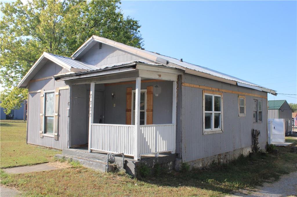 View of side of home with a yard and covered porch