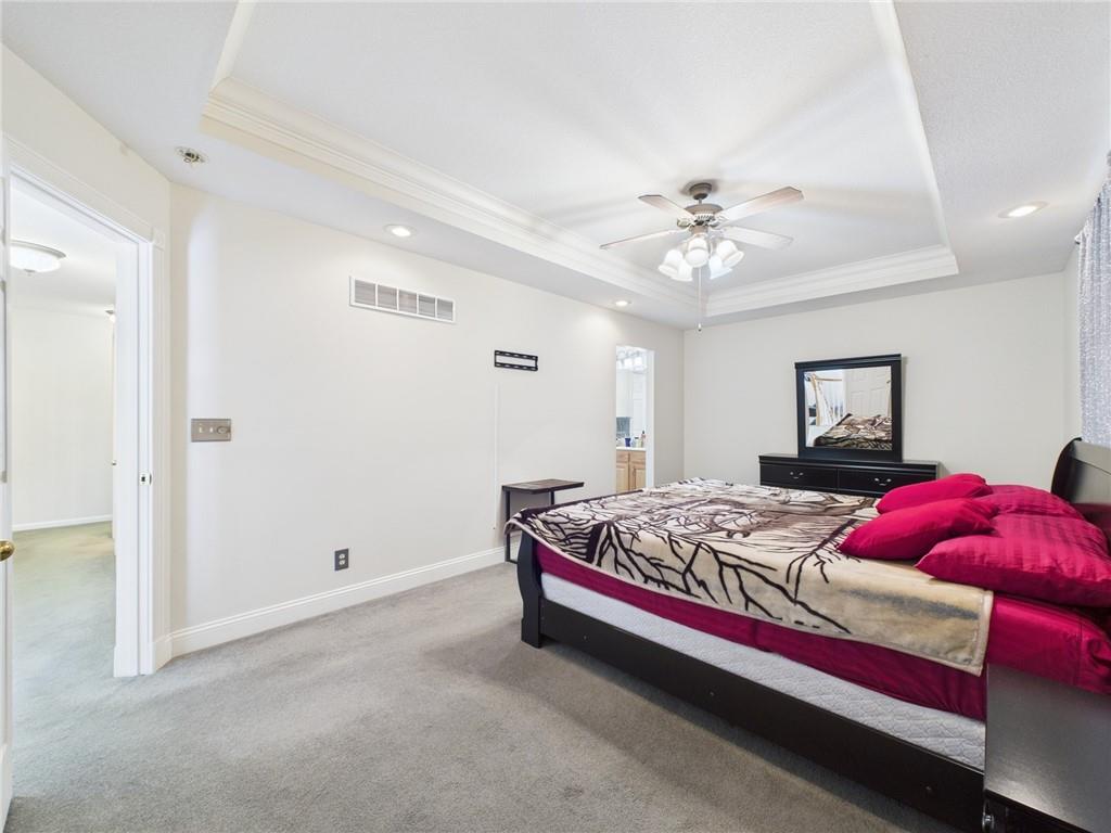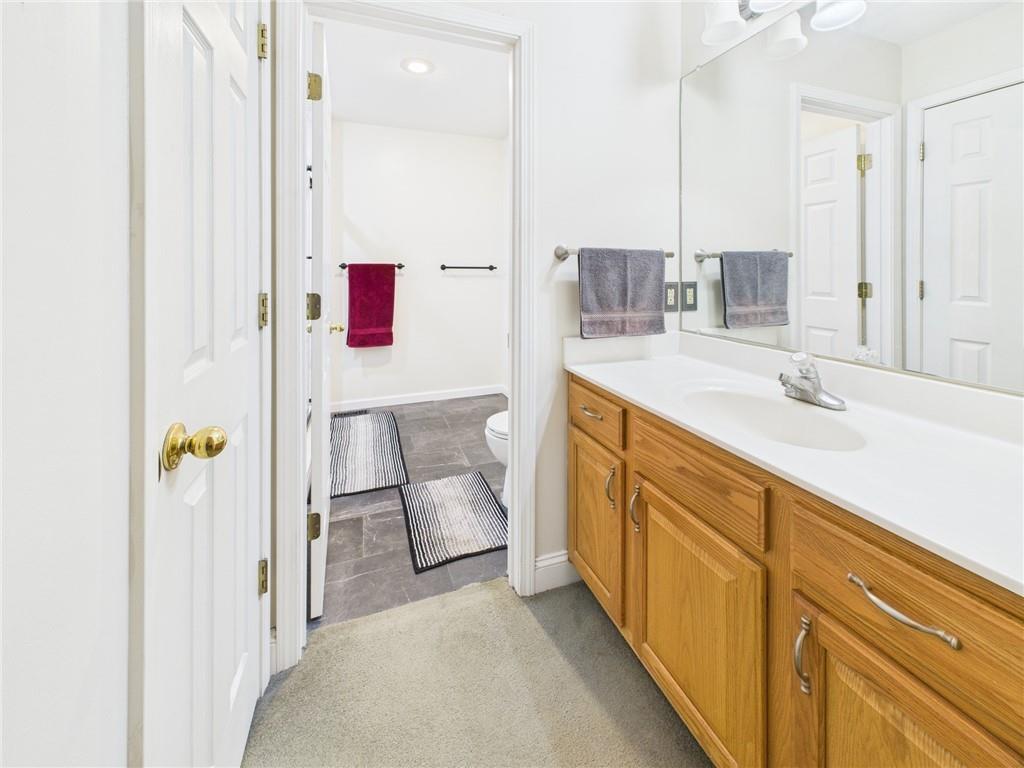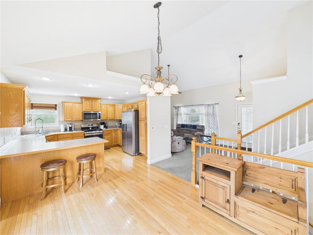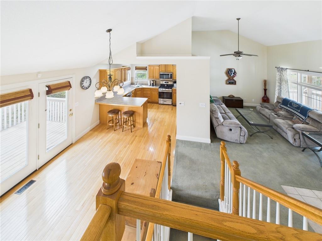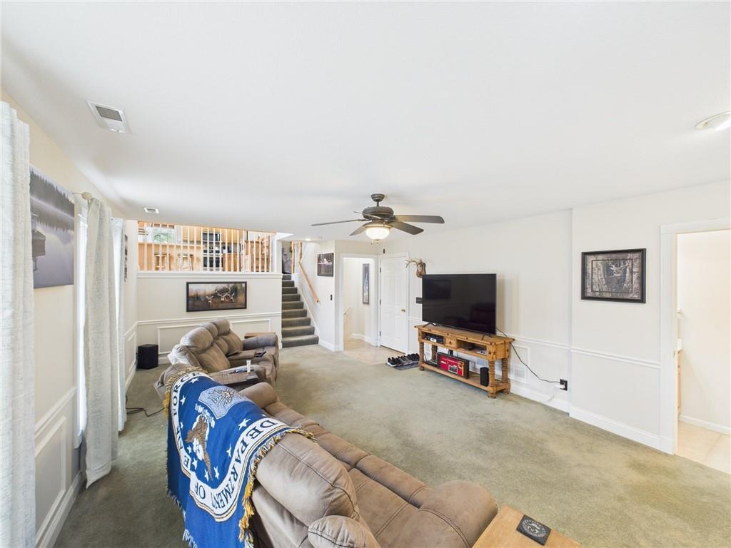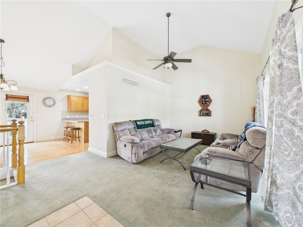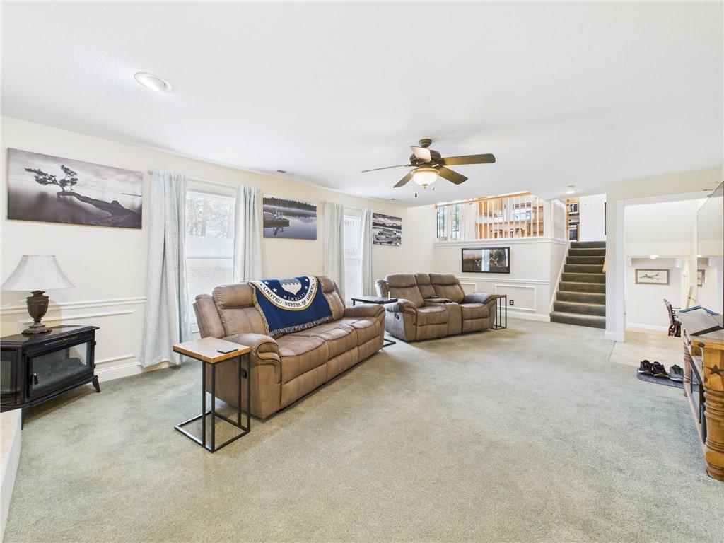 Ride your golf cart to the golf course from your new home! When your done at the golf course, come back to celebrate & entertain your friends with the unique bar setup on the lower floor! This home has 3 spacious bedrooms, 2.5 bathrooms and also has 2 living rooms! Enjoy stunning sunsets from the spacious, covered front porch—perfect for relaxing evenings. The newly updated kitchen boasts stainless steel appliances, peninsula, large amount of cabinets and counter space. The eat-in area that overlooks the living room below—ideal for hosting and staying connected. All three bedrooms & laundry area are conveniently located on one level. The primary suite is generously sized with a walk-in closet and a gorgeous en-suite bathroom featuring a large tiled shower with a glass door and stylish tile flooring. The additional two bedrooms are nicely sized with large walk-in closets, and a full hall bathroom completes the upper floor. The mid-lower level offers easy access to the HUGE 3 car garage, a half bath, and a spacious second living area and a cozy fireplace.—perfect for a cozy night in or entertaining guests. Head down to the finished basement, where you'll find a wet bar, dedicated entertaining space, walk-out access to the backyard, and a HUGE storage room. This home truly has it all—space, style, and functionality.