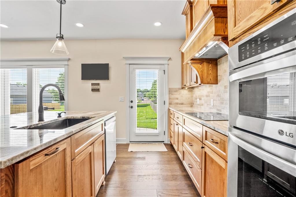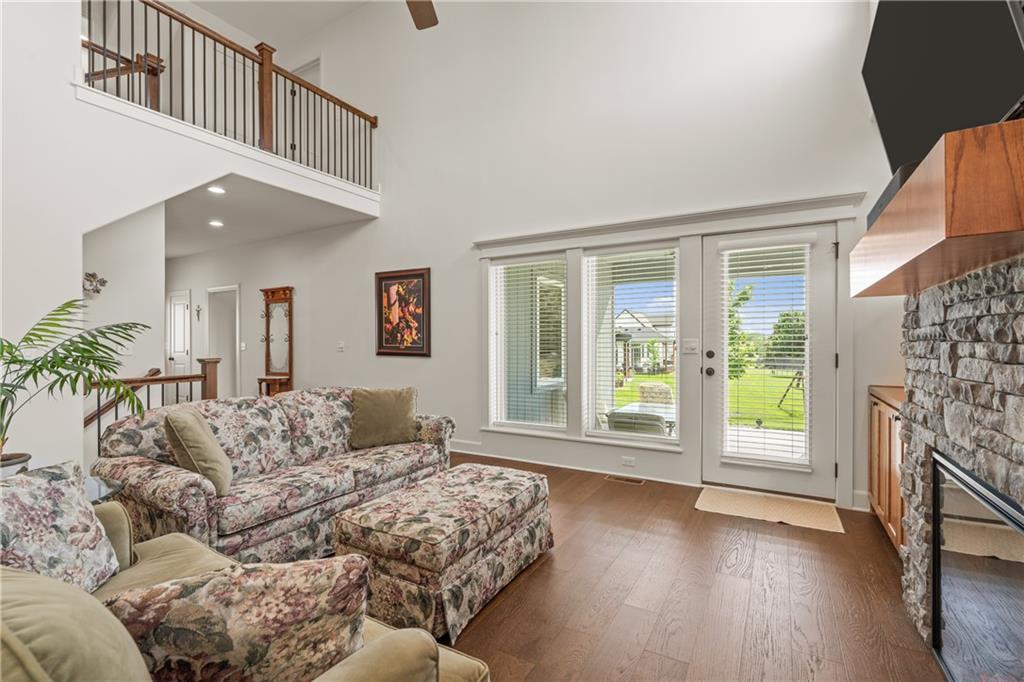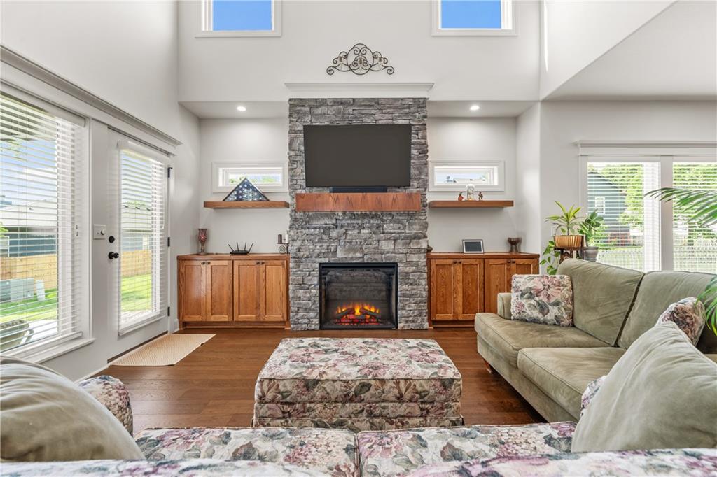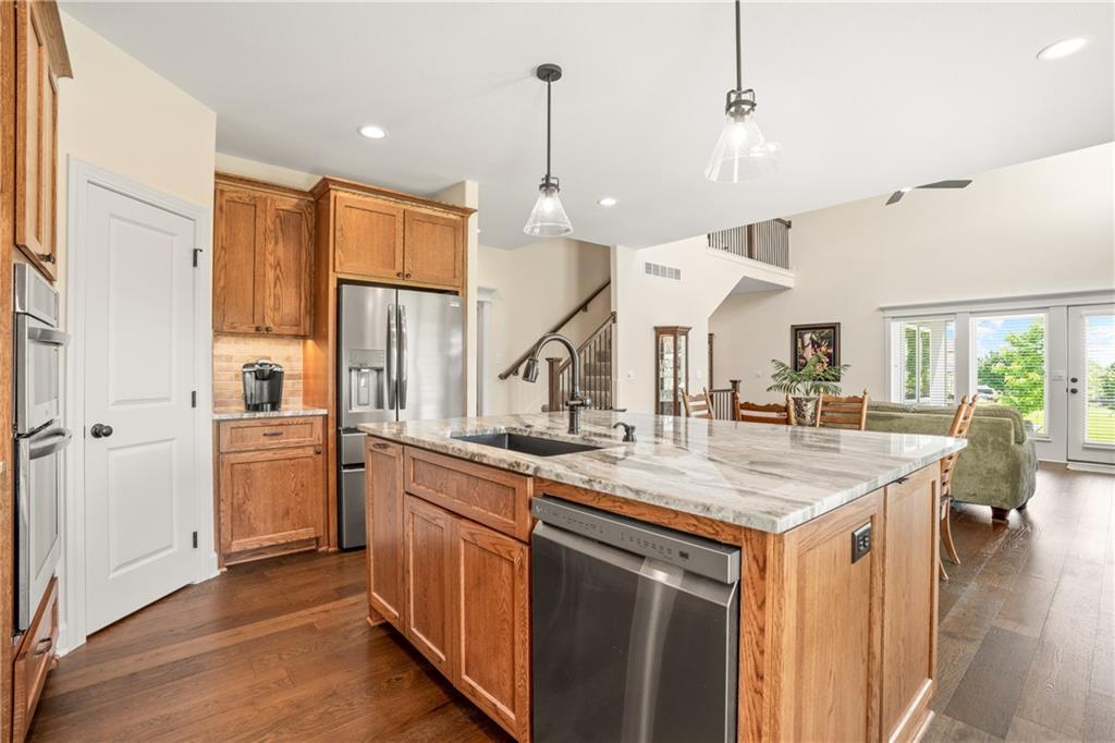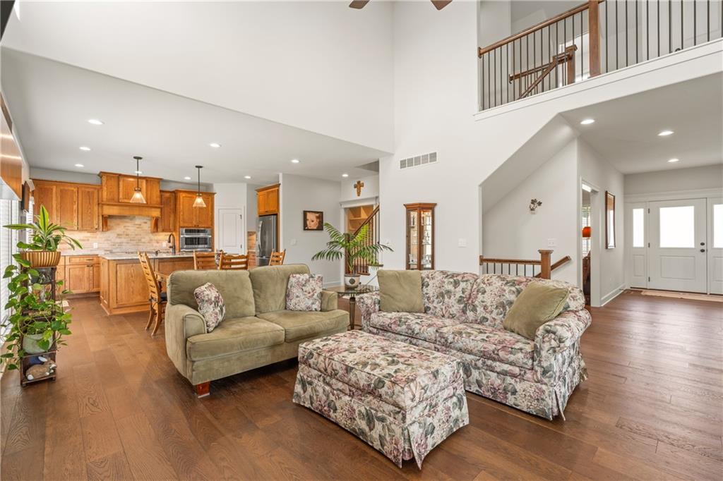 Experience small-town luxury in this stunning custom 1.5-story smart home, located on a quiet cul-de-sac. Thoughtfully designed and nearly new, this residence blends contemporary style with high-end features and energy-efficient systems! Striking exterior finishes include clapboard, shake siding, decorative stucco, stonework, soffit lighting, and professional landscaping. Enjoy a covered patio for morning coffee and a second open patio ideal for entertaining, connected by stone pavers and a walkway to the garage. Inside, the open floor plan features soaring ceilings, large casement windows, and a 9’ stone fireplace flanked by built-ins. Premium hardwood floors run throughout the main living spaces. The gourmet kitchen is a chef’s dream with granite countertops, a large island with seating, walk-in pantry, WiFi-enabled LG appliances, restaurant-style vent hood, and soft-close white oak-stained cabinets. A flex room off the main living area makes an ideal home office. The spa-like primary suite offers a tray ceiling with cove lighting, walk-in rainfall shower with bench, dual granite vanities, and a custom walk-in closet connected to the laundry room. Upstairs are two bedrooms, a dual vanity full bath, and a loft overlooking the great room. The finished basement includes a 4th bedroom with ensuite bath, a large rec room, wet bar, kitchenette, and oversized unfinished flex space. The oversized 3-car garage includes WiFi-enabled doors and a built-in sink. Smart features include Cat 5 wiring, dual-zone HVAC with humidity control, WiFi lighting, and an 8-zone Rain Bird irrigation system and a Sonos audio system on patios. Generator-ready and pre-wired for solar. Located steps from trails, a 4-acre park, shops, and dining. Just minutes to Hillsdale Lake and Sycamore Ridge Golf Course. Schedule your showing today!