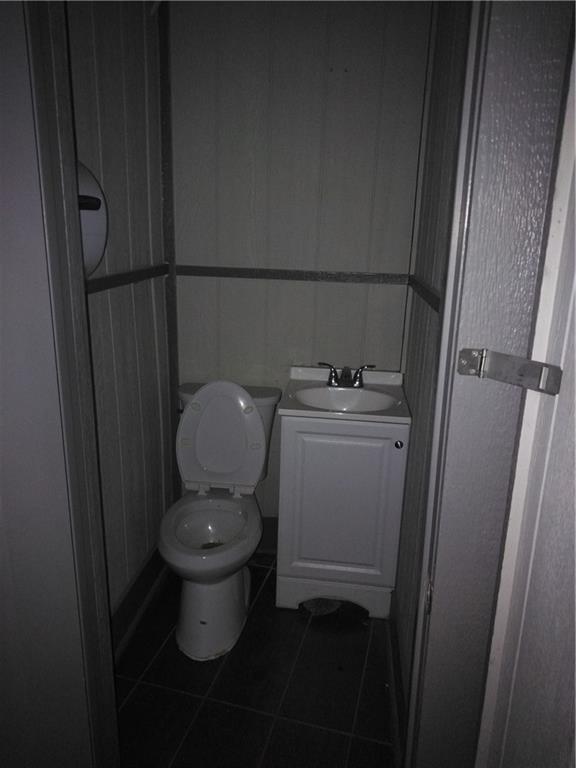 Bathroom featuring tile patterned floors, toilet, vanity, and a decorative wall