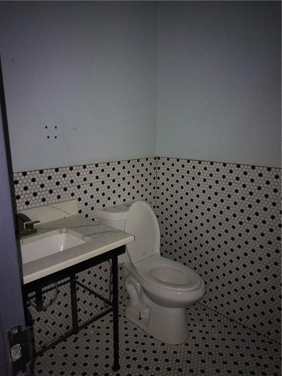 Bathroom with toilet, wainscoting, tile walls, a sink, and tile patterned flooring