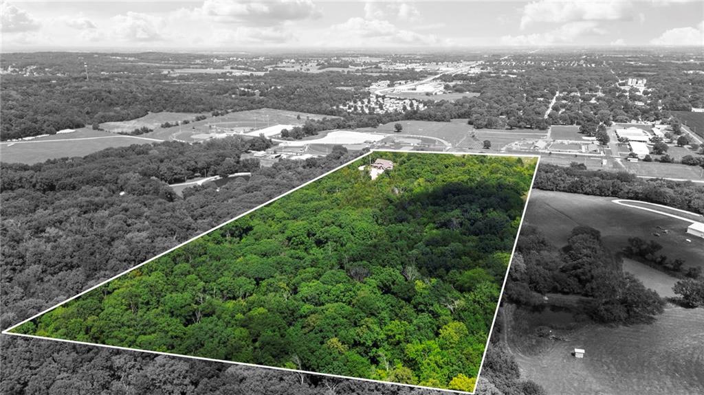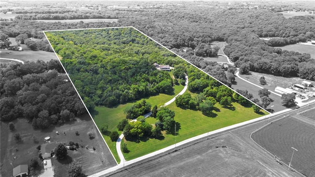 New Price! New Roof! New Covered Outdoor Patio Entertainment Space! Stunning 1.5 story 4-bedrm 3 bath nestled atop the highest point of 25+ breathtaking wooded acres in Tonganoxie, Kansas. This home combines modern custom design with high-end finishes throughout. Soaring tongue and groove vaulted ceiling with Knotty Pine Hand Scraped finish and architectural details throughout creating a sense of warmth and style. Sunlight pours into the great room through a wall of windows, offering picturesque views. This home has a landscaped terrain located on the south side connecting with an exterior wall. Main level includes an open concept foyer entryway, formal dining room, a gourmet kitchen equipped with a gas cooktop, built-in double oven and microwave, walk-in pantry, granite countertops and island. A sunlit eat-in kitchen with access to sunroom and patio. A bonus room which can be used as an office or non-conforming bedroom. Kitchen and dining room open to a great room with a floor to ceiling natural stone wood insert fireplace. The main-level primary master offers an en-suite featuring a double vanity, tiled walk-in shower, and whirlpool tub. Upstairs, on the main north wing a 17x17 family room loft with panoramic views of the city's skyline. Three 9 ft. ceiling bedrooms with walk-in closets, and a hallway bathroom with walk-in shower and separate jetted tub. You will be captivated with 2 unique living areas, a north wing, the primary living area and a separate south wing featuring a 31x25 rec room. With a second access mudroom hallway entrance that includes a laundry room full bathroom. Property features include a 30x48 shop with electricity, a concrete floor, and 12 ft. garage door. Additional features include a zoned geothermal system supplied by 3 wells, concrete storm shelter, and electric service that has an existing exterior disconnect to add a generator. Situated close to I-70, K-10, and 24-40 with convenient access to Leavenworth, Lawrence, Kansas City.