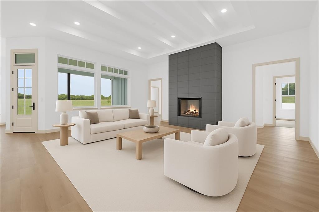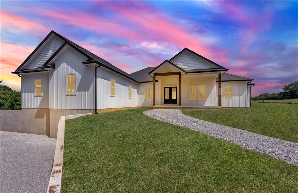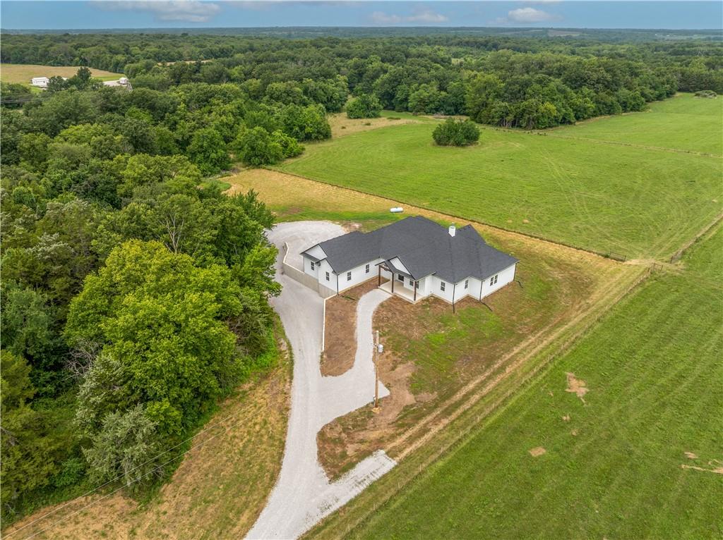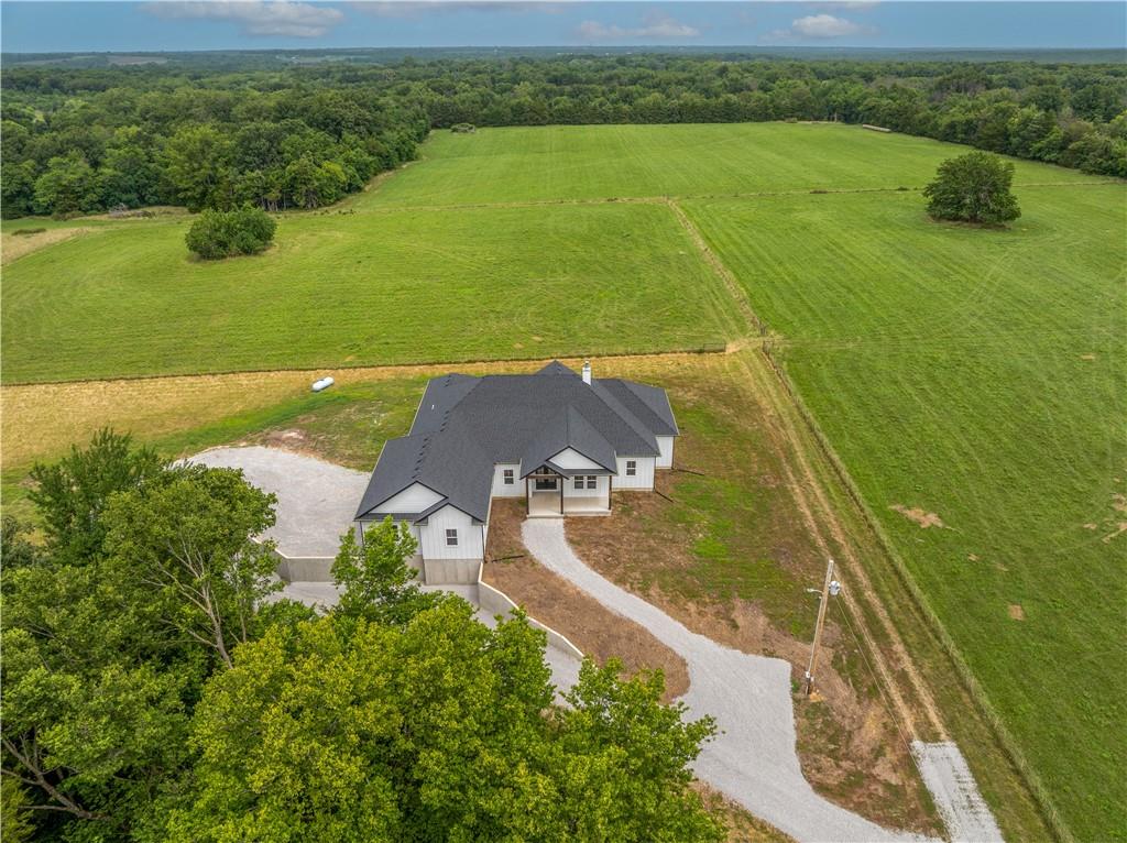 Welcome to 19657 Mather Rd—a residence that redefines luxury country living. Built in 2025 with exceptional attention to detail, this 5-bedroom, 3.5-bath custom masterpiece sits on 5 peaceful, unrestricted acres, just minutes from downtown Sedalia. From the moment you enter, the home makes a statement: soaring 10', 11', and 12' ceilings, tray ceilings with exposed beams, and a Napoleon wood-burning fireplace with tile running to the ceiling. Every finish was hand-selected to deliver both warmth and elegance. The designer kitchen features an oversized island, double ovens, quartz and granite countertops, custom cabinetry, and a walk-in pantry complete with butcher block counters and custom shelving. The open-concept dining area flows effortlessly to a spacious patio, ideal for outdoor entertaining. The primary suite is a private sanctuary, offering a spa-caliber bath with a freestanding soaking tub, an oversized walk-in shower, dual vanities, and heated floors for a daily dose of comfort and luxury. A dedicated office with French doors provides quiet flexibility, and the 1000sqft garage with 10' doors offers generous space for oversized vehicles or hobbies. Built for performance as much as beauty, the home includes a tankless water heater, dual-fuel HVAC system (electric + propane), and cellulose insulation for energy efficiency year-round. No HOA. No restrictions. No compromises. This is the lifestyle you've been waiting for—luxury, privacy, and freedom in one truly exceptional home. Schedule your private tour today. Homes like this don't come around often!