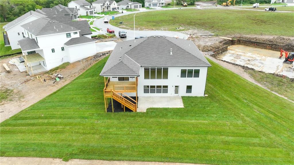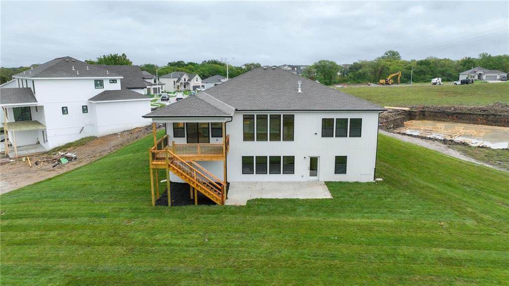 MOVE-IN READY! The Ashton by Hearthside Homes – Reverse 1.5 Story on a Walkout Cul-de-Sac Lot in Cadence. This thoughtfully designed home offers over 3,100 sq ft of elevated living with 4 bedrooms and 3 full baths, blending comfort, craftsmanship, and modern design. The open main level features vaulted ceilings with white oak box beams, wide-plank hardwood floors, and a striking black tile fireplace. The kitchen impresses with quartz countertops, built-in appliances, an expansive island, range hood, under-cabinet lighting, and a black Silgranit sink—balancing form and function. The primary suite delivers a true retreat. The luxurious bath features a beautifully designed wet area with both a soaking tub and a tiled shower—offering a spa-like experience—plus dual vanities and a large walk-in closet. The main-floor office with custom cabinetry and floating shelves provides an ideal workspace. The finished walkout lower level includes a spacious rec room with wet bar, two bedrooms with walk-in closets, and a full bath. Upgrades include an I-joist floor system for solid, quiet floors, black windows, a 16x12 covered deck, and an oversized patio overlooking greenspace for private outdoor living. Cadence offers amenities including a community pool, scenic walking trails, and walkability to Platte Purchase Park. Every Hearthside home includes a 12-month builder warranty, independent third-party inspections, a verified video sewer line scope, and professional HVAC duct cleaning—ensuring your new home is delivered in pristine, top-tier condition. Located within the North Kansas City School District and the Staley High boundary.